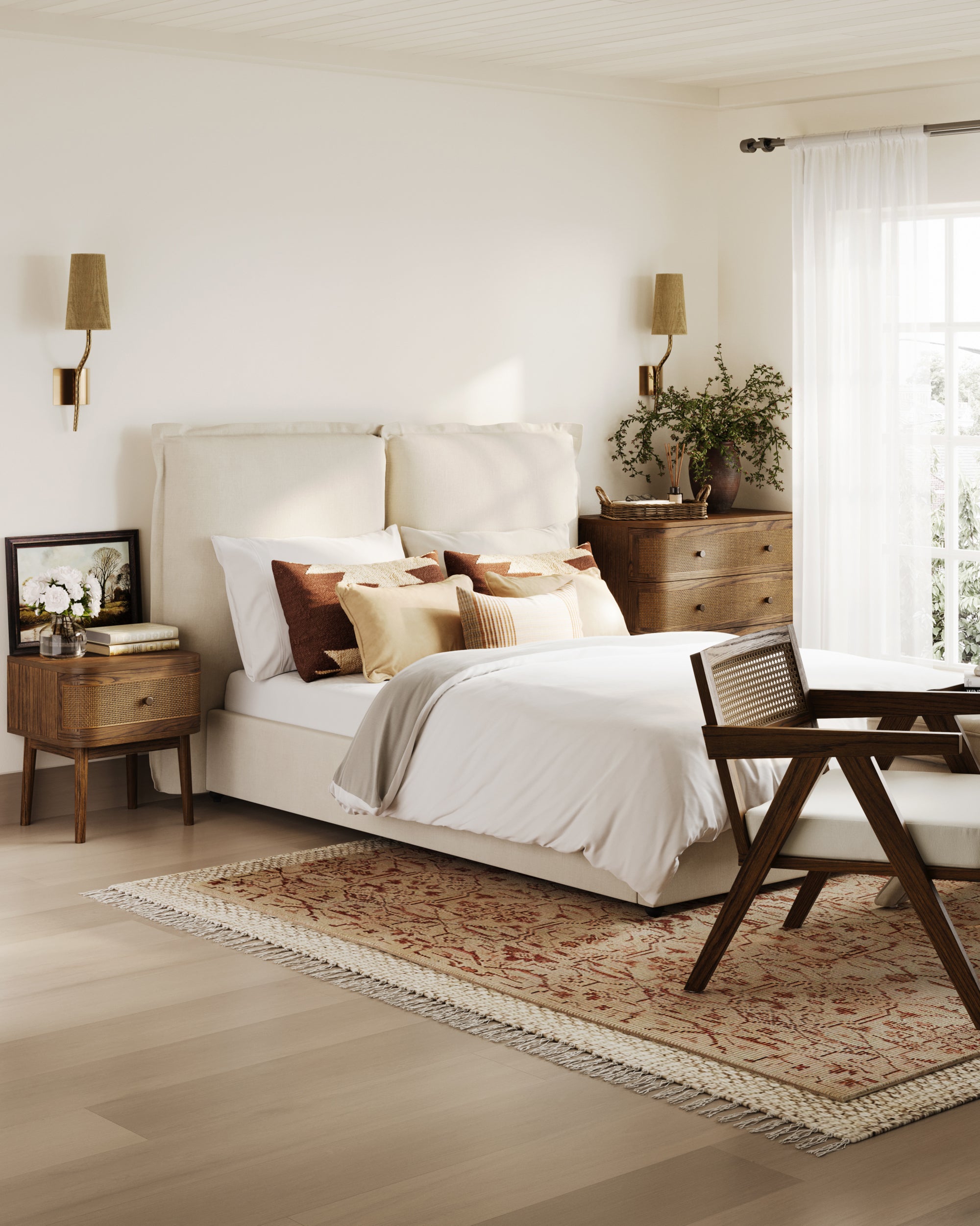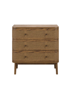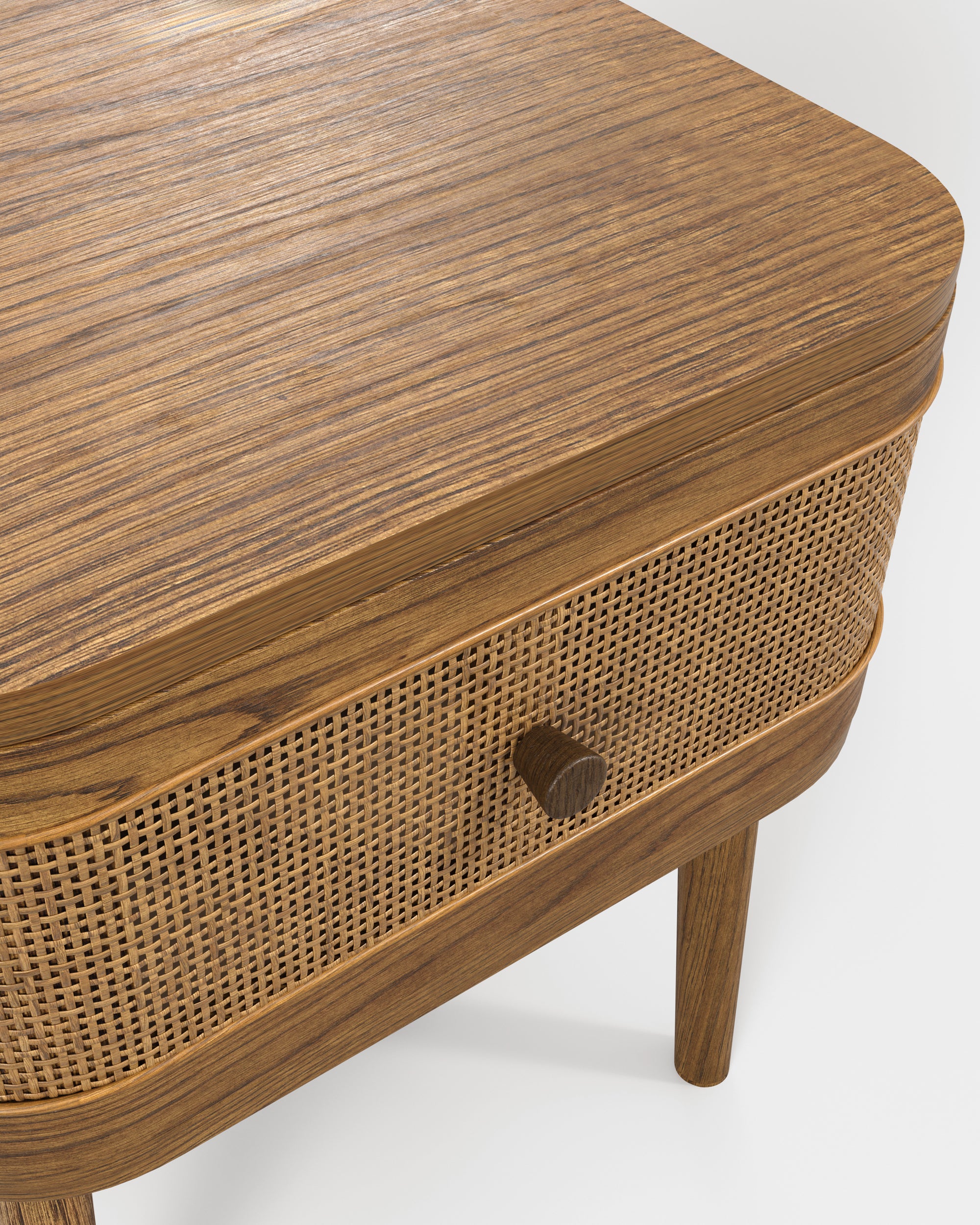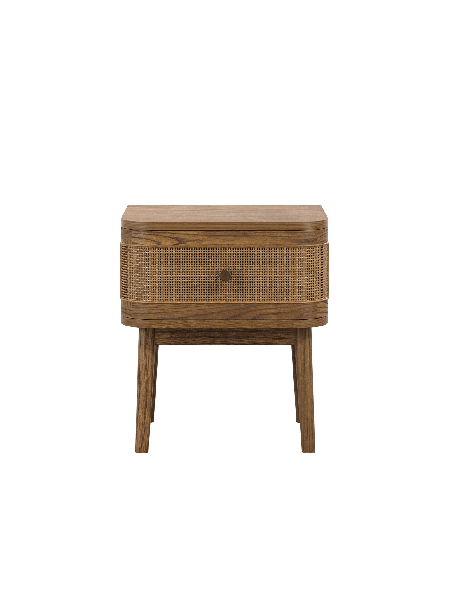 The Huxton bedside table showcases a single drawer with smoked wooden framework and a fashionable woven front, providing a mix of textures and sophistication for your bedside area.