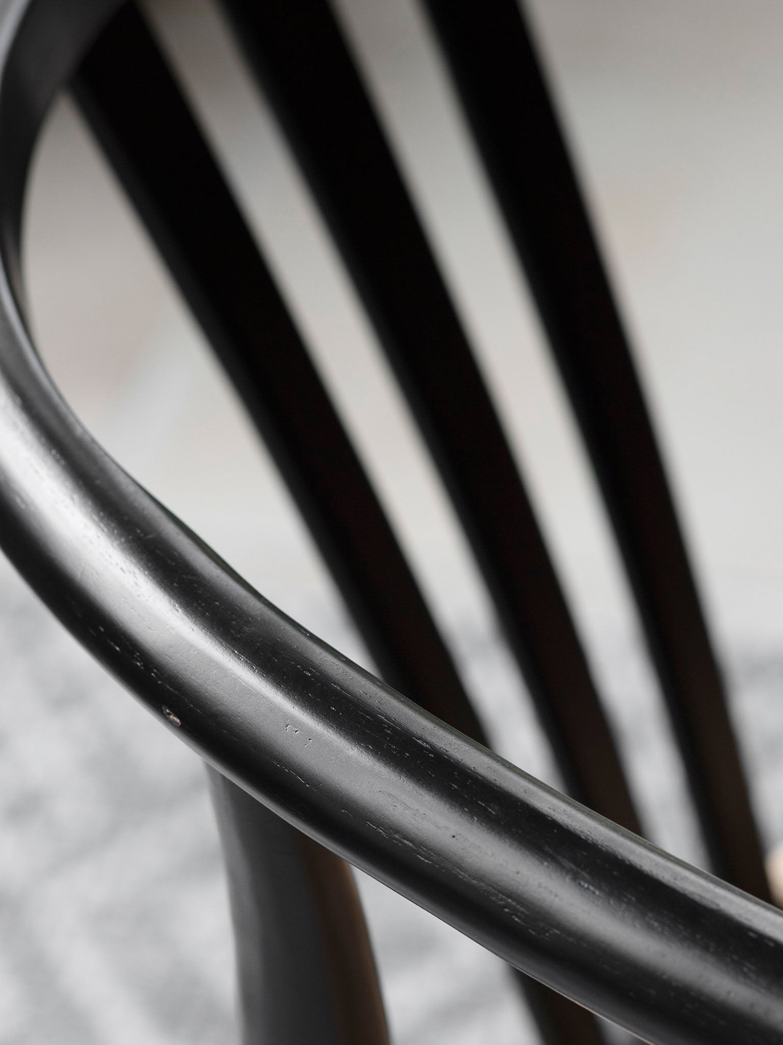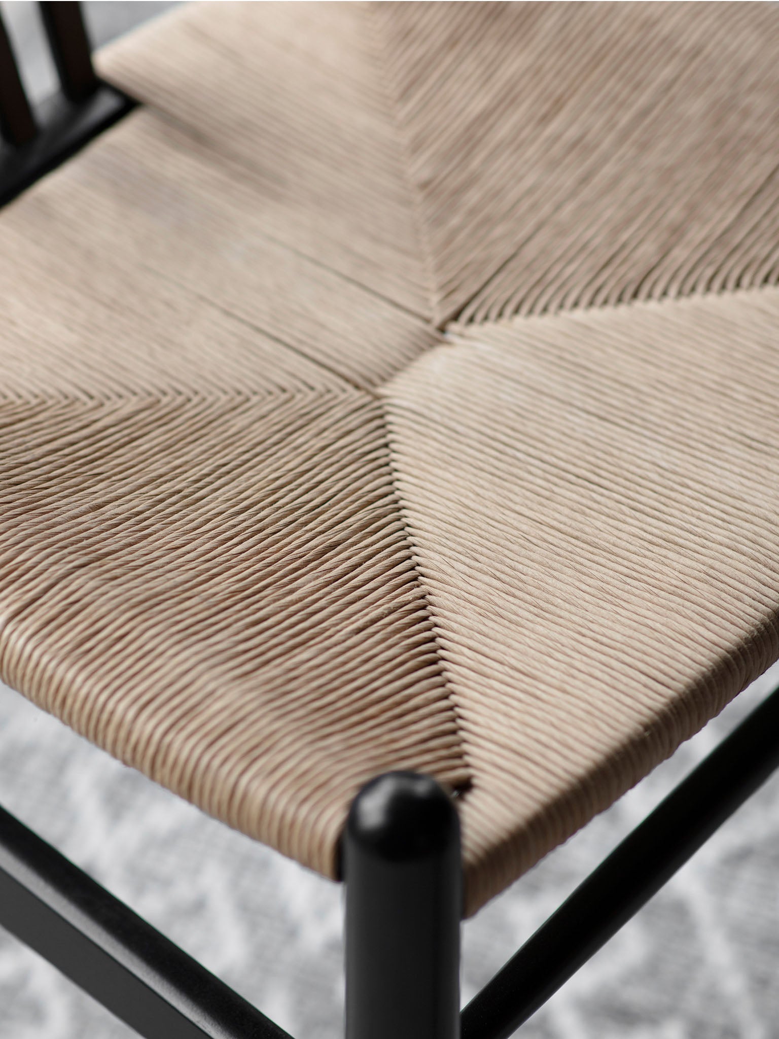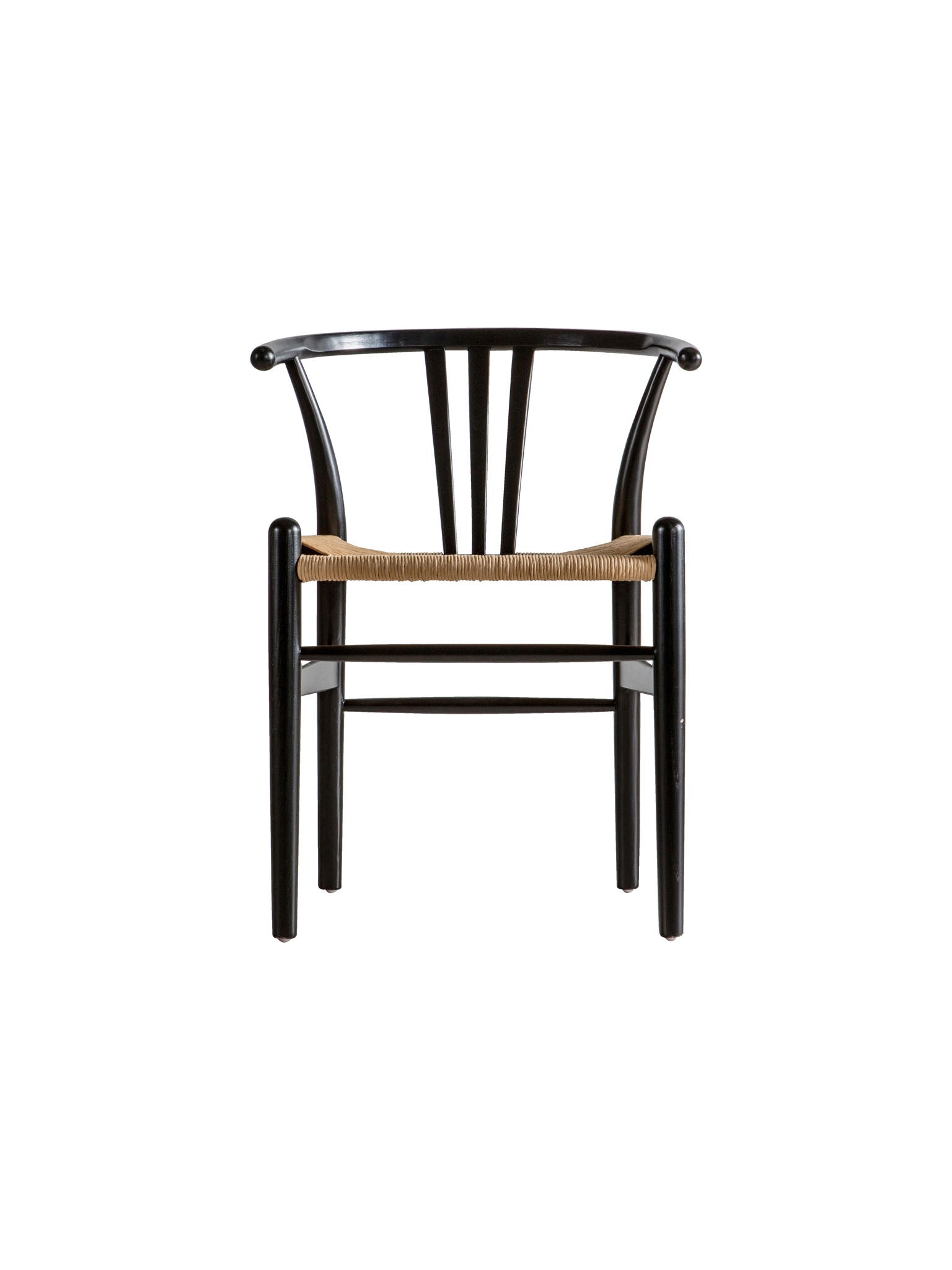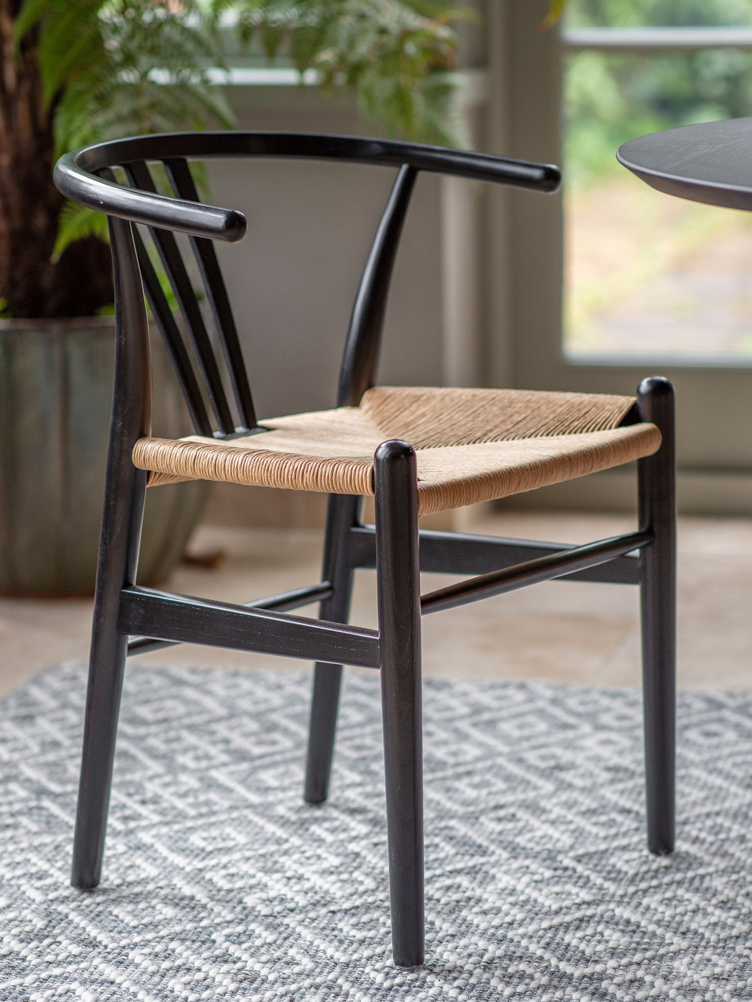 Set of 2 stylish dining chairs perfectly designed to suit both modern and vintage influenced interiors alike. With bold black stained wood, distinctive wishbone backs and hand woven seats, these chairs will make a stand out style statement wherever they're used.