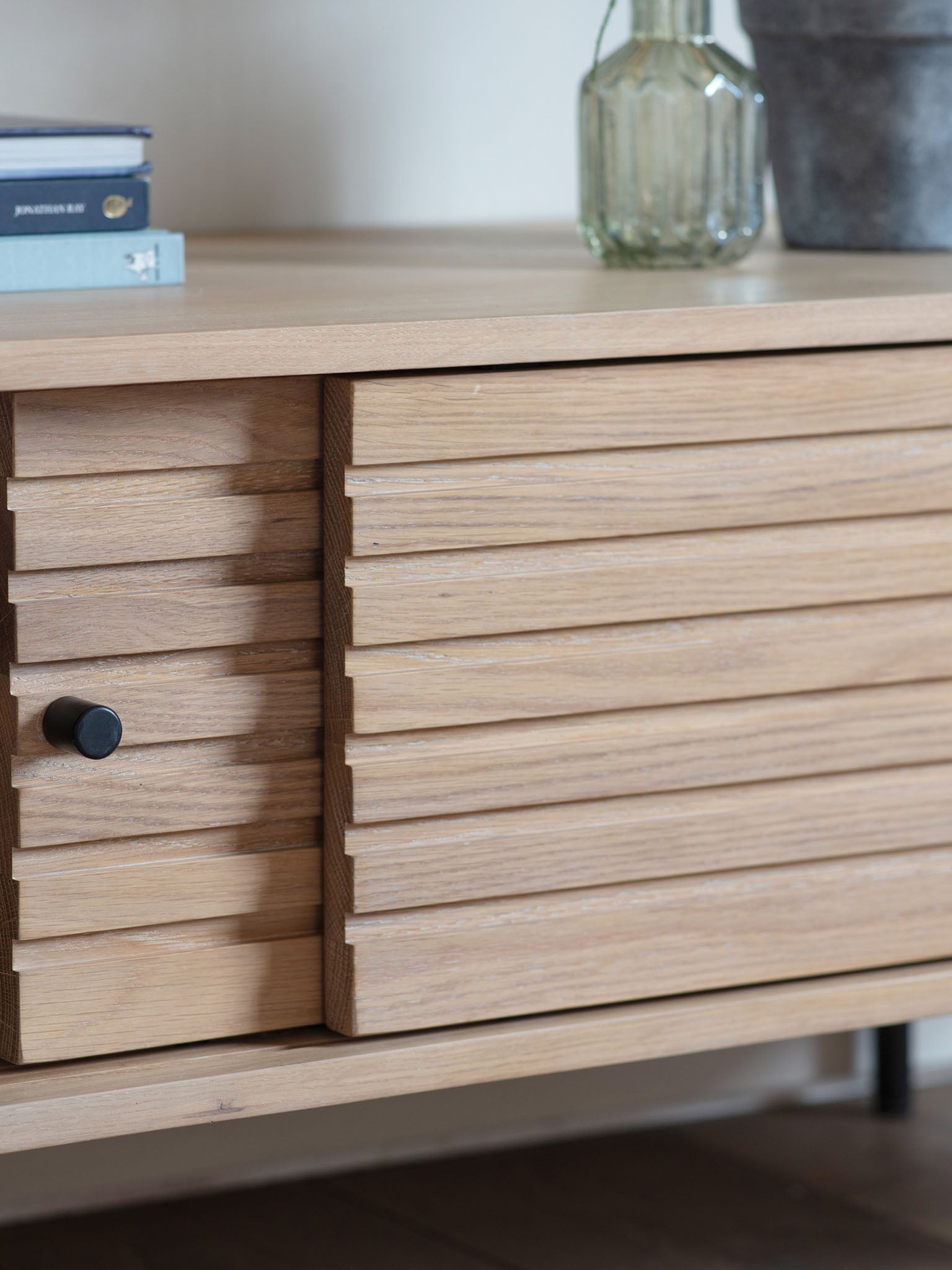 The Okinawa Media Unit features sliding doors crafted from solid oak with routing detailing to echo the slats of other pieces in the range. Black metal legs and handles add the finishing touch.