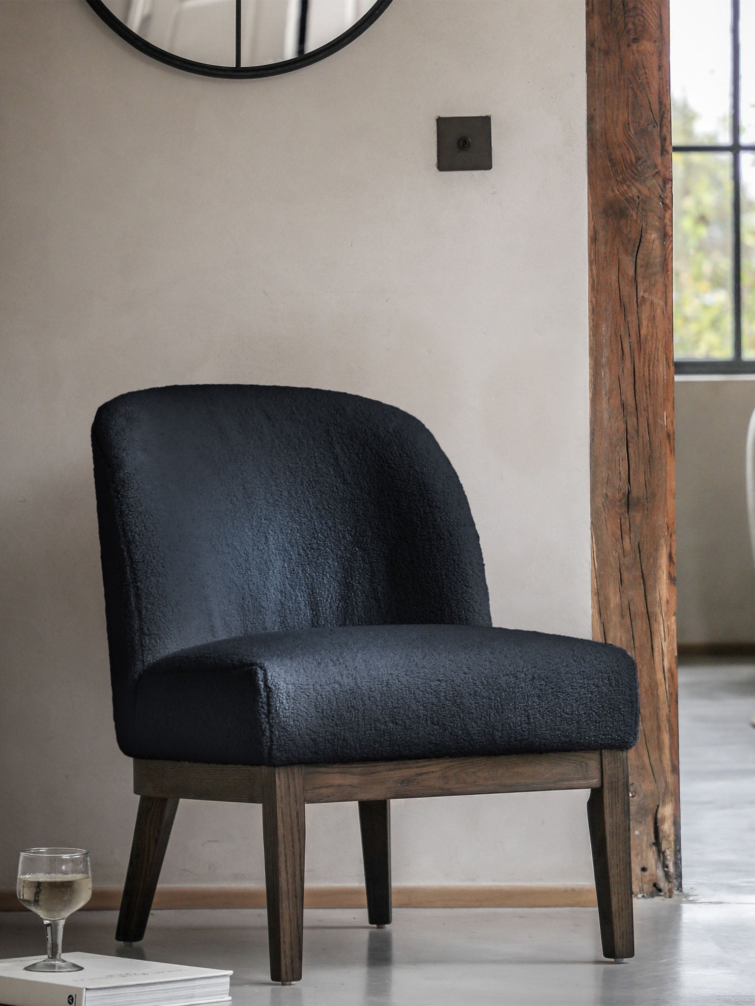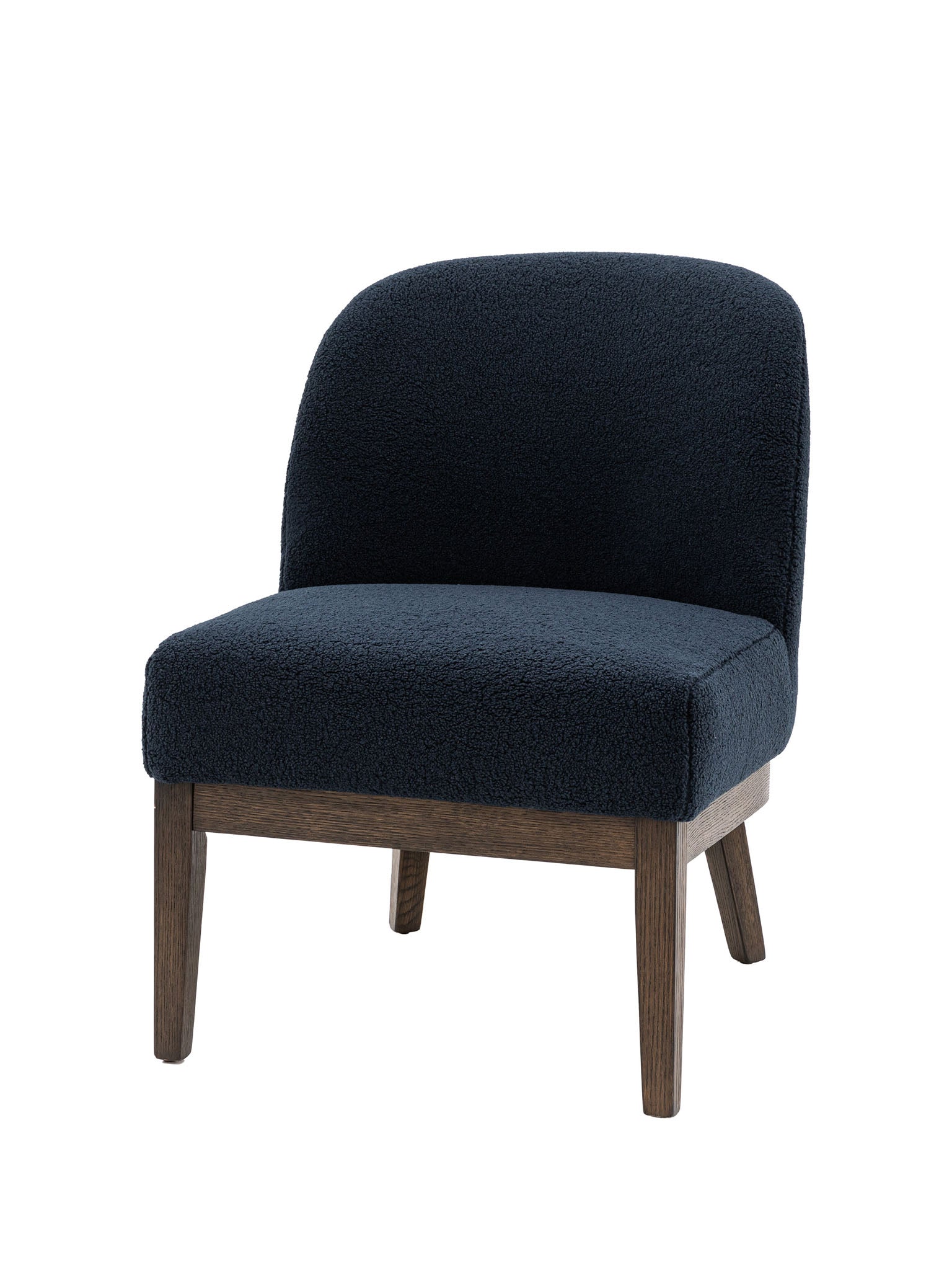 This lovely occasional chair would look at home in a wide range of interiors. The seat and gently curved back are upholstered in a beautiful navy fabric which pairs perfectly with the wooden underframe and legs.
