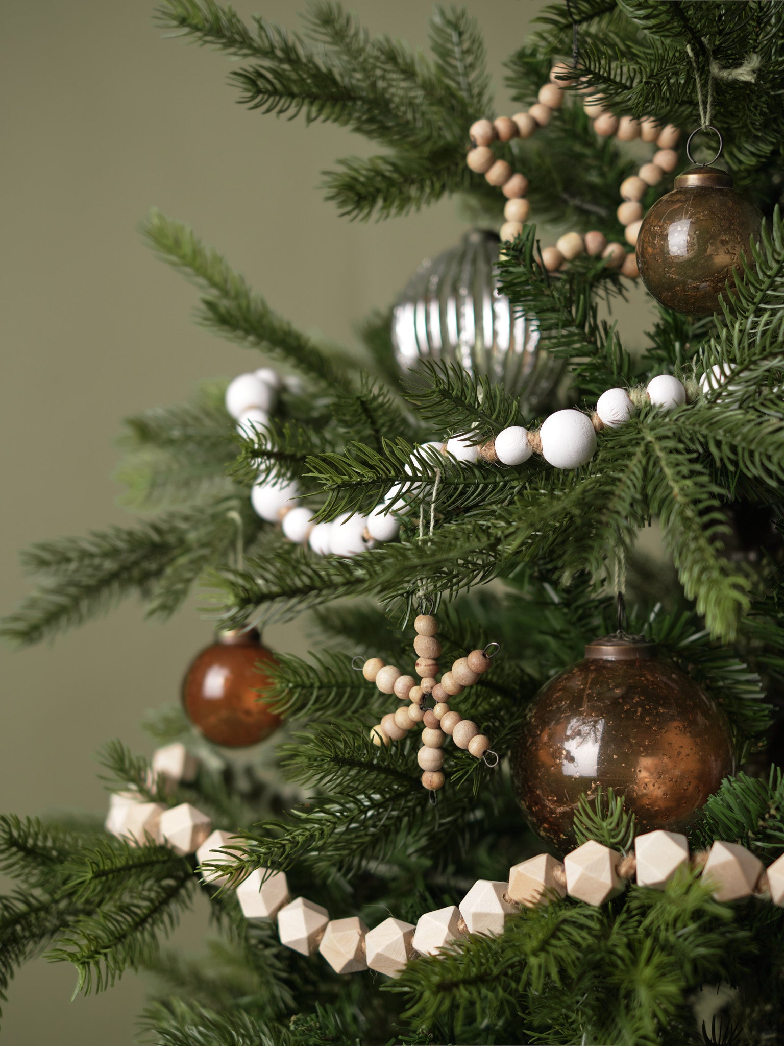 Wooden beaded garland available in two lengths, each bead is faceted in an a hexagonal shape.