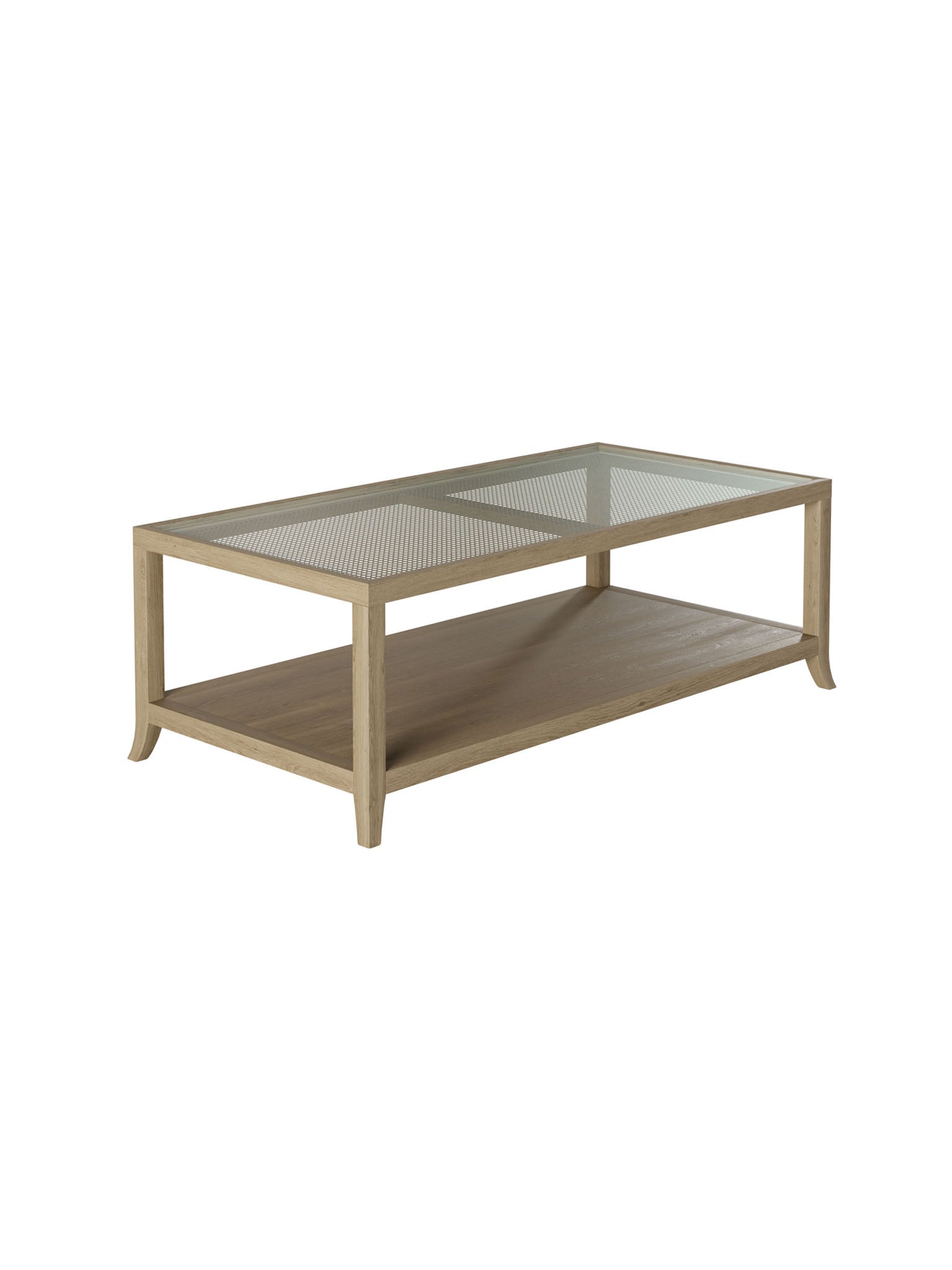 Haven coffee table, grey aged oak and oak veneer, glass top sitting on rattan latticed underside, tapered legs, glass top and underneath shelf.