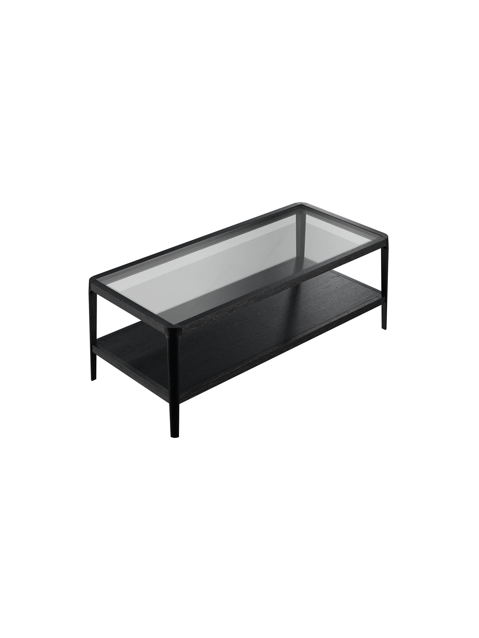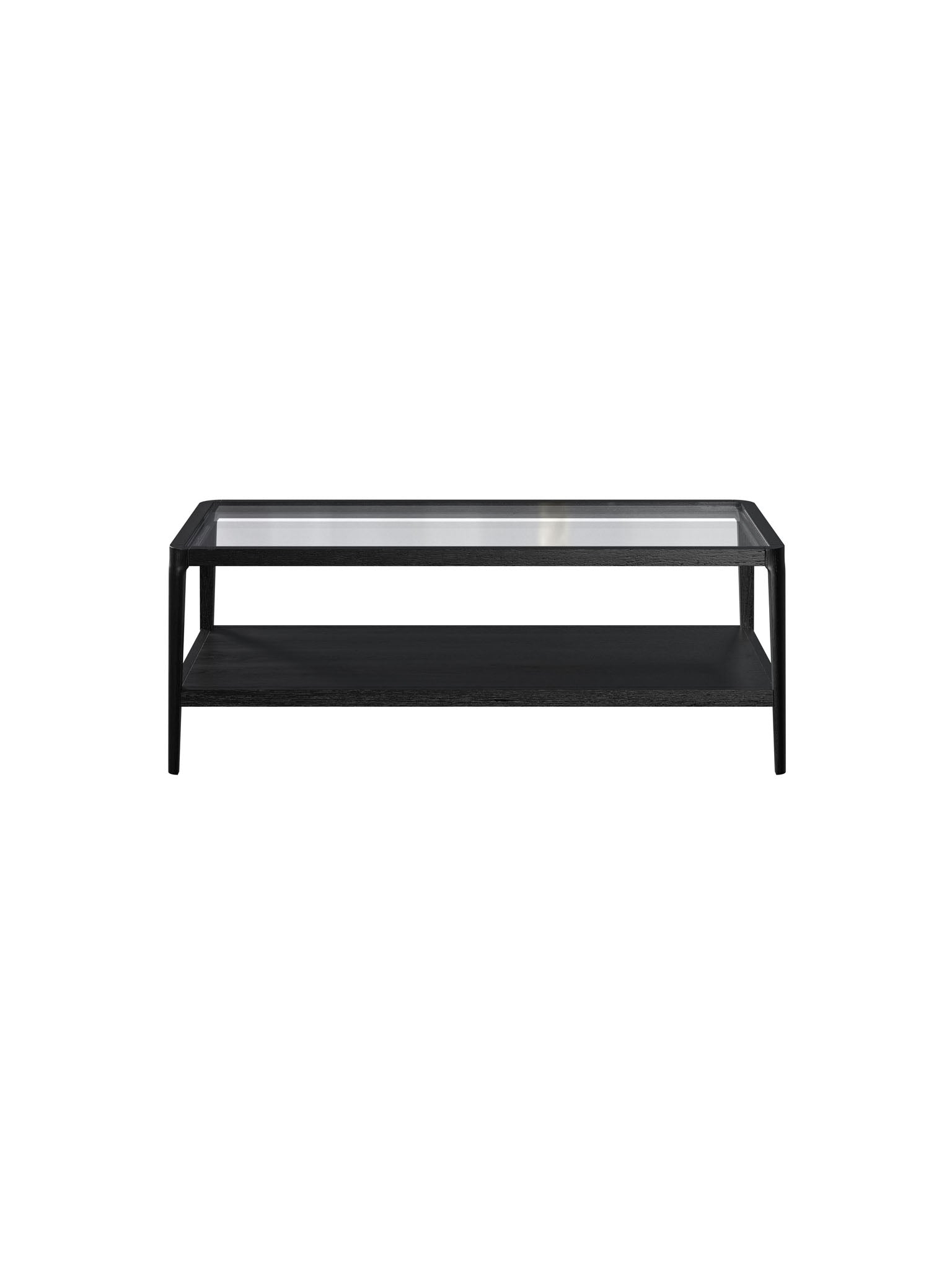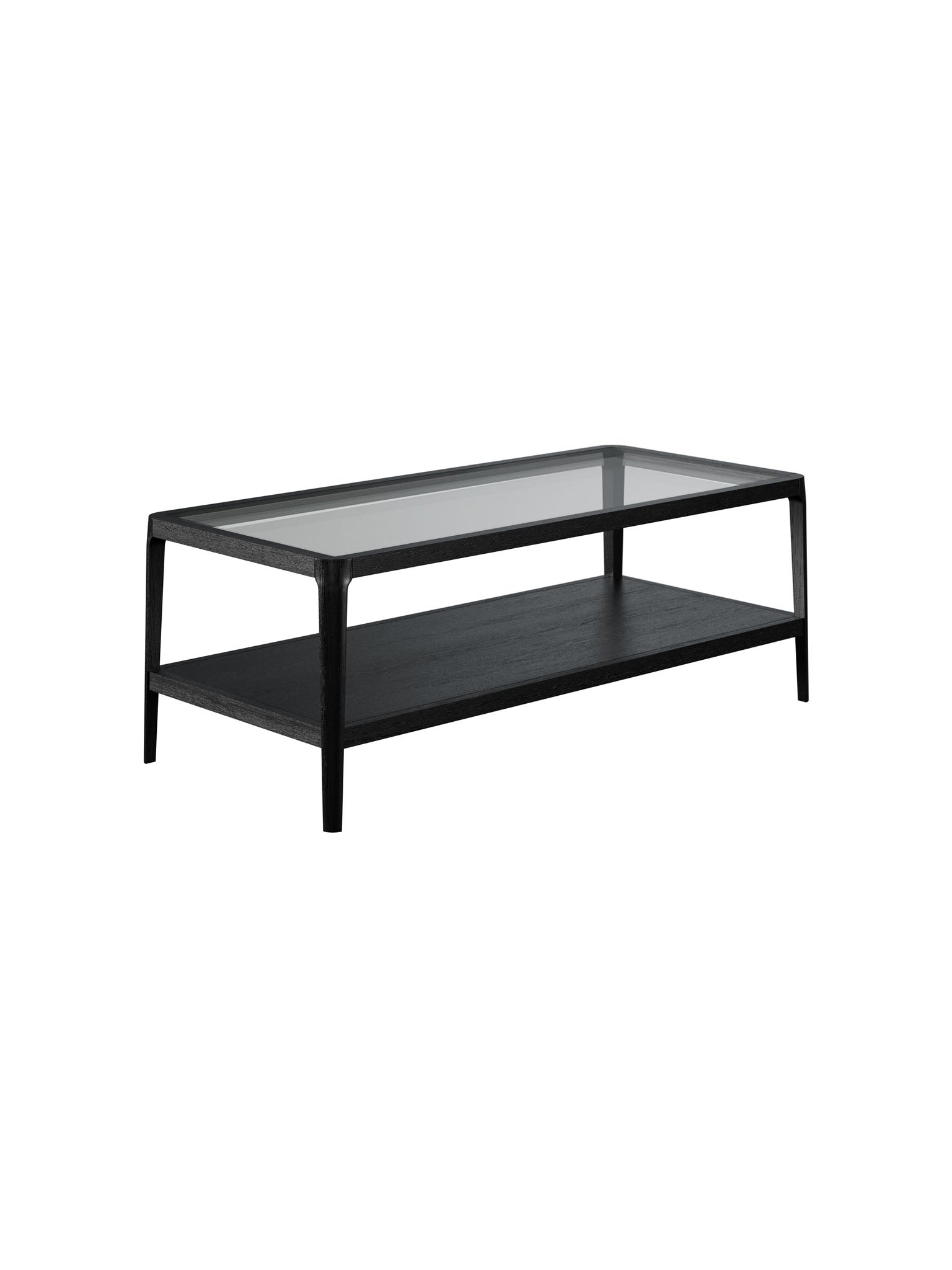 Black coffee table in dark stained solid oak and oak veneer, glass top, curved edges and legs, cut lines, visible grain, shelf.