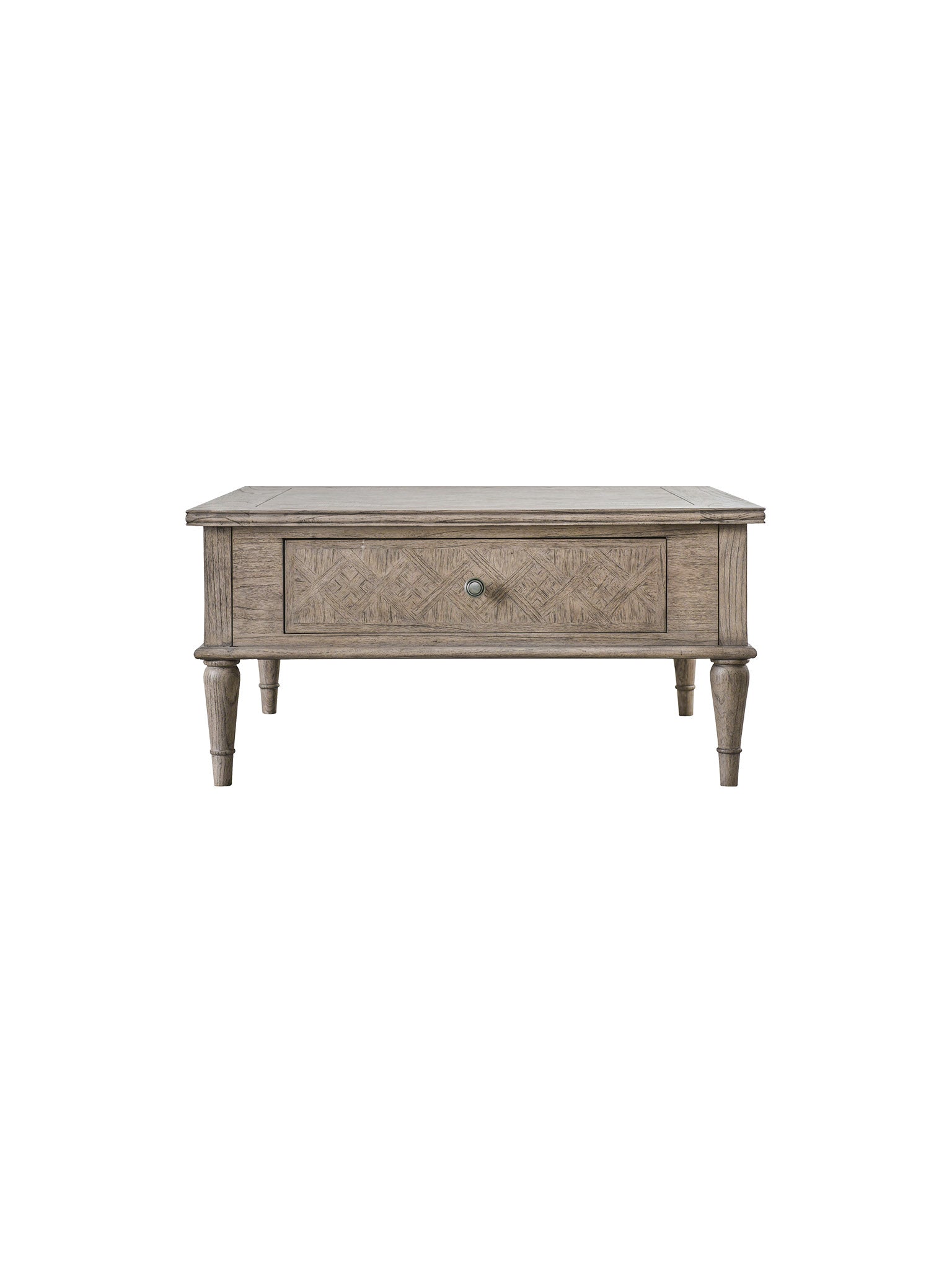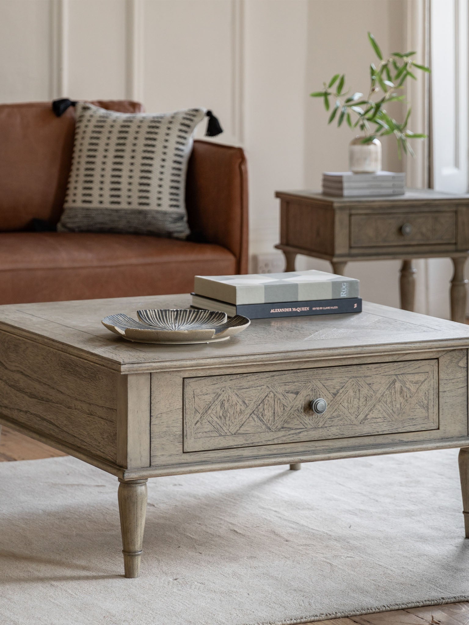 Crafted from Mindy wood with a beautiful inlaid parquet-style design, this square coffee table adds both practicality and style to your living room. With two drawers for organization and elegant turned legs, it offers a versatile and sophisticated touch to any interior.