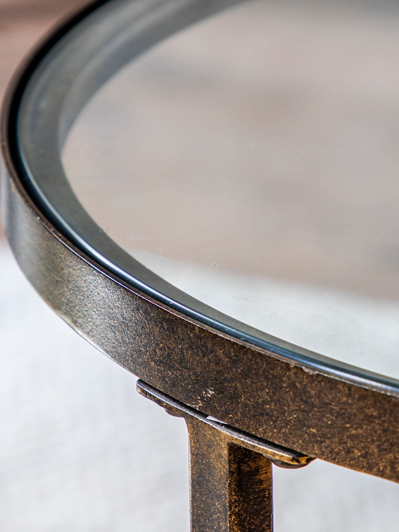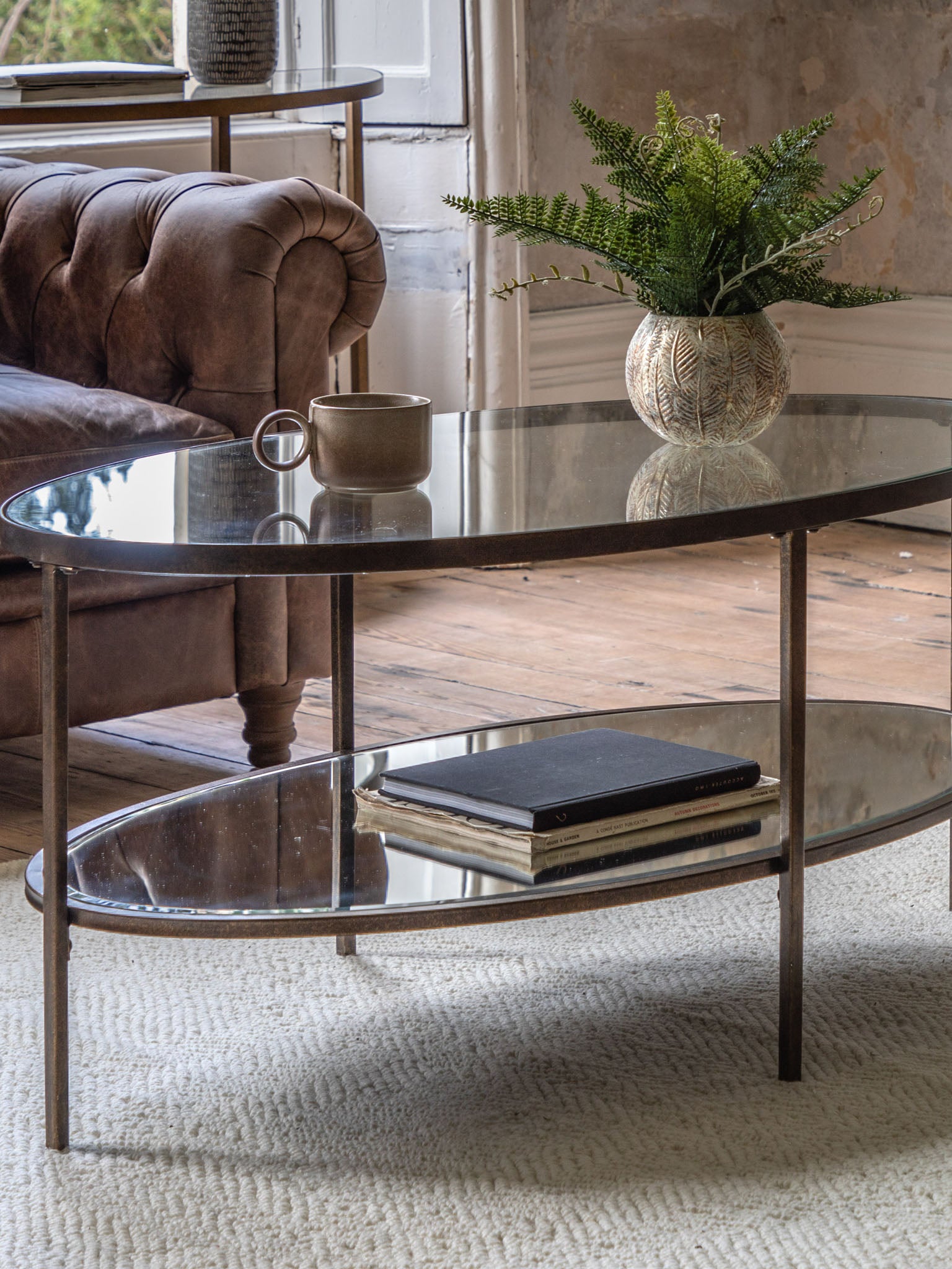 Stunning oval metal coffee table in an aged bronze finish with inlaid, tempered glass top and mirrored shelf.  Some assembly required.