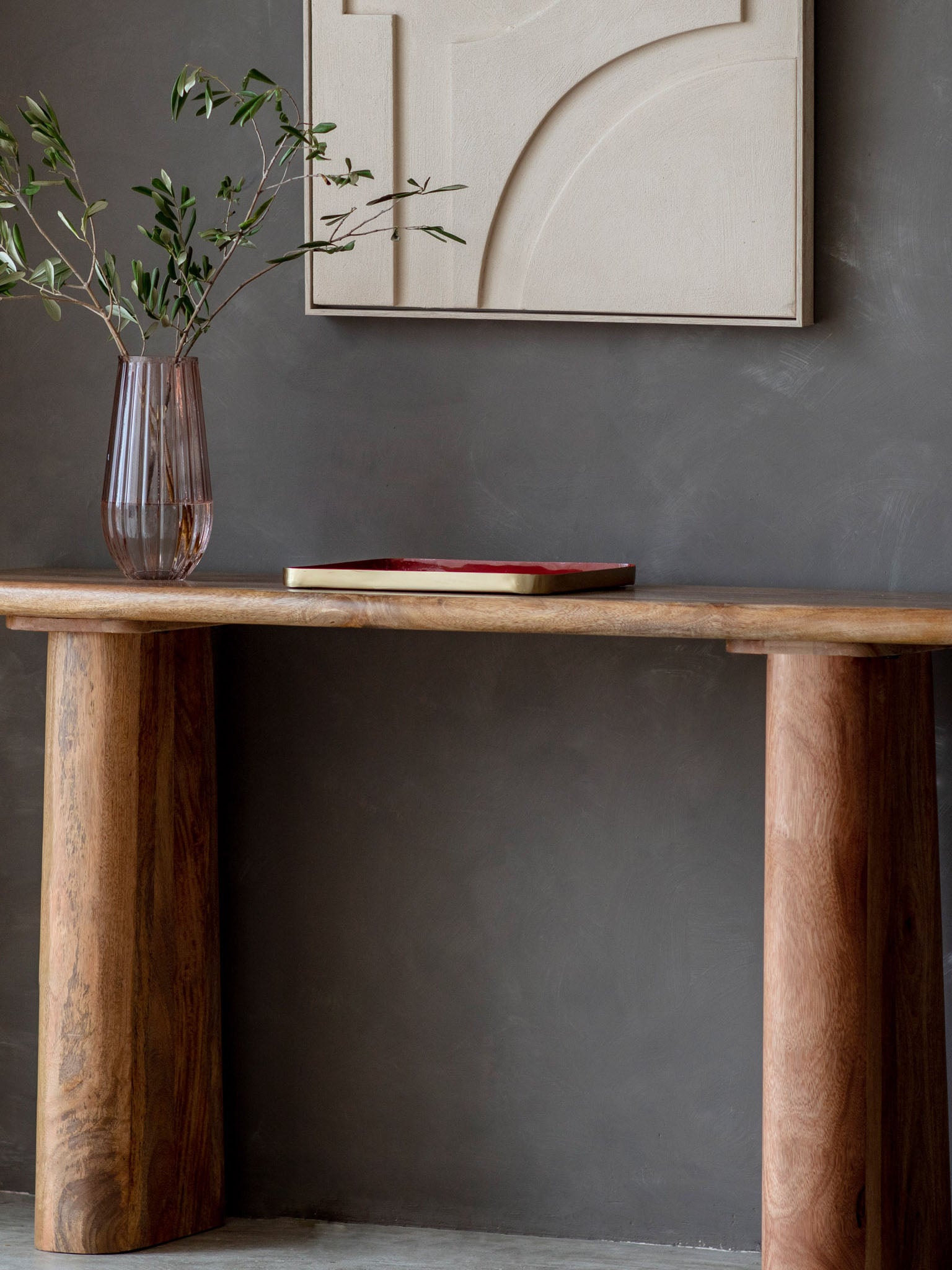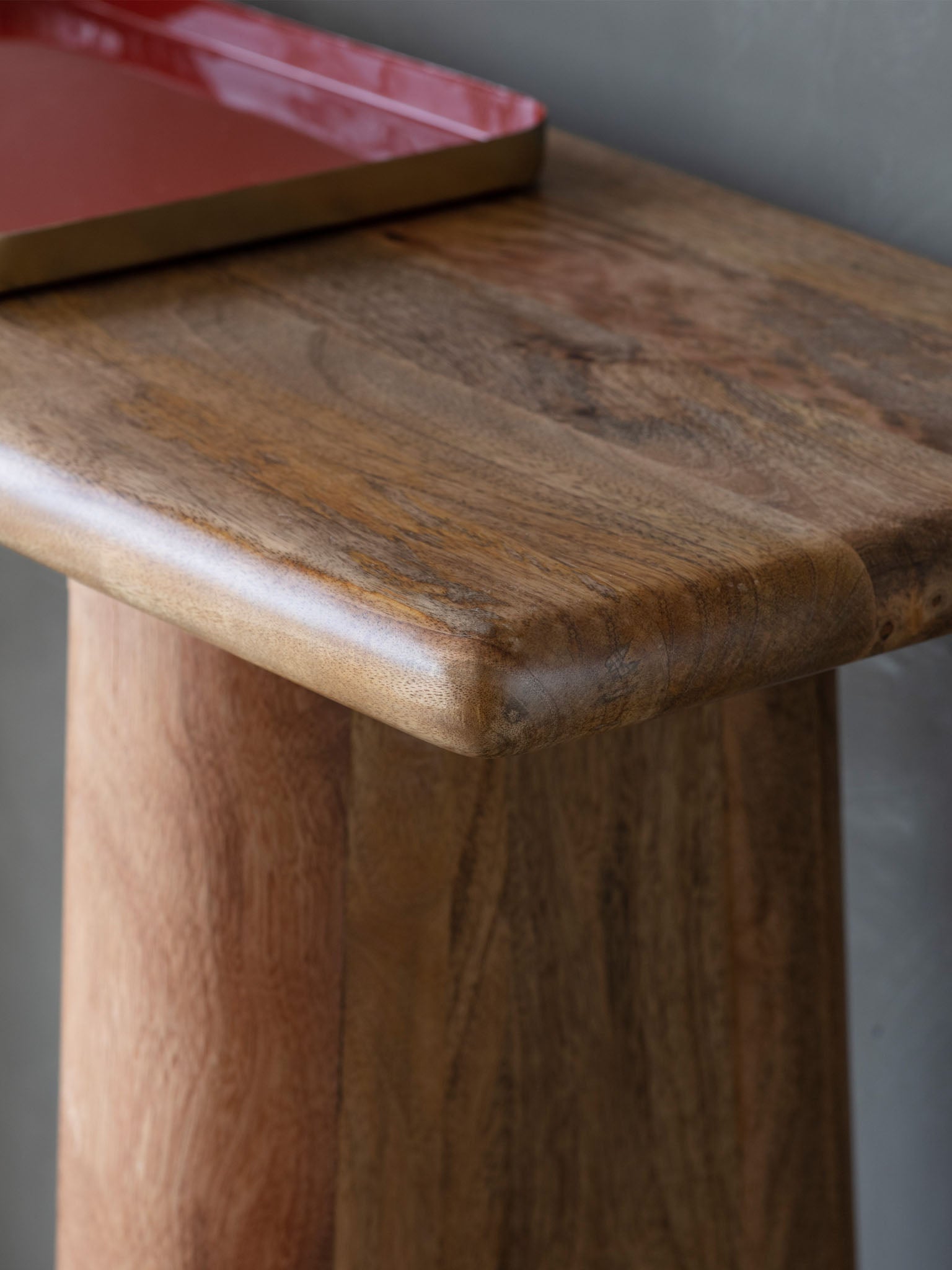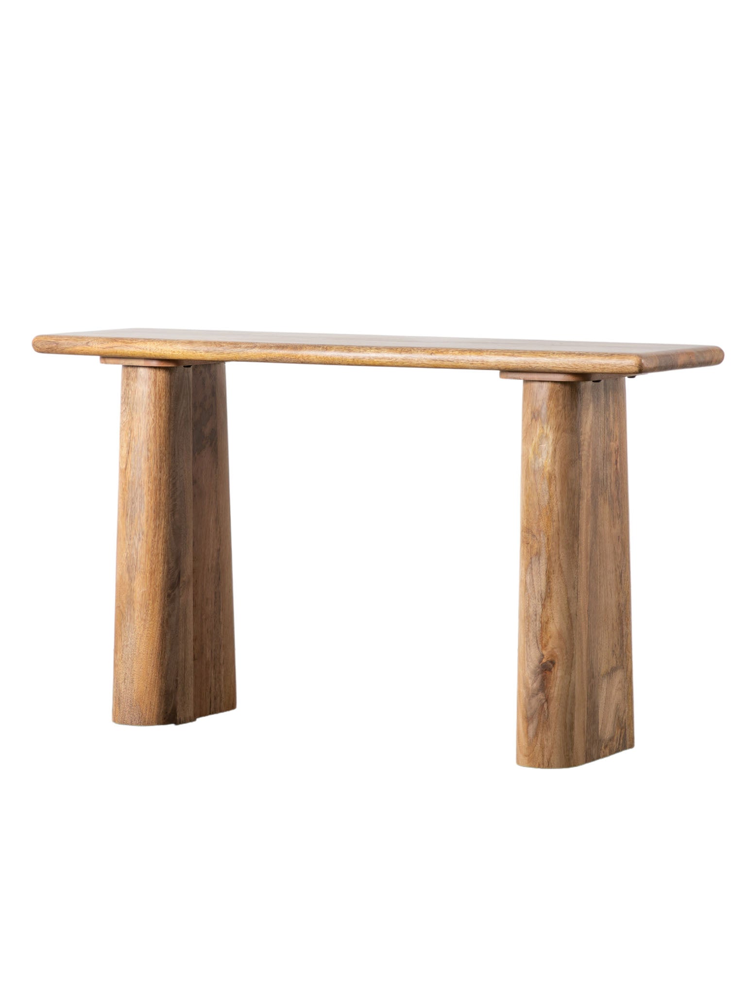 Unusual console table featuring chunky legs and top, with soft flowing curves which soften the look, to create a beautiful sturdy piece. It is crafted from solid mango wood with a natural finish to show the stunning grain of the timber. A coffee and side table are also available