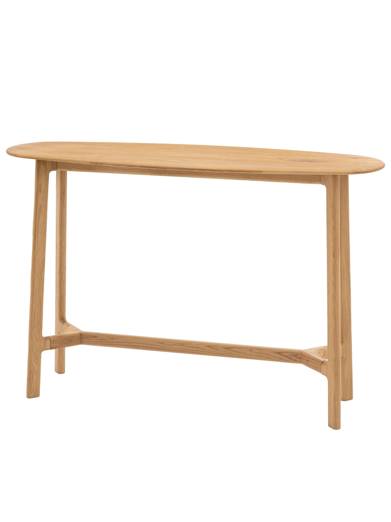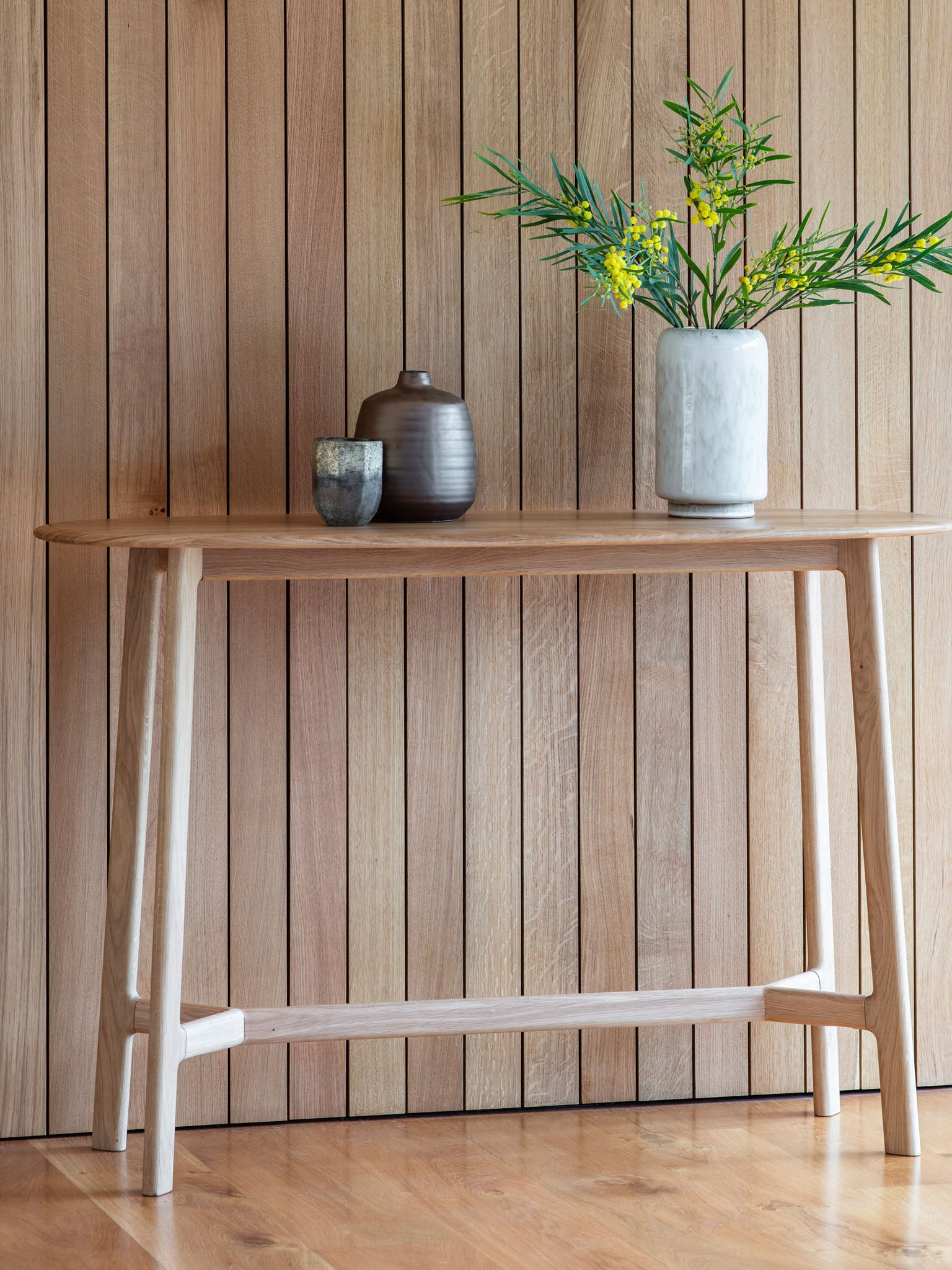 A small oak console with four elegant legs and a rounded top. Fresh clean lines with an uncomplicated design inspired by mid century furniture.
