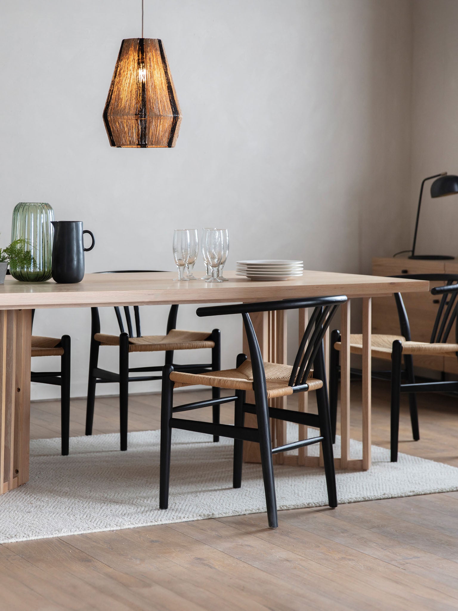 The Okayama Dining Table features solid oak slatted legs in a double chevron layout, to create an eye-catching and unusual design feature.