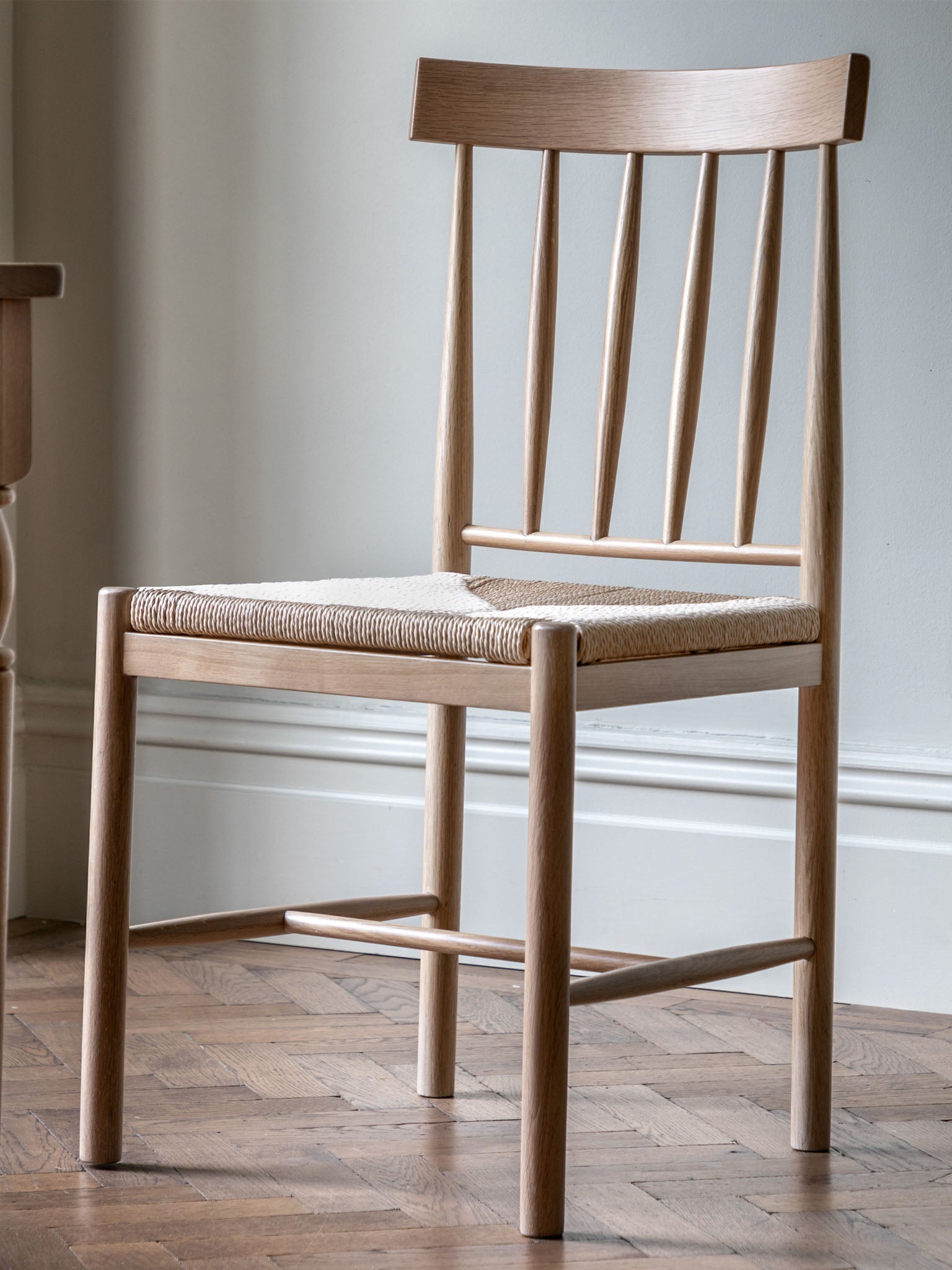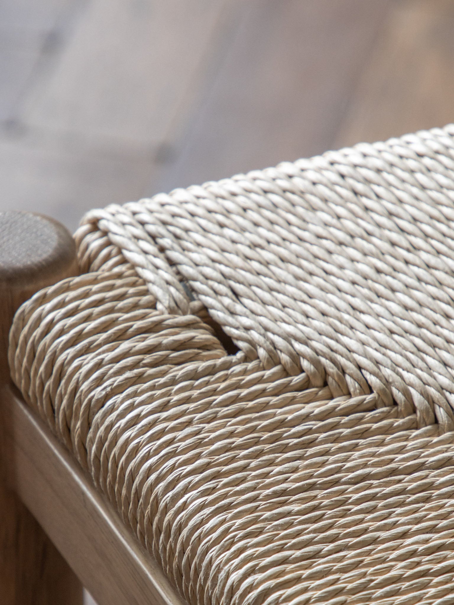 Natural wood and rope dining chairs