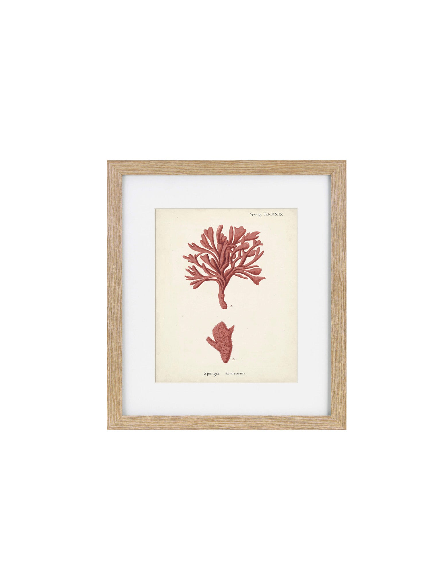 This elegant Antique Pink Coral Framed Art Print IV features a vintage depiction of pink coral, expertly preserved within a narrow oak frame and complemented by a white mount.