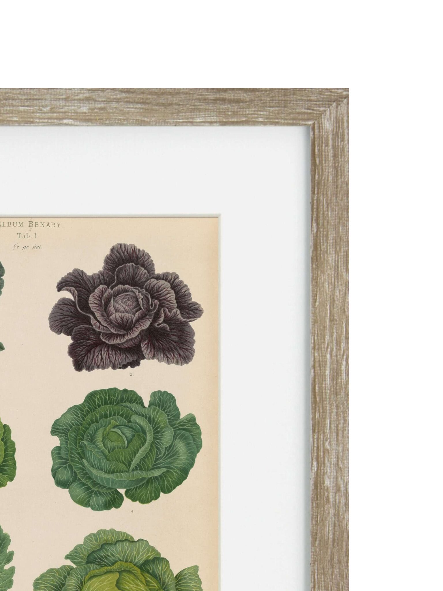 Elevate your kitchen or dining space with this charming Vintage Veg III Framed Art Print, a timeless celebration of culinary heritage. The piece features a beautifully rendered vintage illustration of cabbages, capturing the artisanal quality of classic botanical and produce artwork. Housed in a refined narrow brown frame with a crisp white mount, the design strikes an elegant balance between rustic charm and contemporary sophistication.