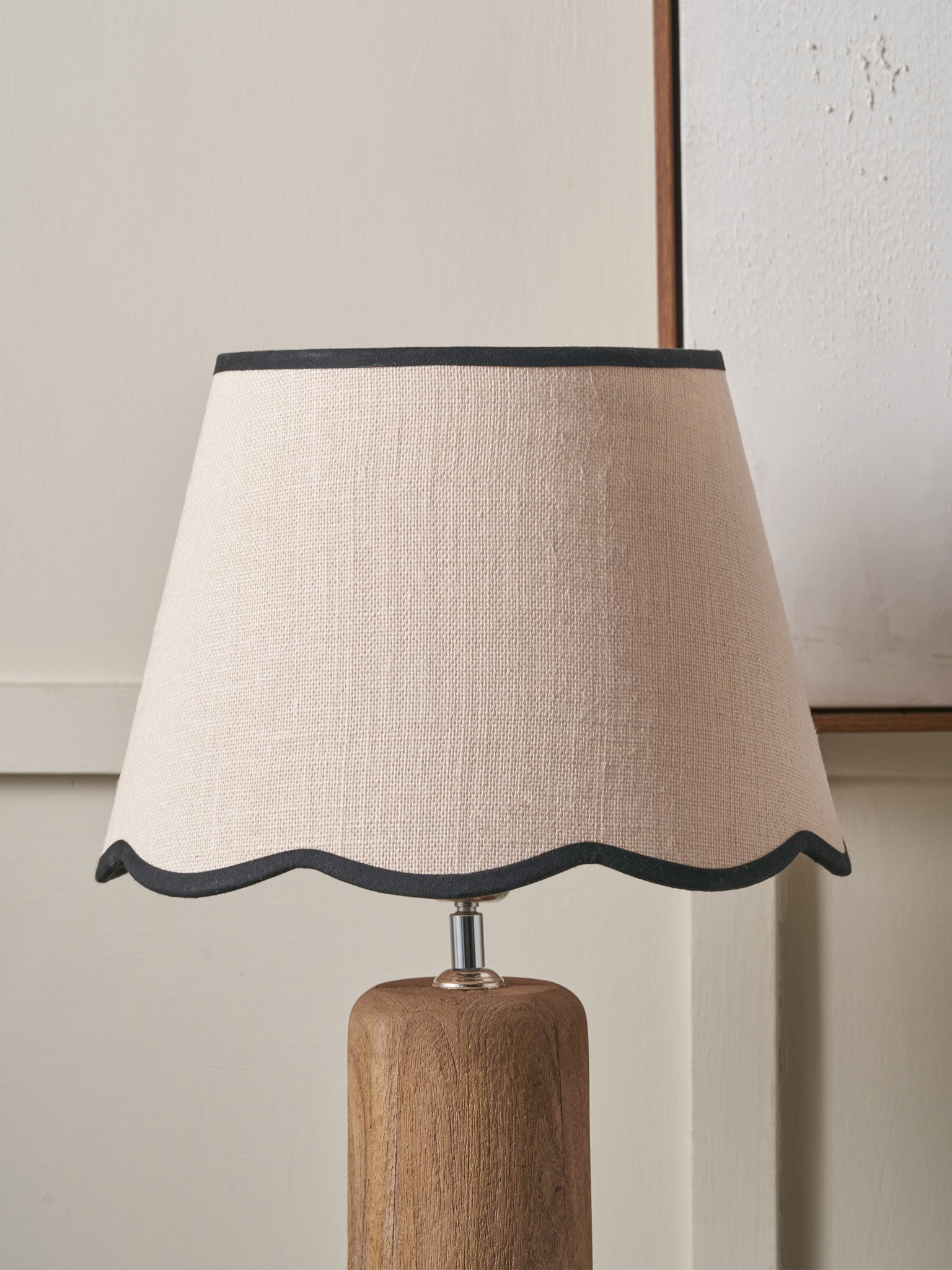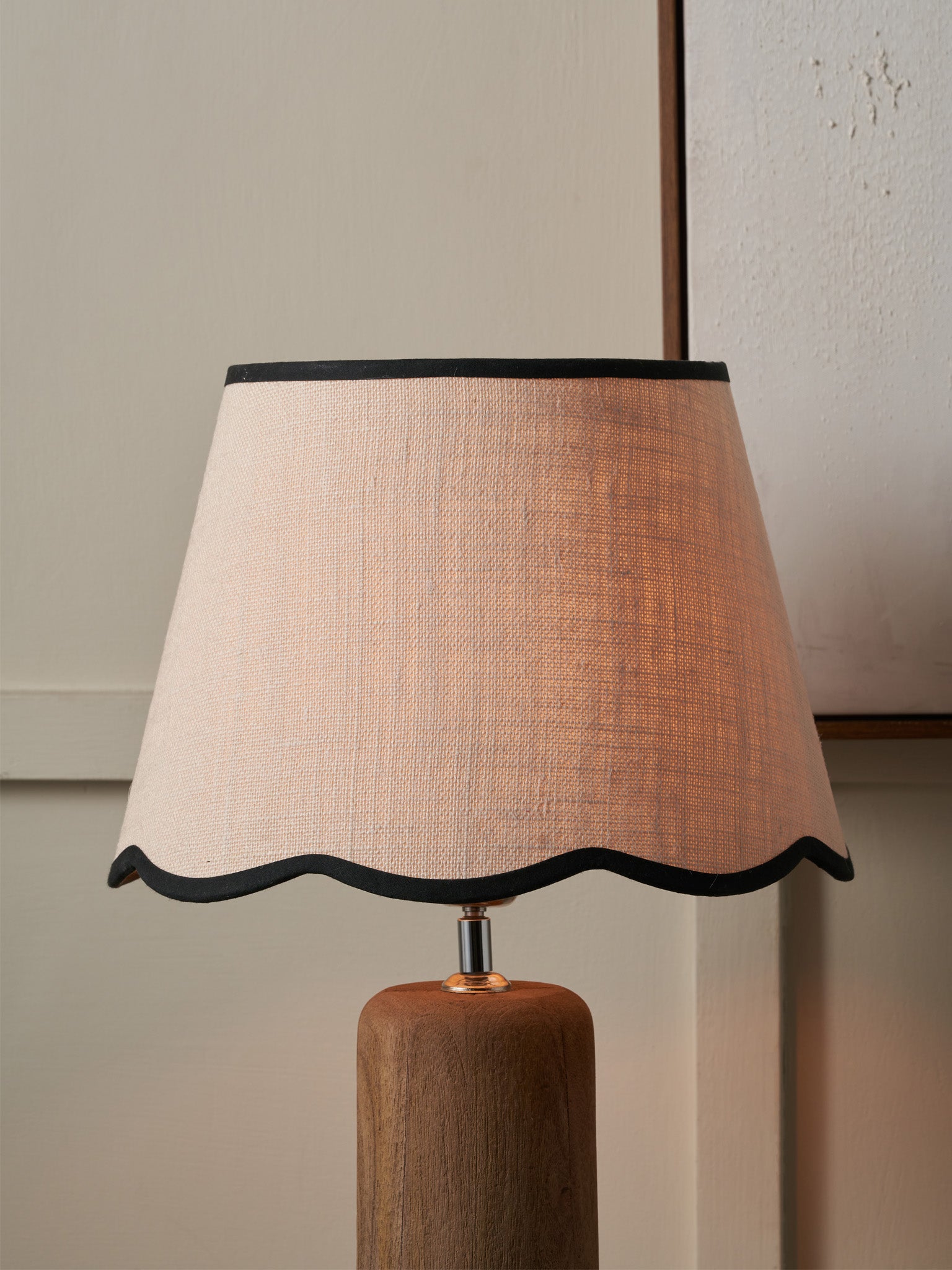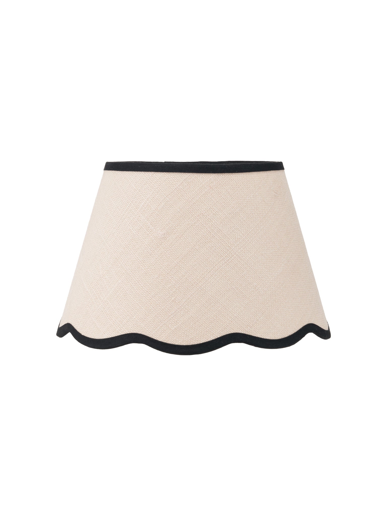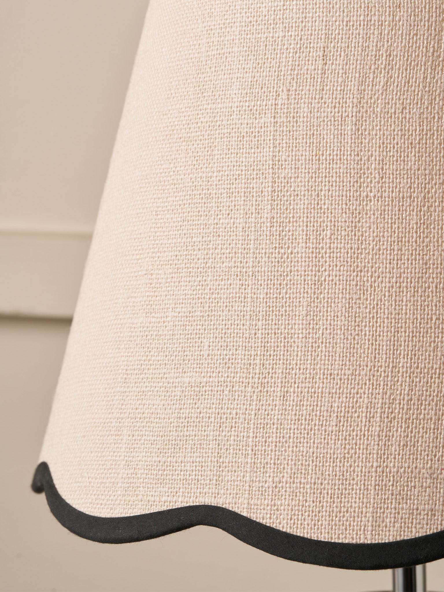 The Camilla  lampshade is a beautifully crafted cream jute tapered lampshade with a scalloped edge. Its elegant silhouette and textured finish are further accentuated by a black contrast binding, creating a timeless look that draws the eye making it the perfect statement piece for any lamp base.