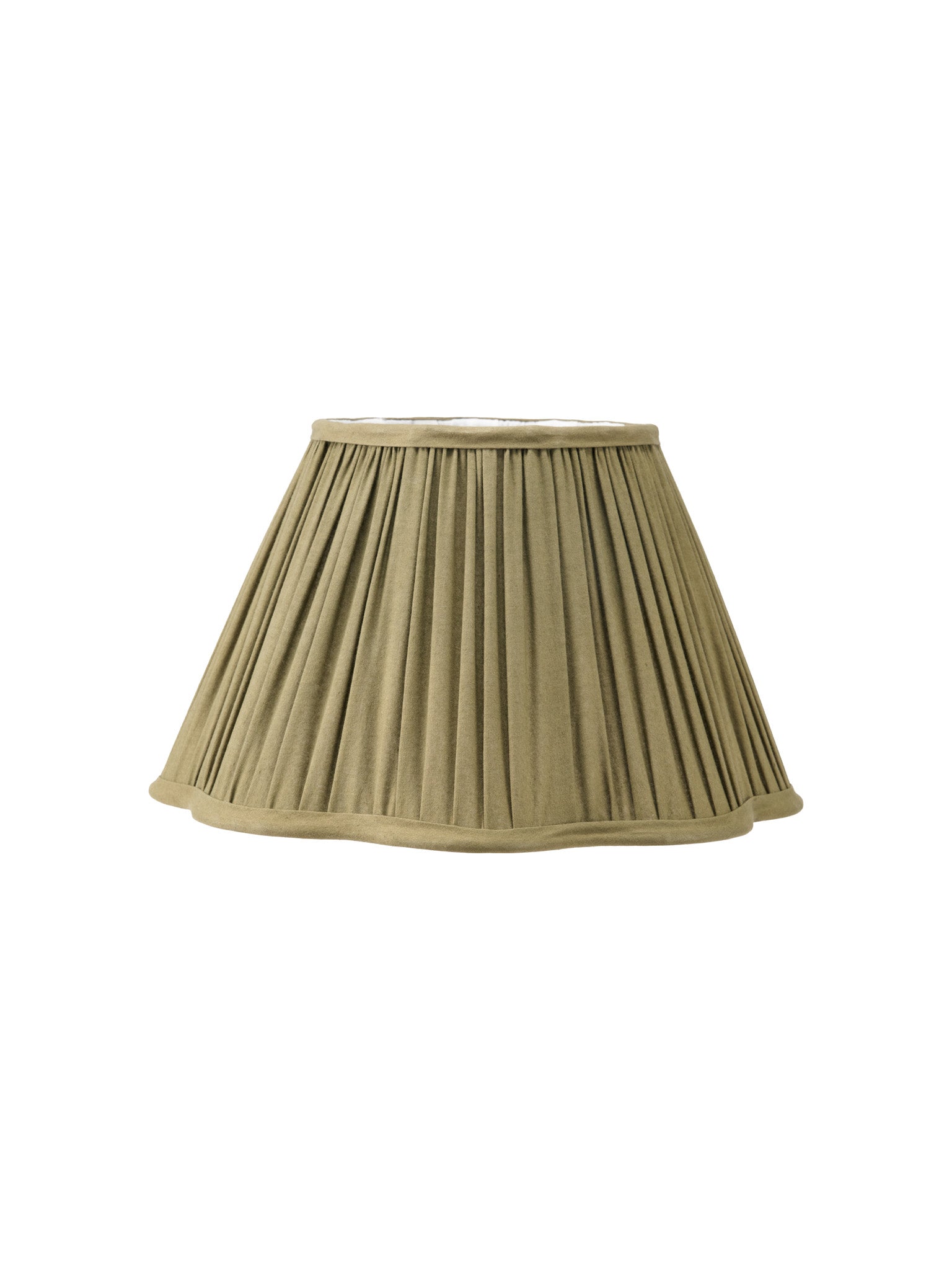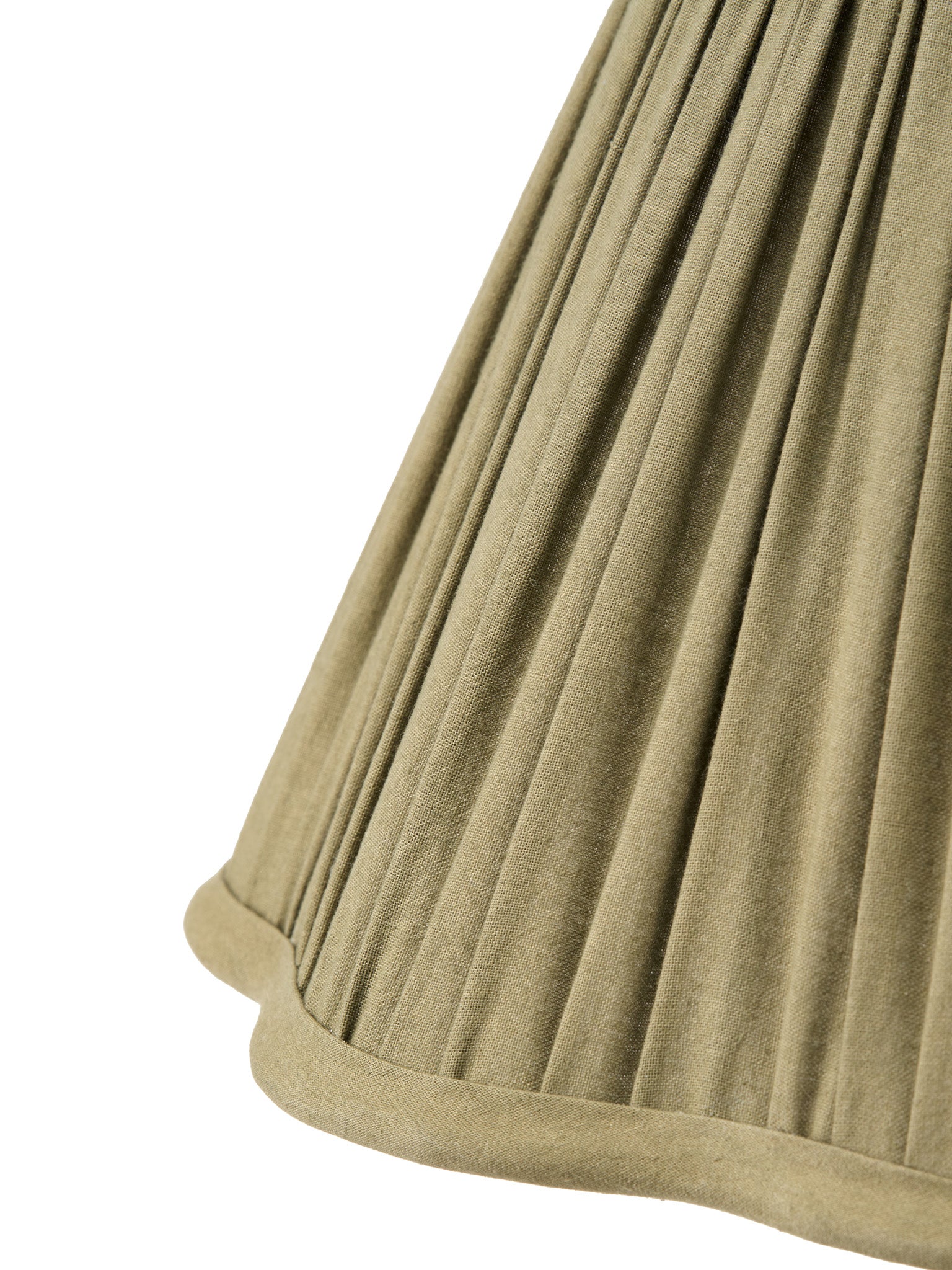 The Evelyn lampshade is a beautifully handcrafted pleated lampshade in a rich olive green finish with a scalloped edge and self-colour trim. Designed with a classic mushroom pleat, this elegant lampshade combines timeless design with modern versatility, making it a stunning statement piece for your home lighting.