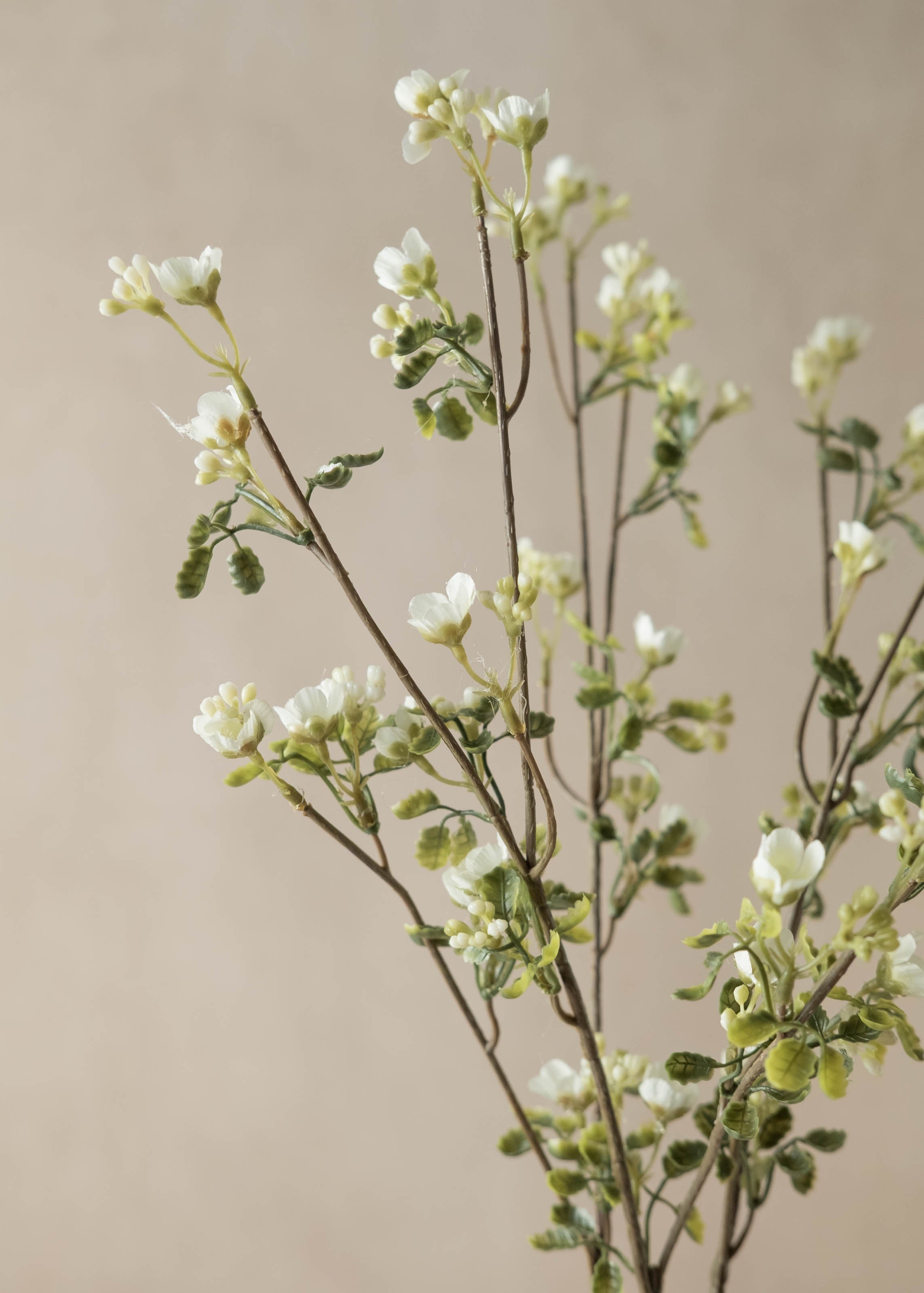 Set of three faux wax flower stems. Each stem features delicate white blooms that capture the botanical charm of fresh flowers without requiring maintenance.