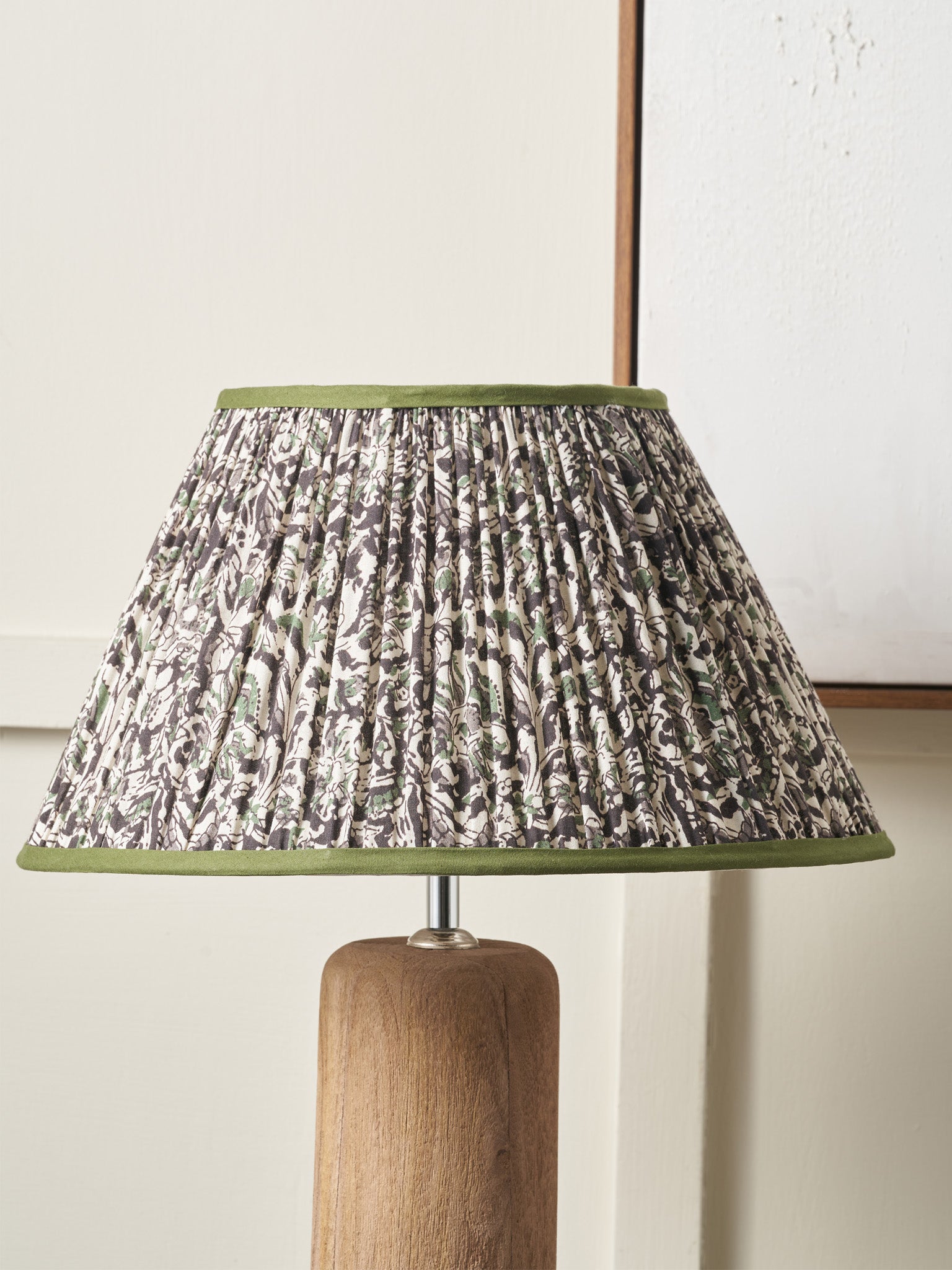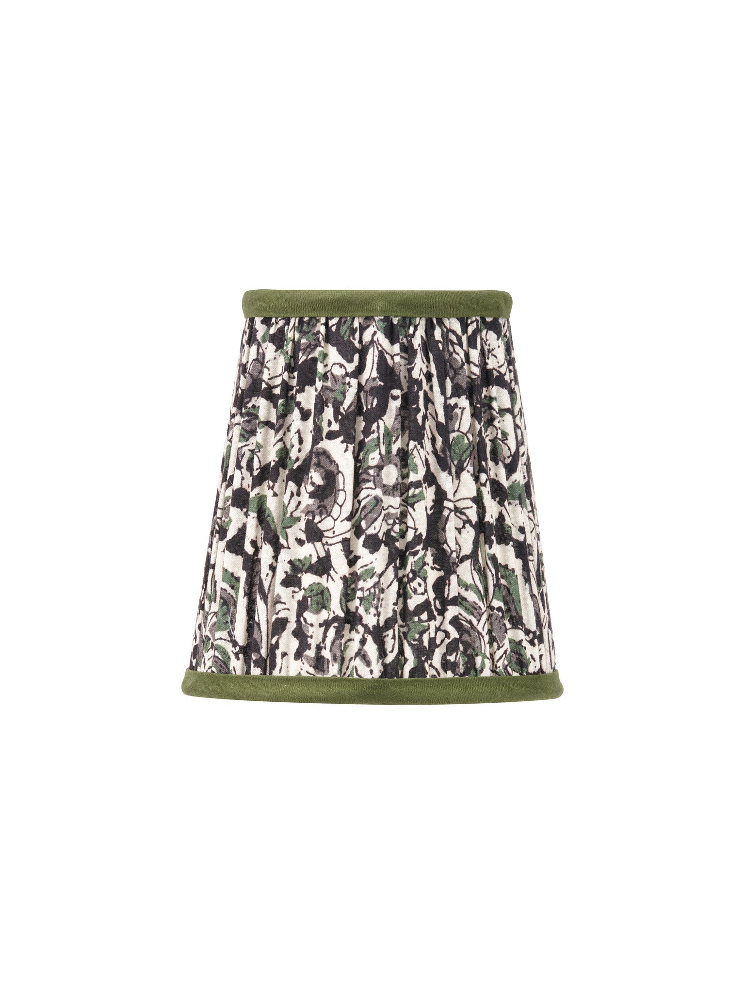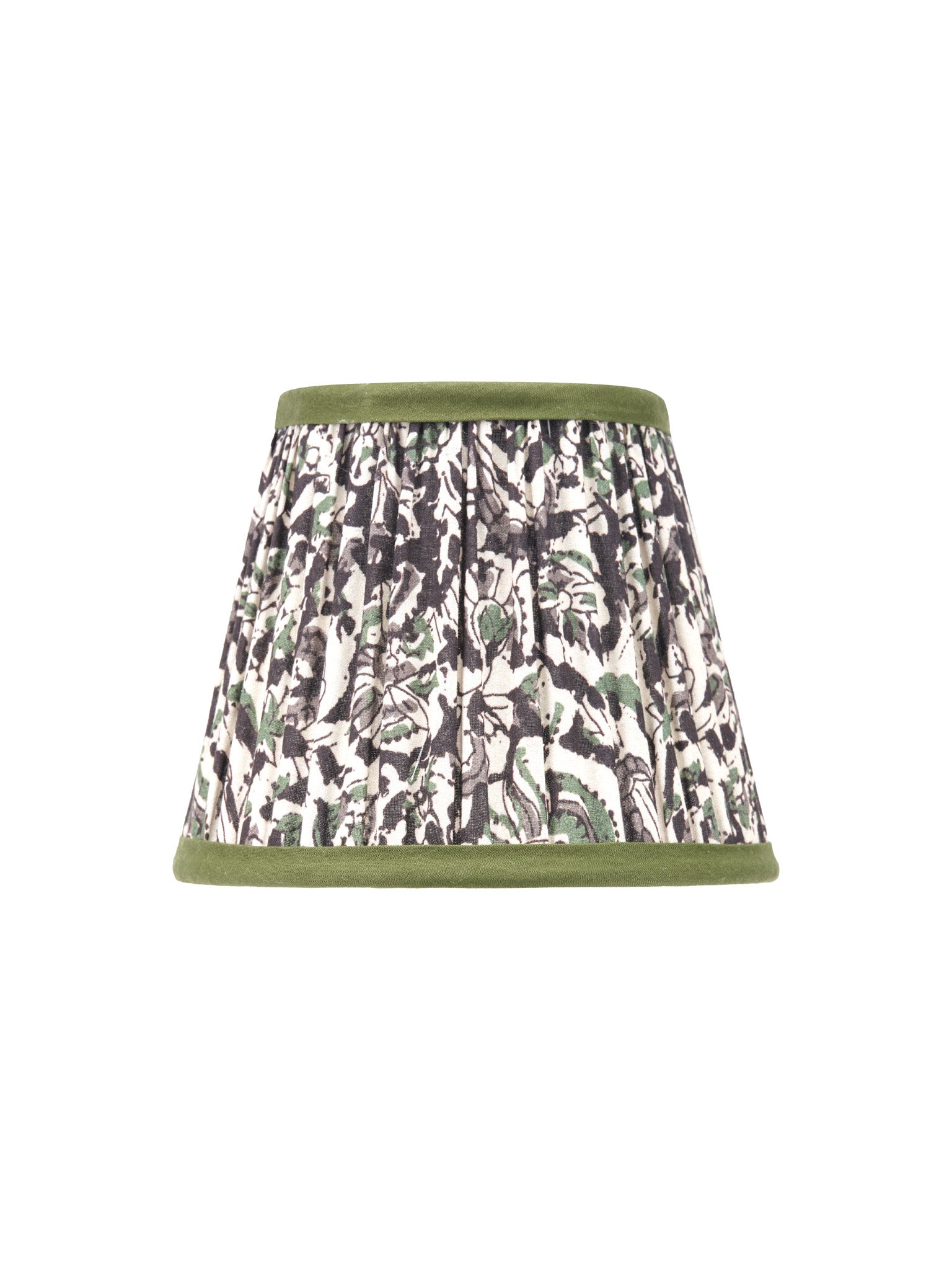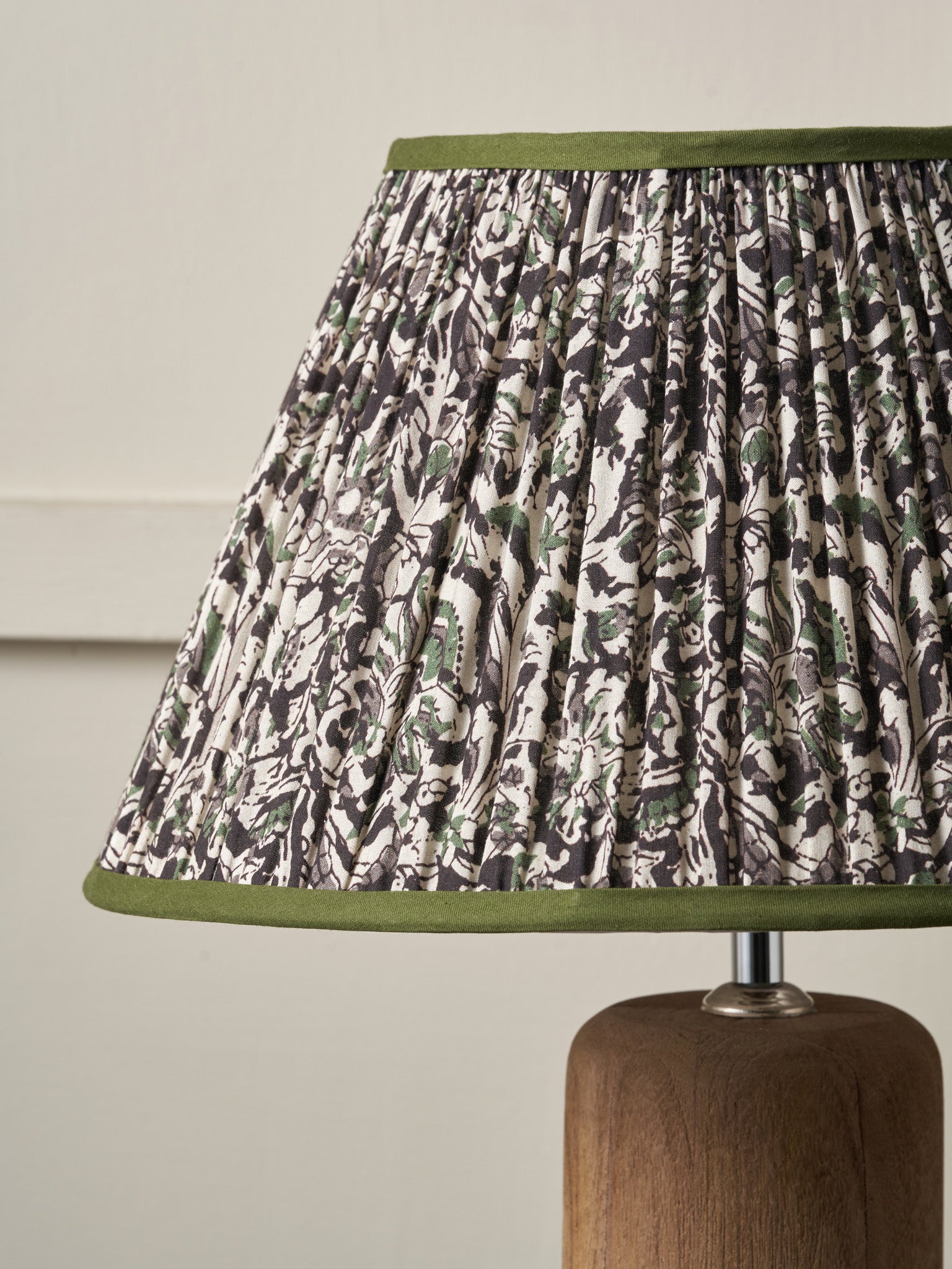 The Millicent empire lampshade is a beautifully handcrafted design, featuring a classic mushroom pleat made from high-quality cotton. Showcasing a refined floral pattern in rich green tones and finished with a tonal green binding, this elegant lampshade brings natural charm and timeless style to any interior.