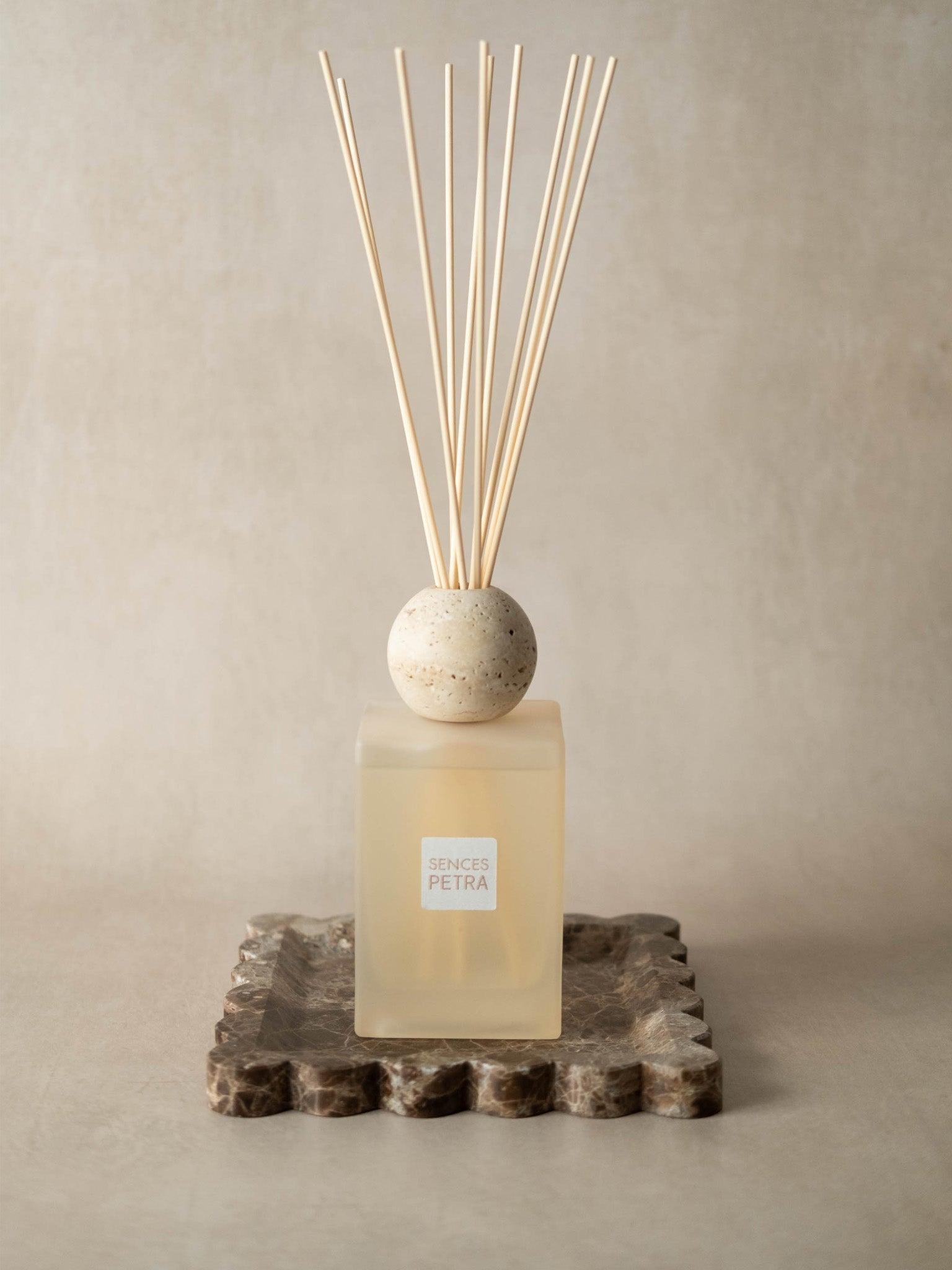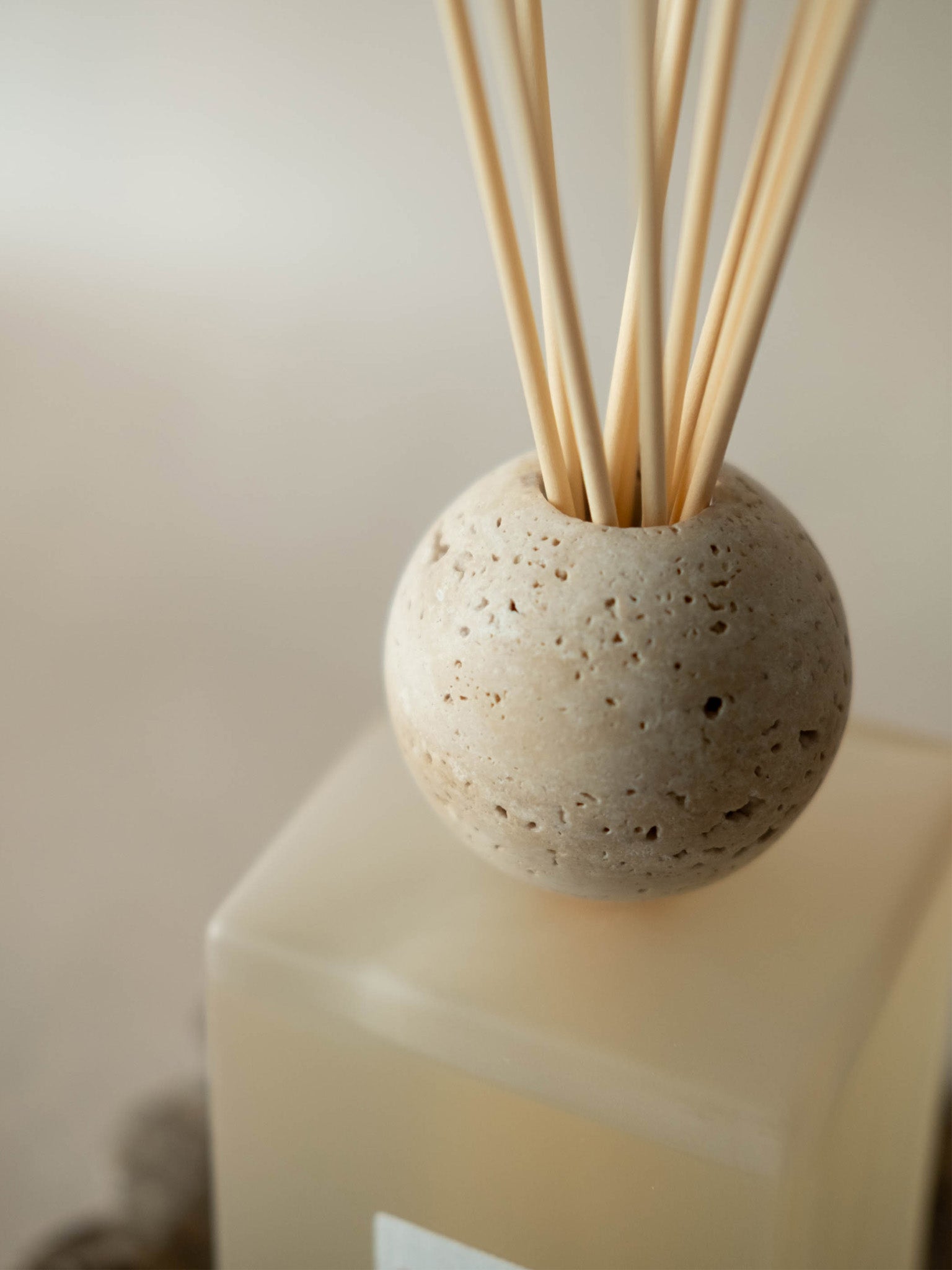 The reed diffuser is finished with a beautifully crafted travertine ball top, adding a touch of natural elegance.