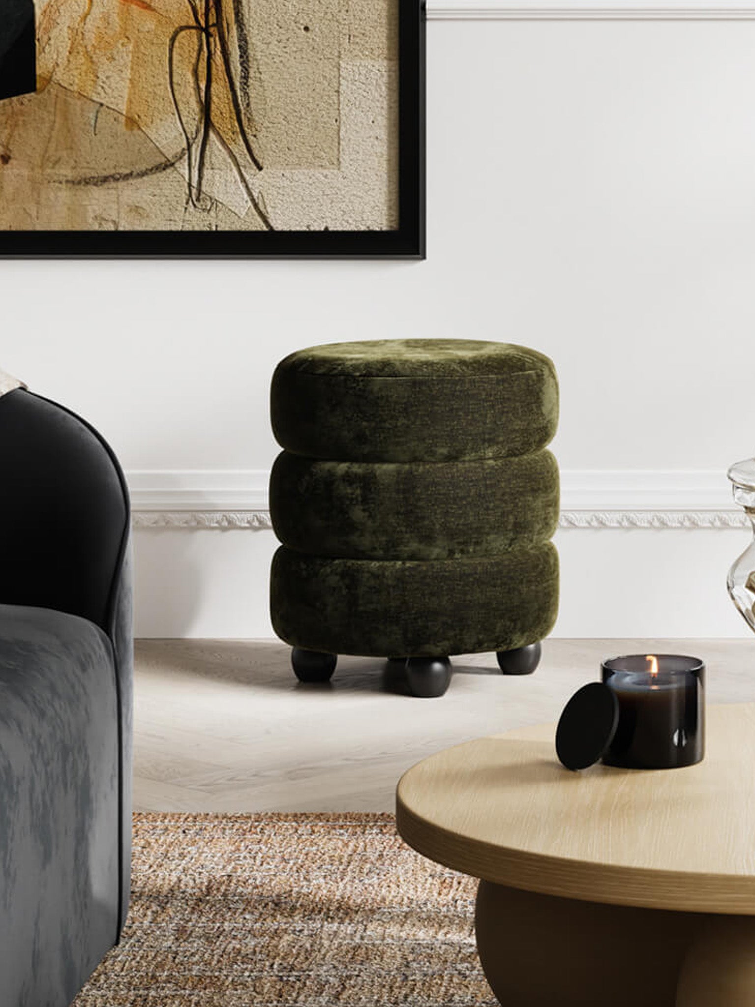 A multi use pouffe in a dark olive velvet