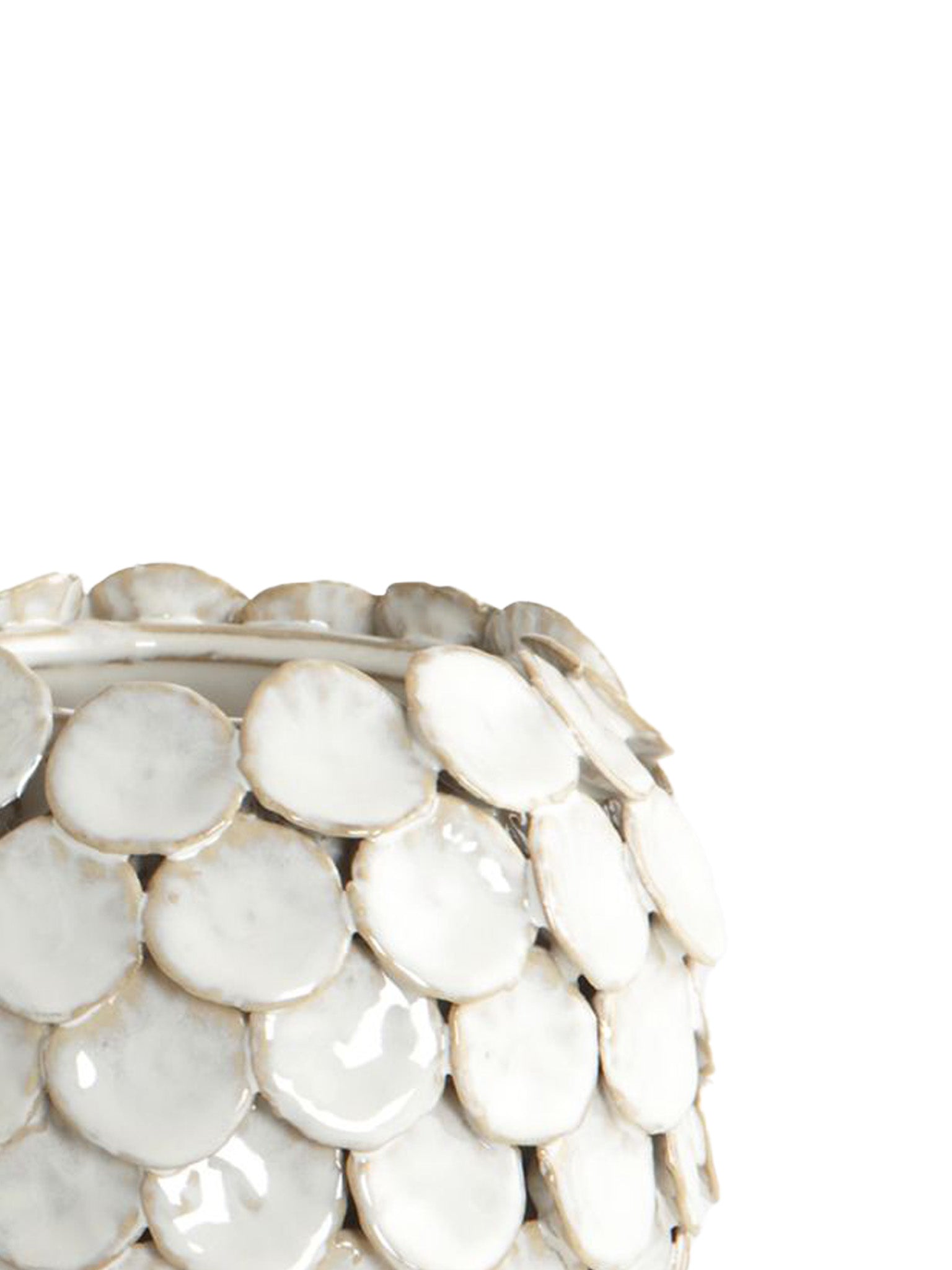 The unique design of this white stoneware pot combines delicate overlaping layered petals, adding a touch of elegance to any room. Not only is it a statement piece on its own, but it also provides the perfect vessel for displaying your favorite cut flowers.