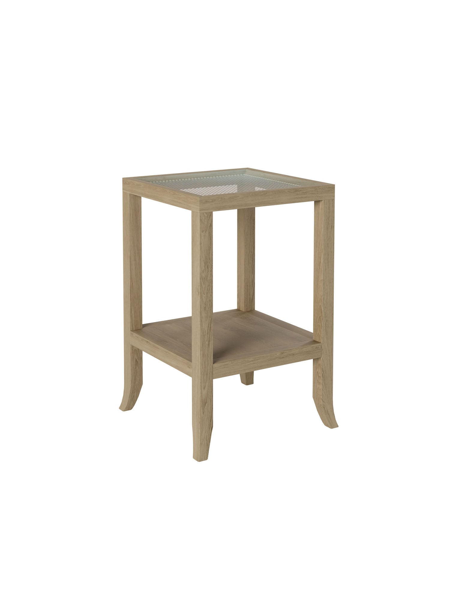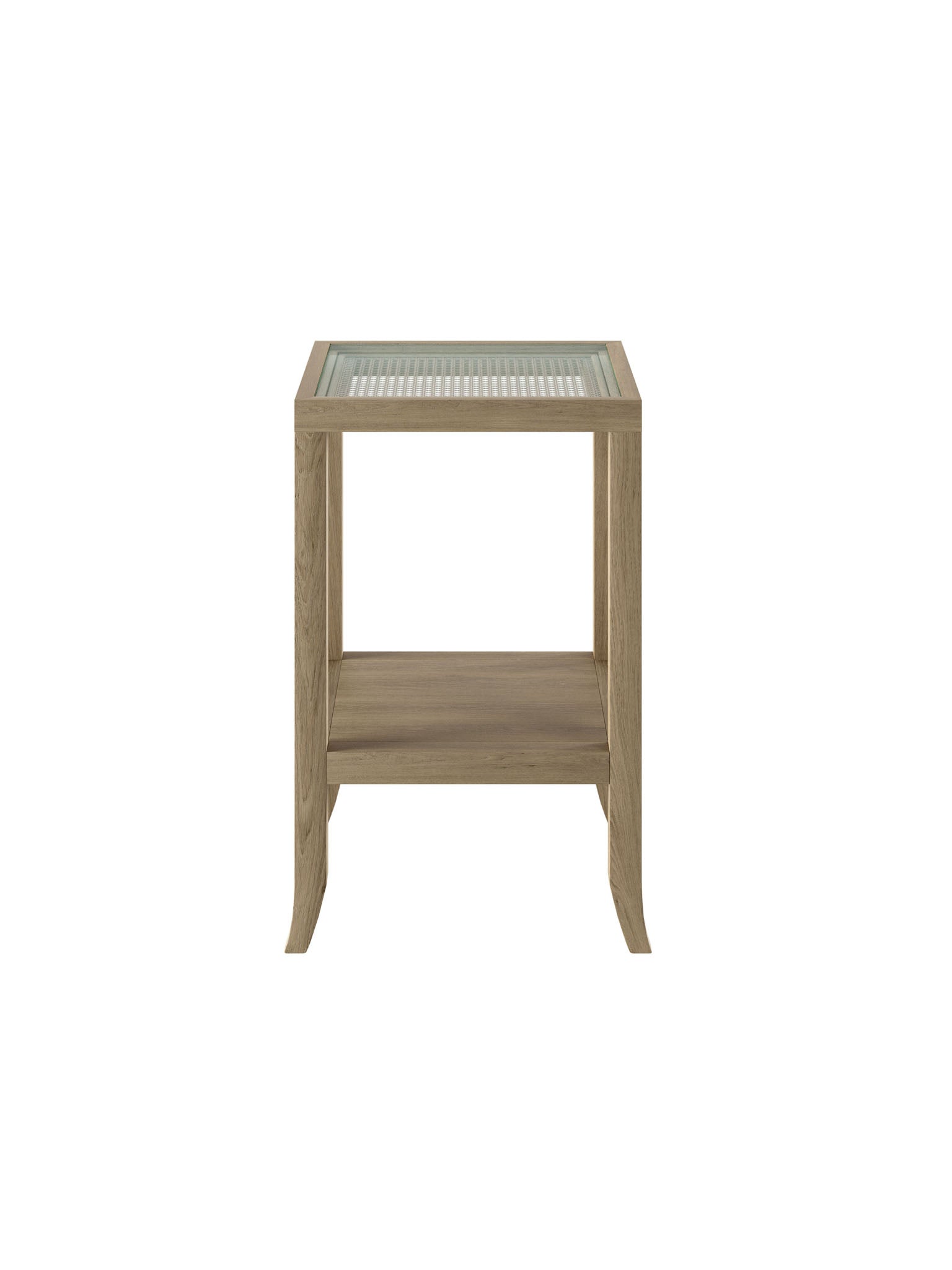 End table made from grey aged oak and grey oak veneer, tapered legs with a shelf underneath and glass top.
