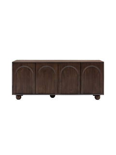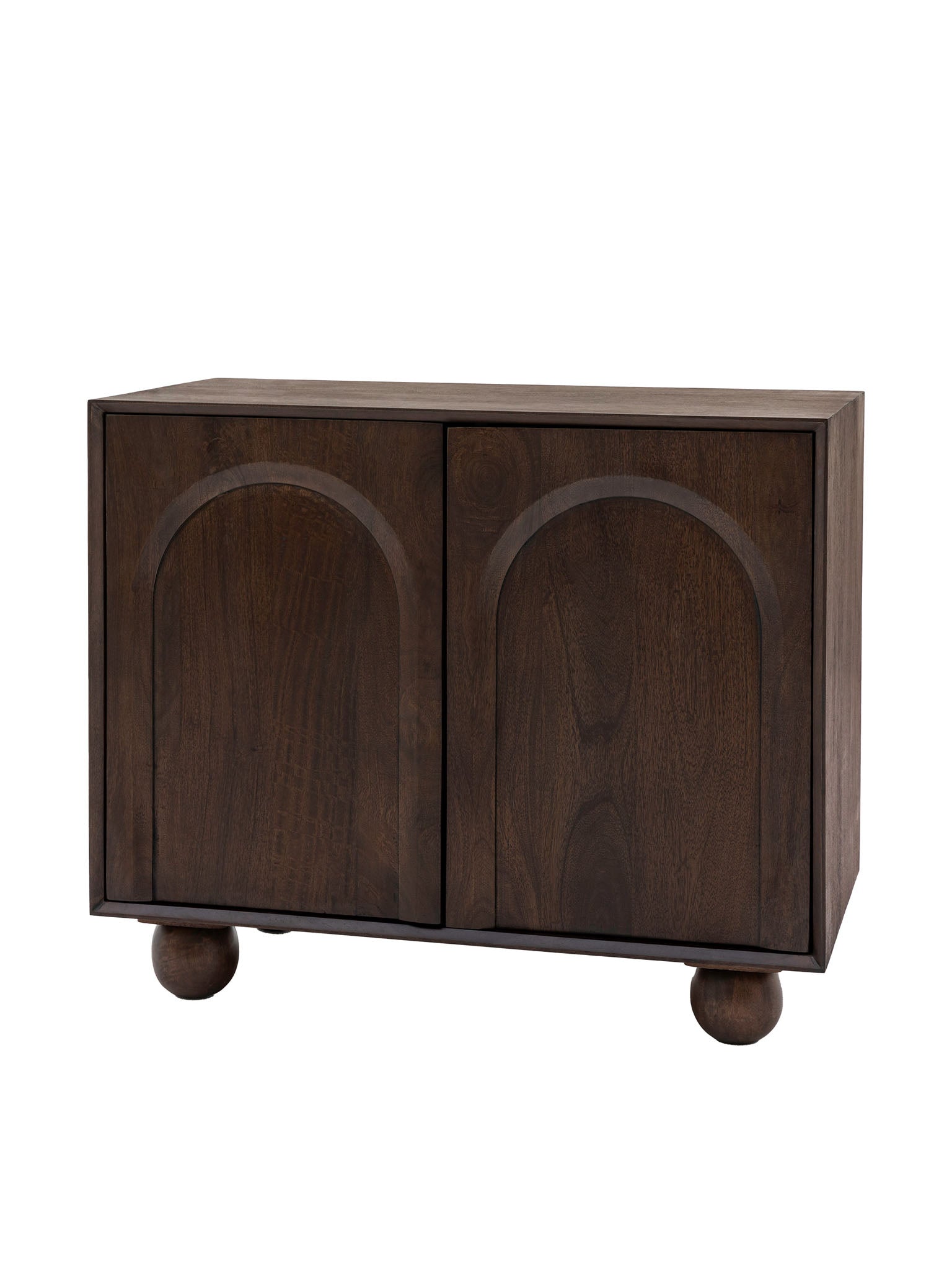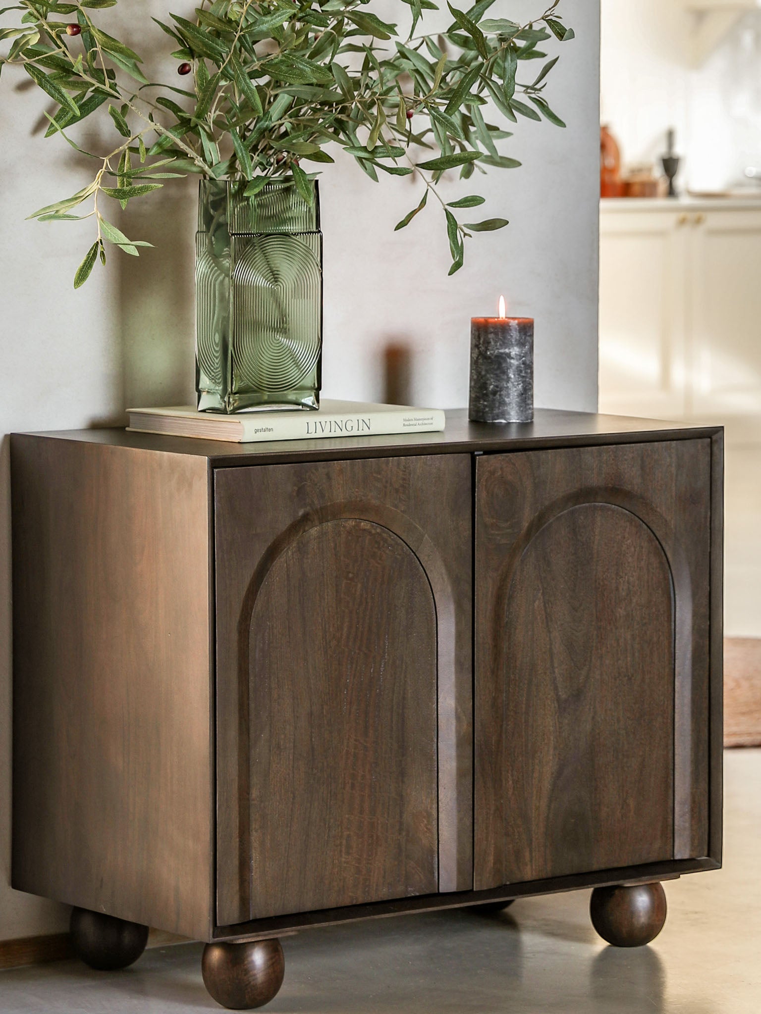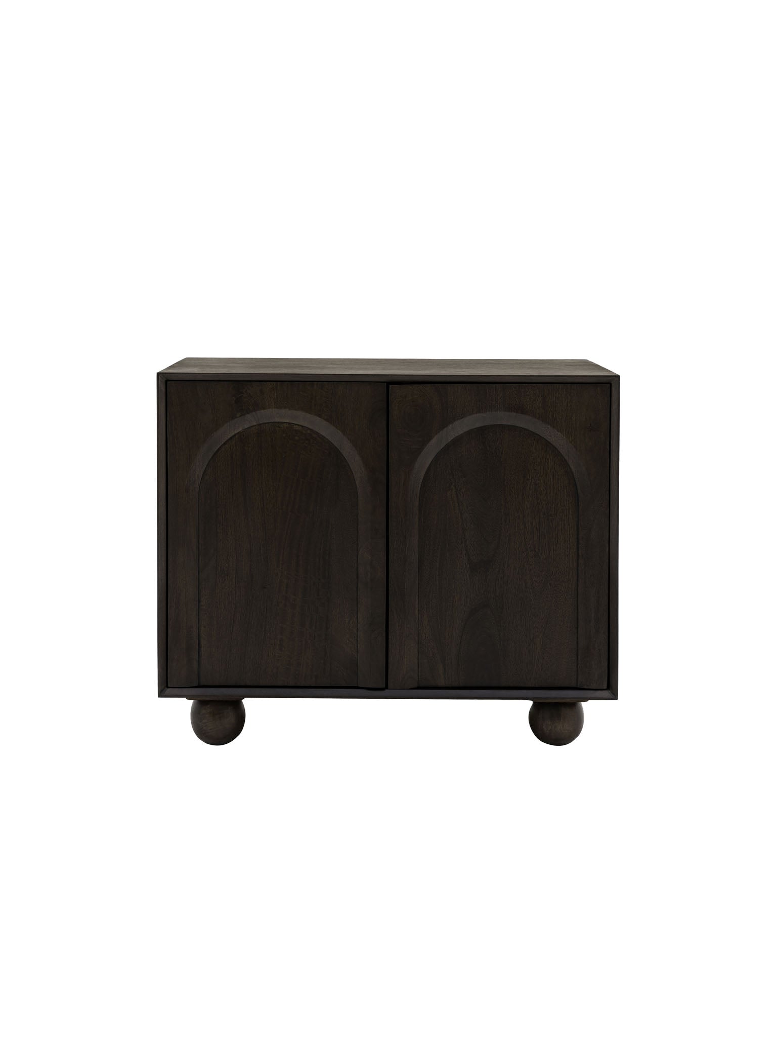 Drawing inspiration from the  vibes of the 70s, this sideboard radiates retro chic. Crafted from dark stained Mango wood, it boasts intricate grains accentuated by relief arch designs adorning each of its 2 doors.