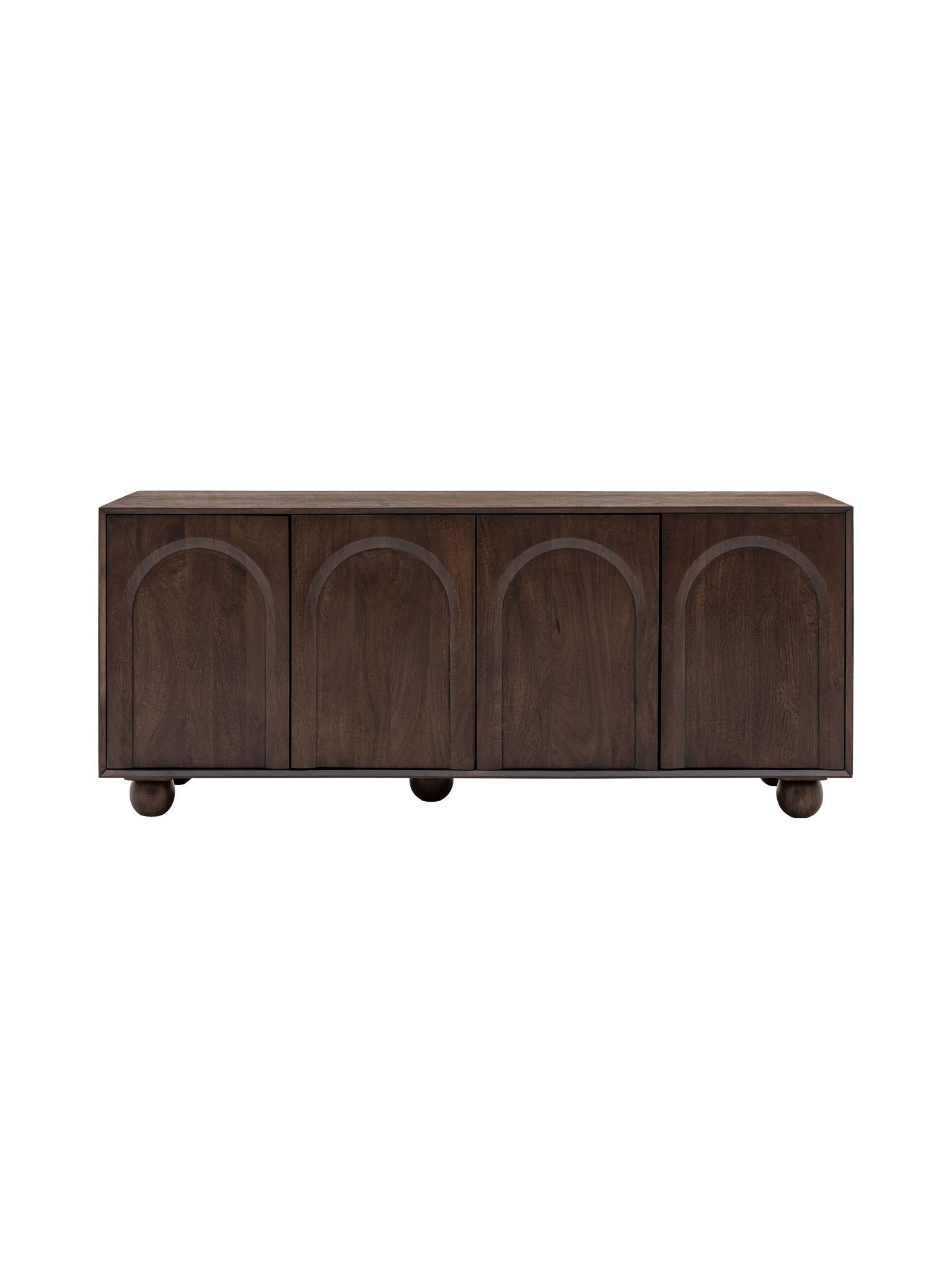 Drawing inspiration from the vibes of the 70s, this sideboard radiates retro chic. Crafted from dark stained Mango wood, it boasts intricate grains accentuated by relief arch designs adorning each of its 4 doors.