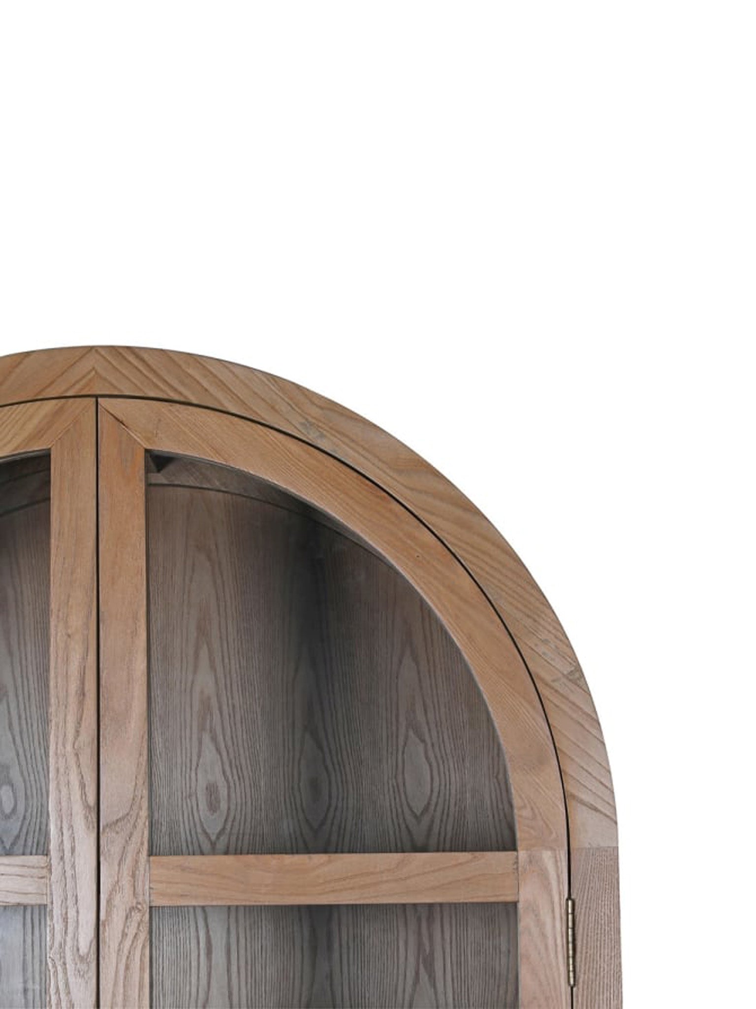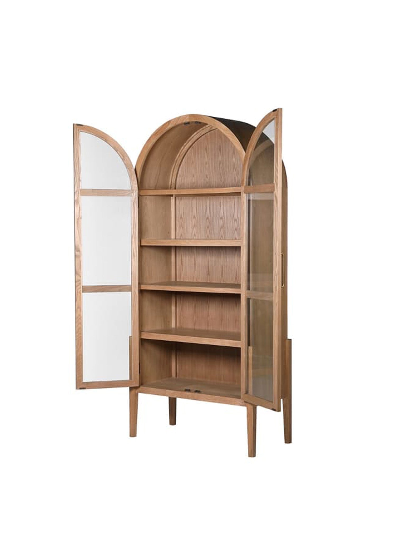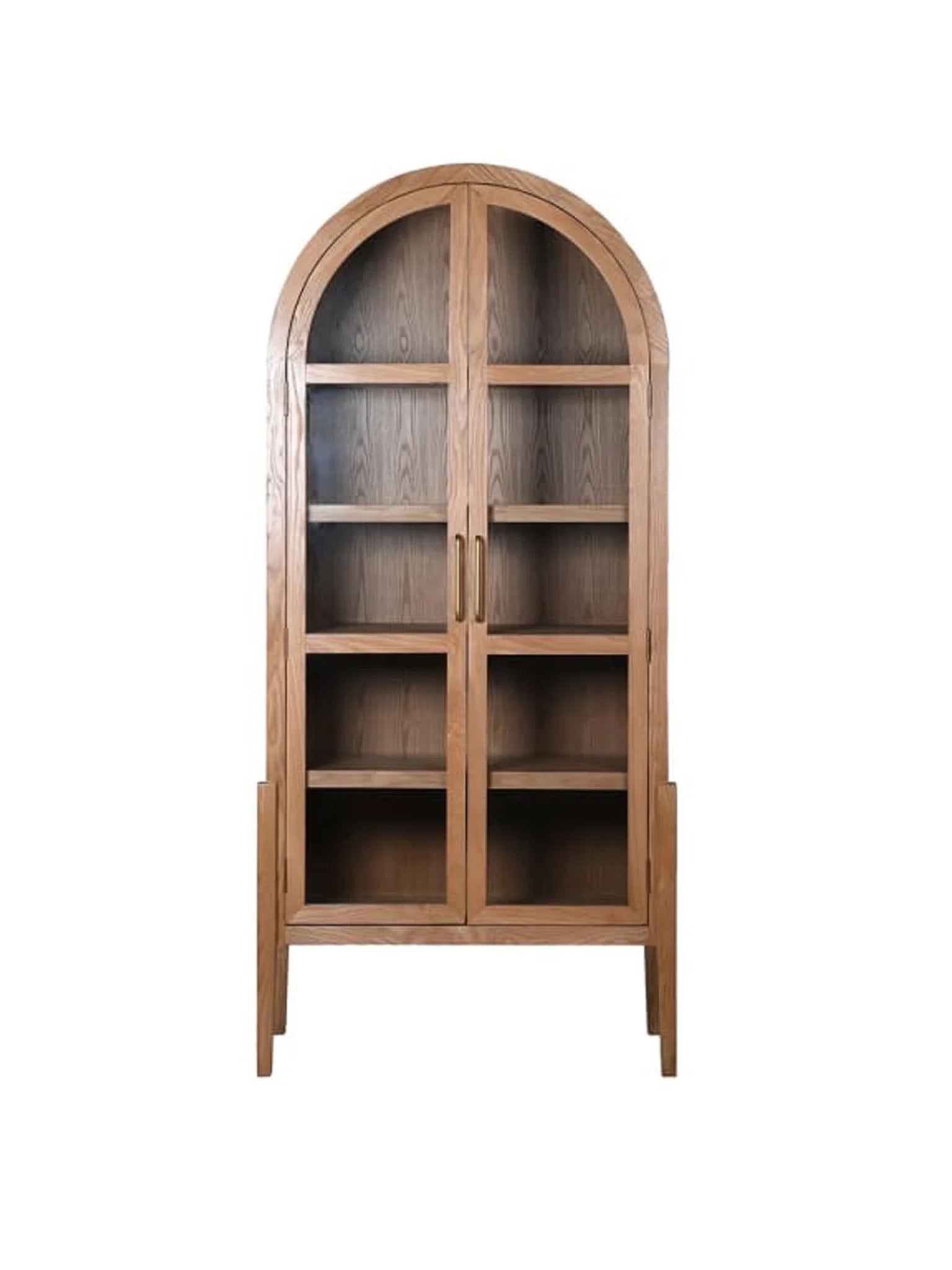 Stunning 5 shelf display cabinet made from Elm, it features a beautiful curved design and elegant brushed brass handles, adding a touch of contemporary style to your living space.