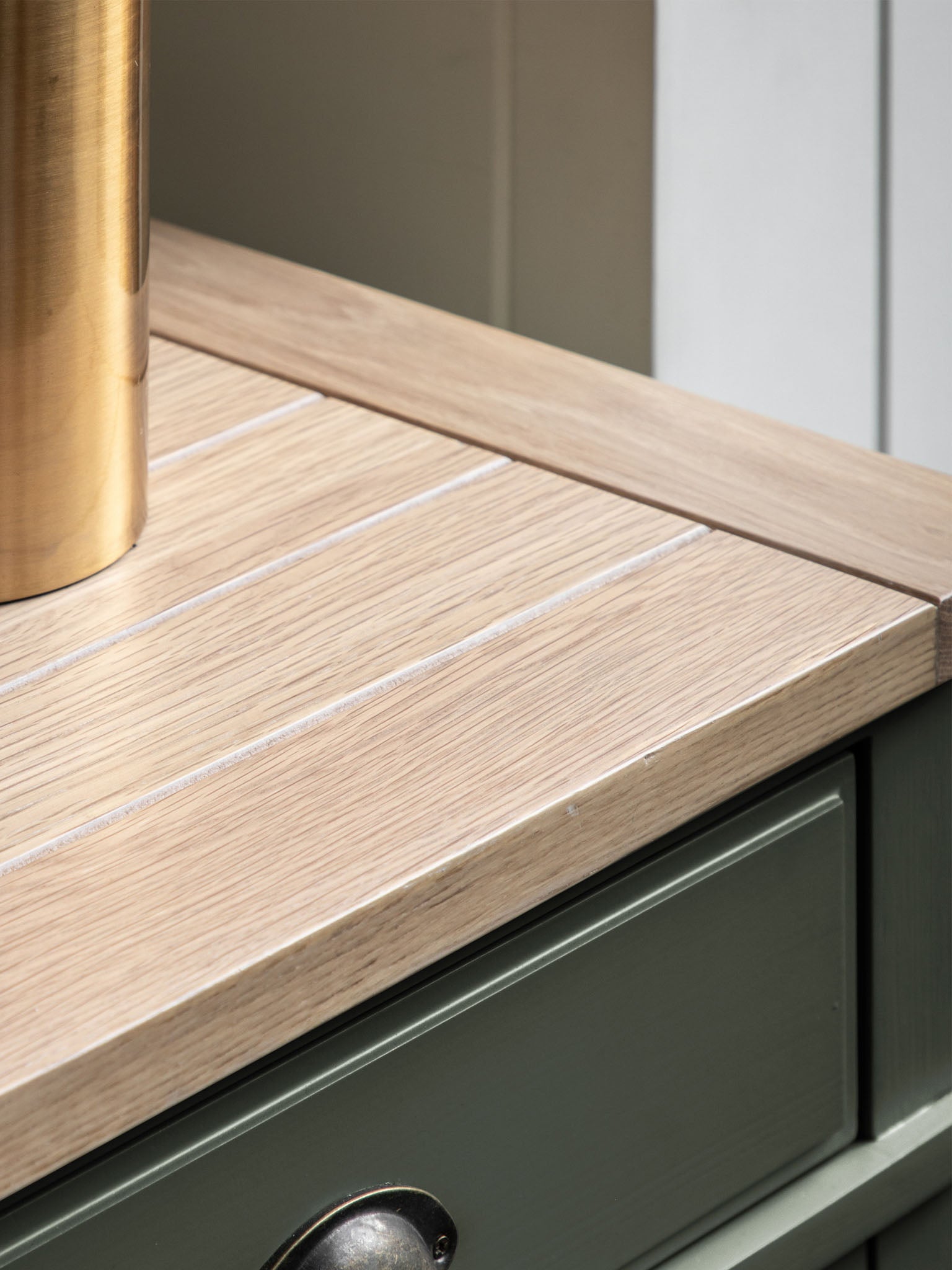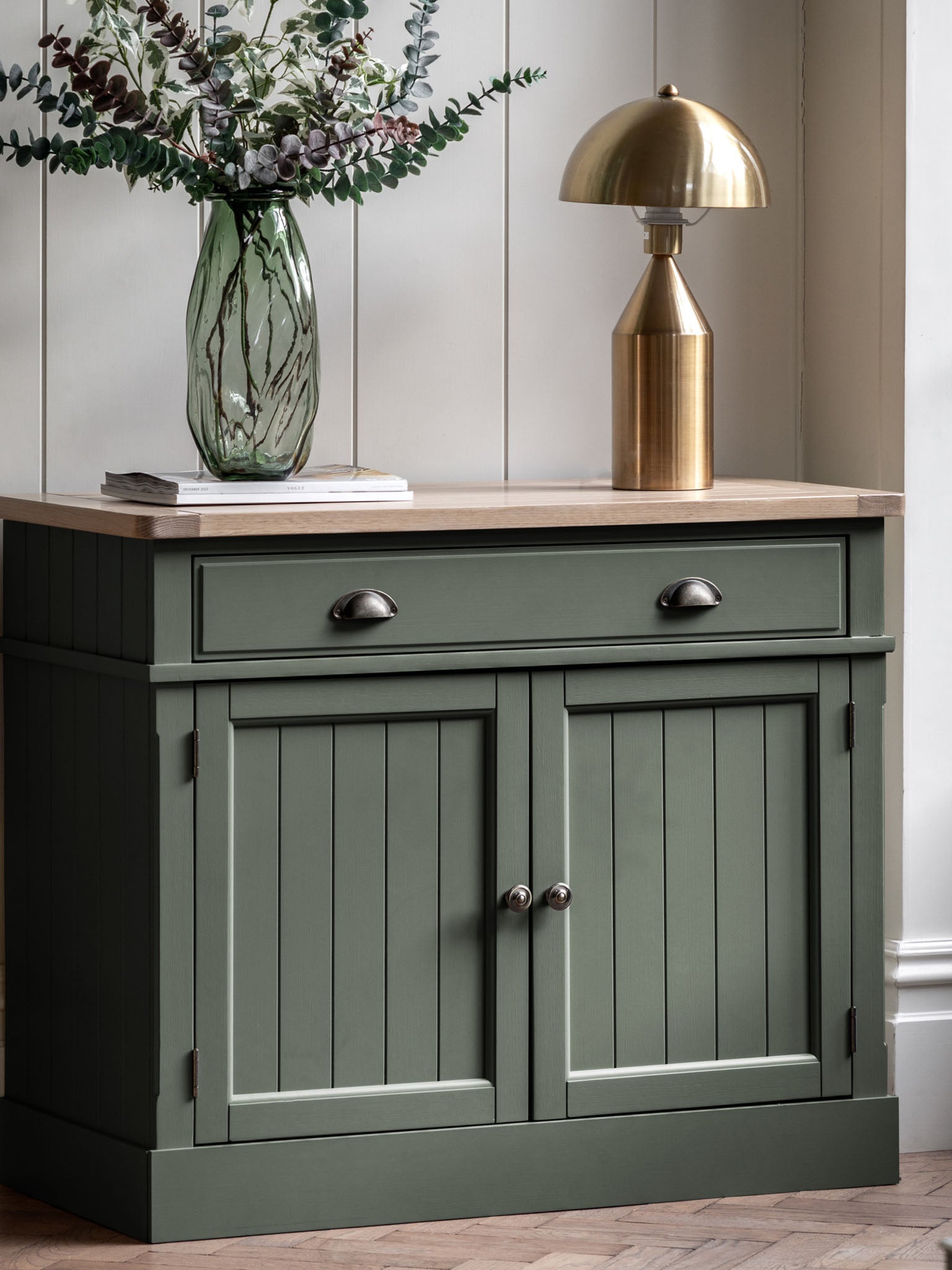 This sideboard combines traditional charm with contemporary style. Offering practical storage with a single large draw and 2 door cupboard with adjustable shelves, there's plenty of storage space. The combination of the grooved & planked oak top with hand painted textured finish base in a dark green, grooved doors and traditional style metal handles gives the sideboard a modern twist on a country classic style.