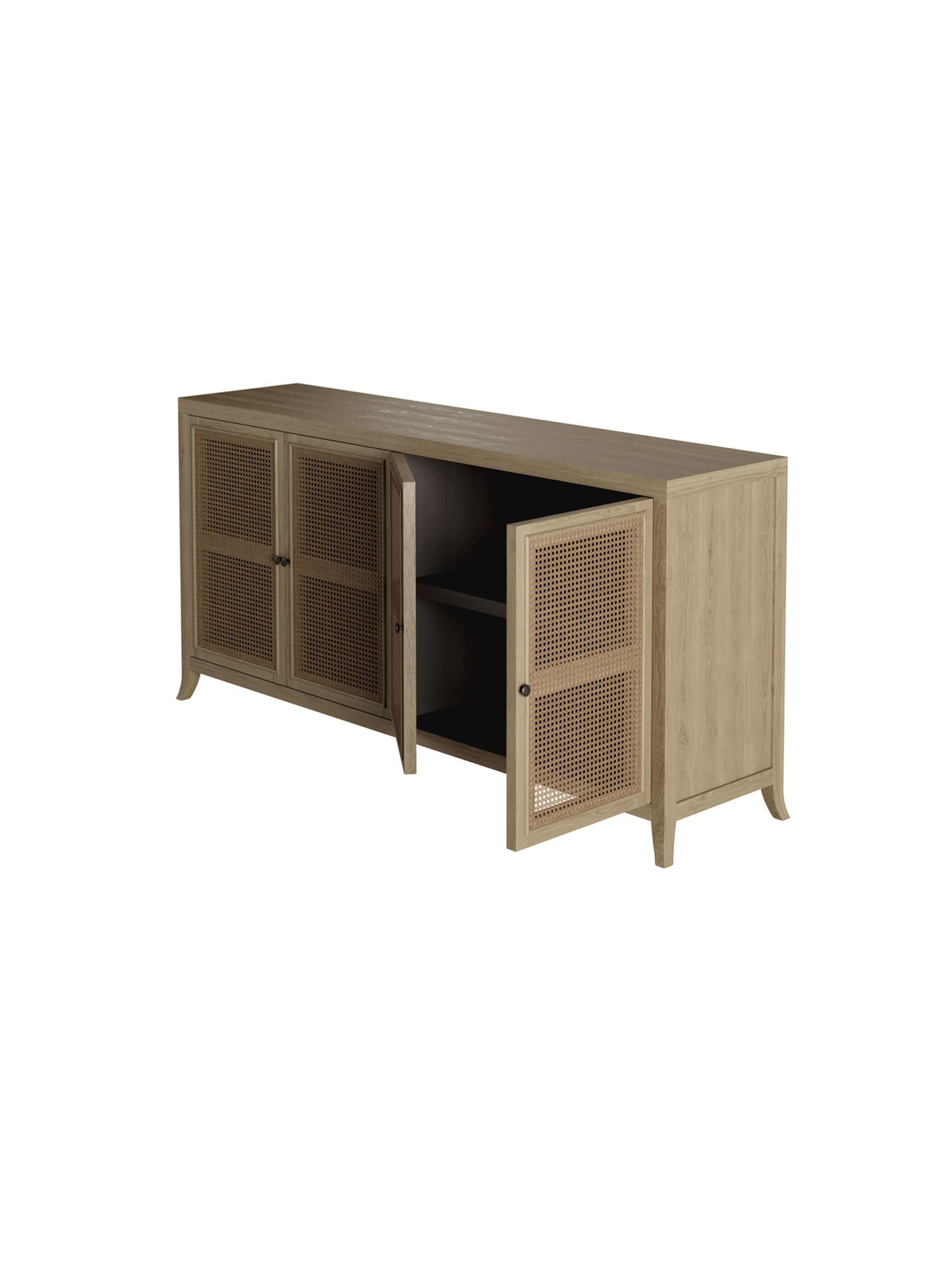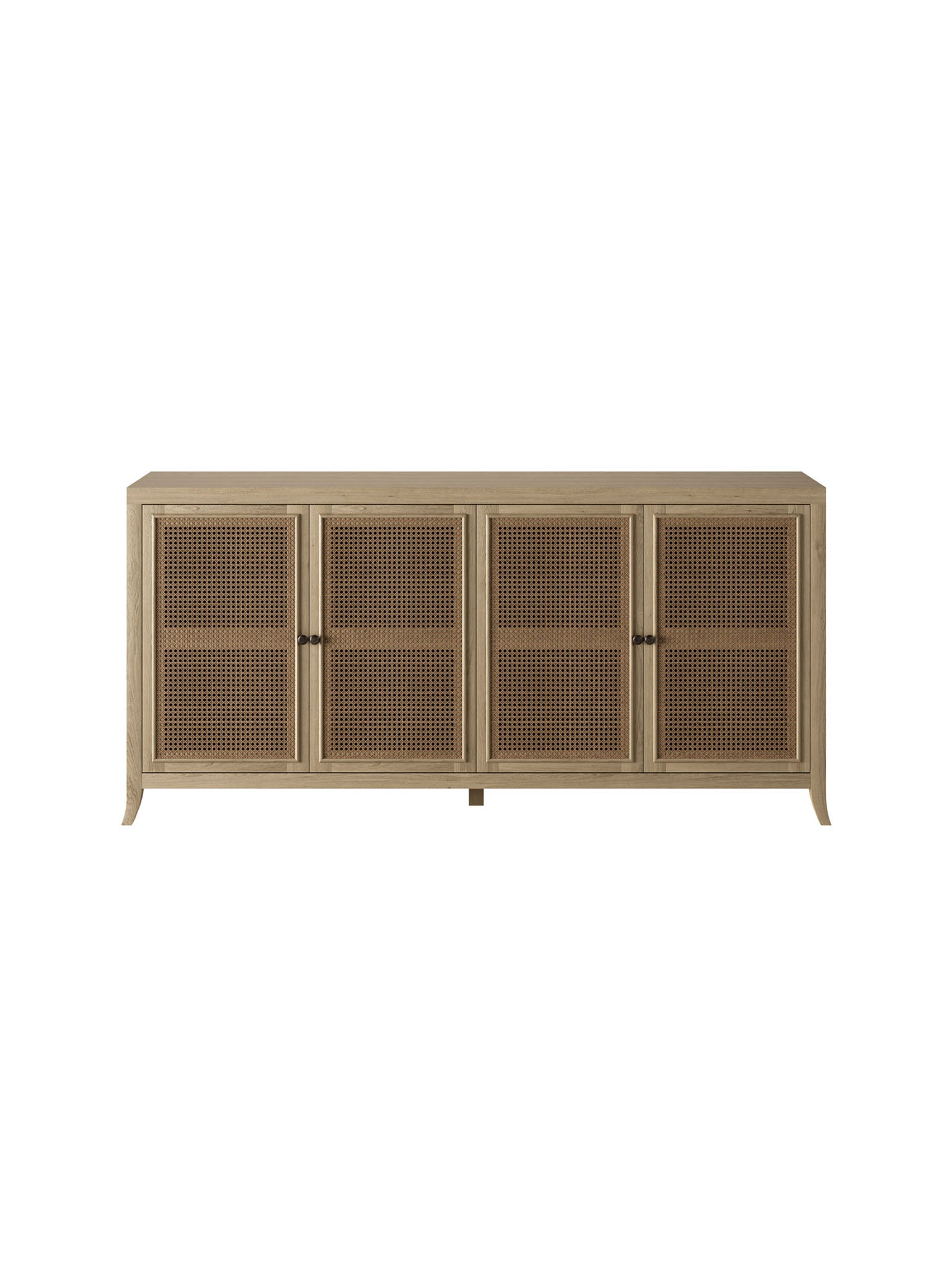 Four door sideboard in grey aged oak veneer, rattan latticed front, tapered legs and small gun metal stule handles - a beautifully designed piece that will add both style and functionality to your home.