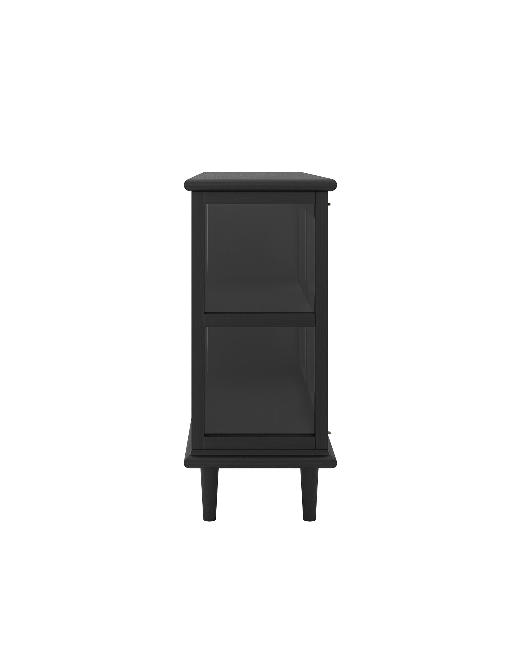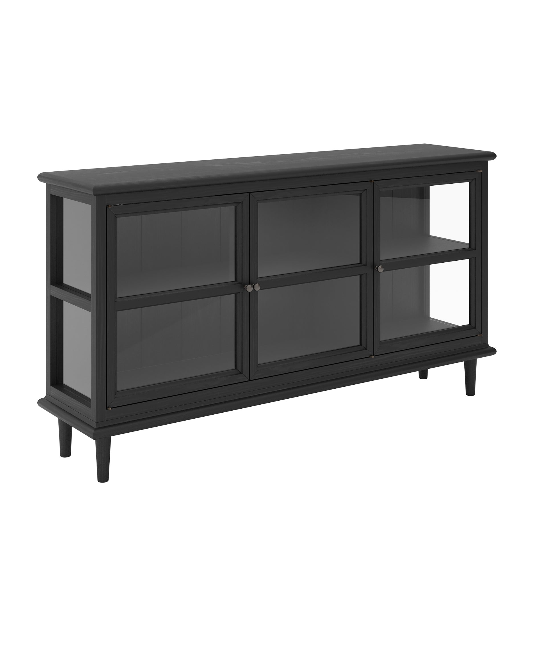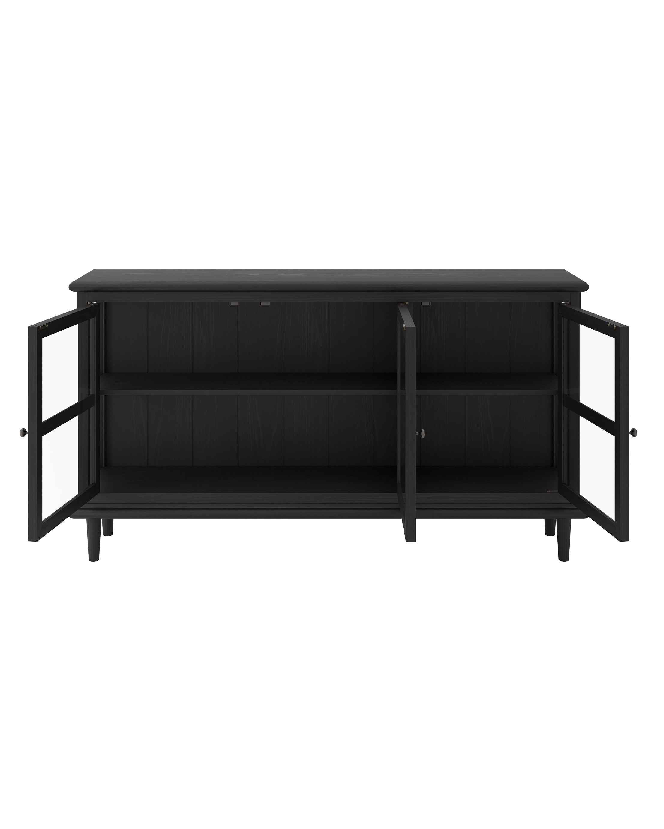 The black Northcote sideboard has a matte grain finish, clear glass front and sides, and offers plenty of shelf space. Available in two colorways, its contemporary design adds a sleek and modern touch to any room, making it both stylish and functional.