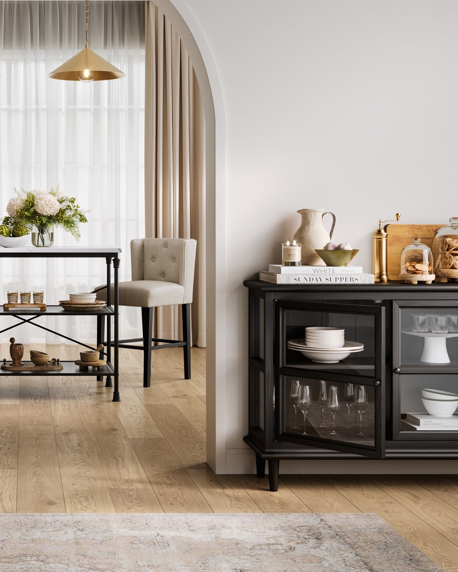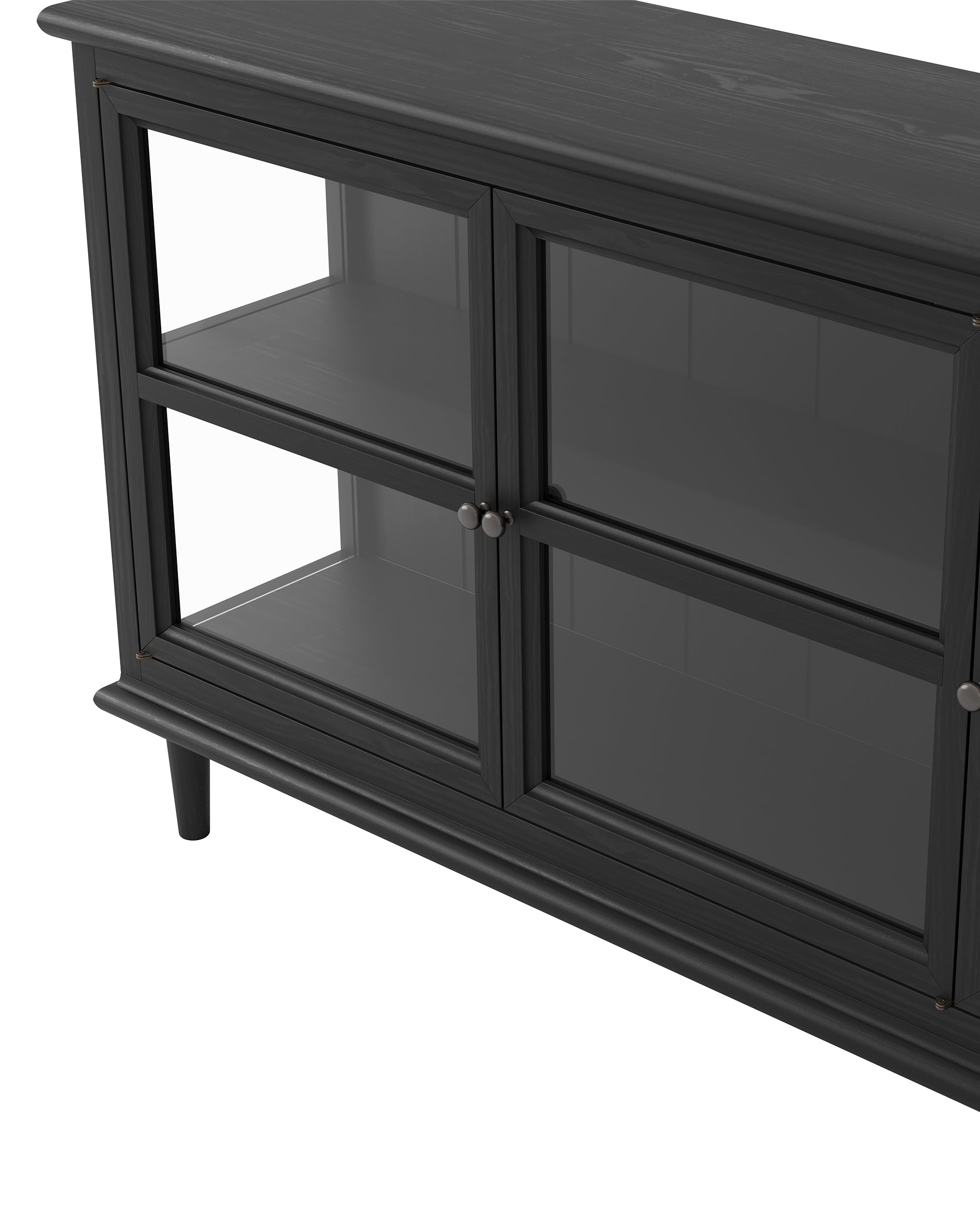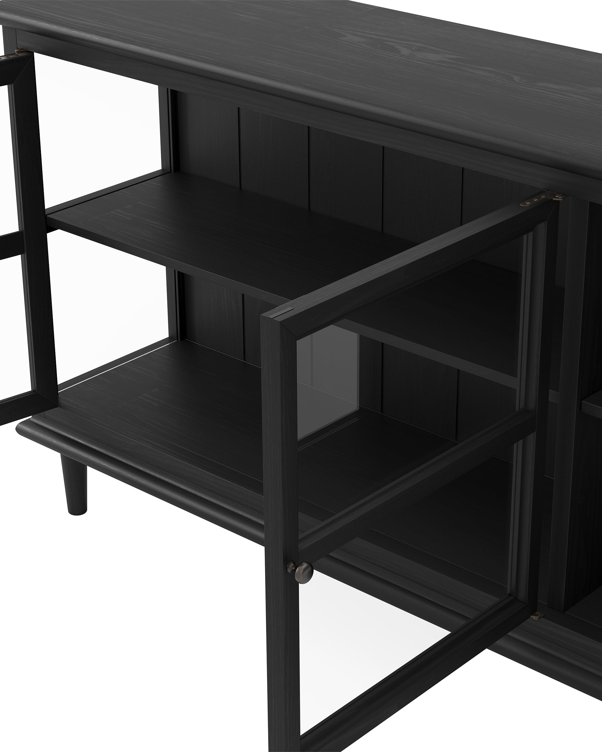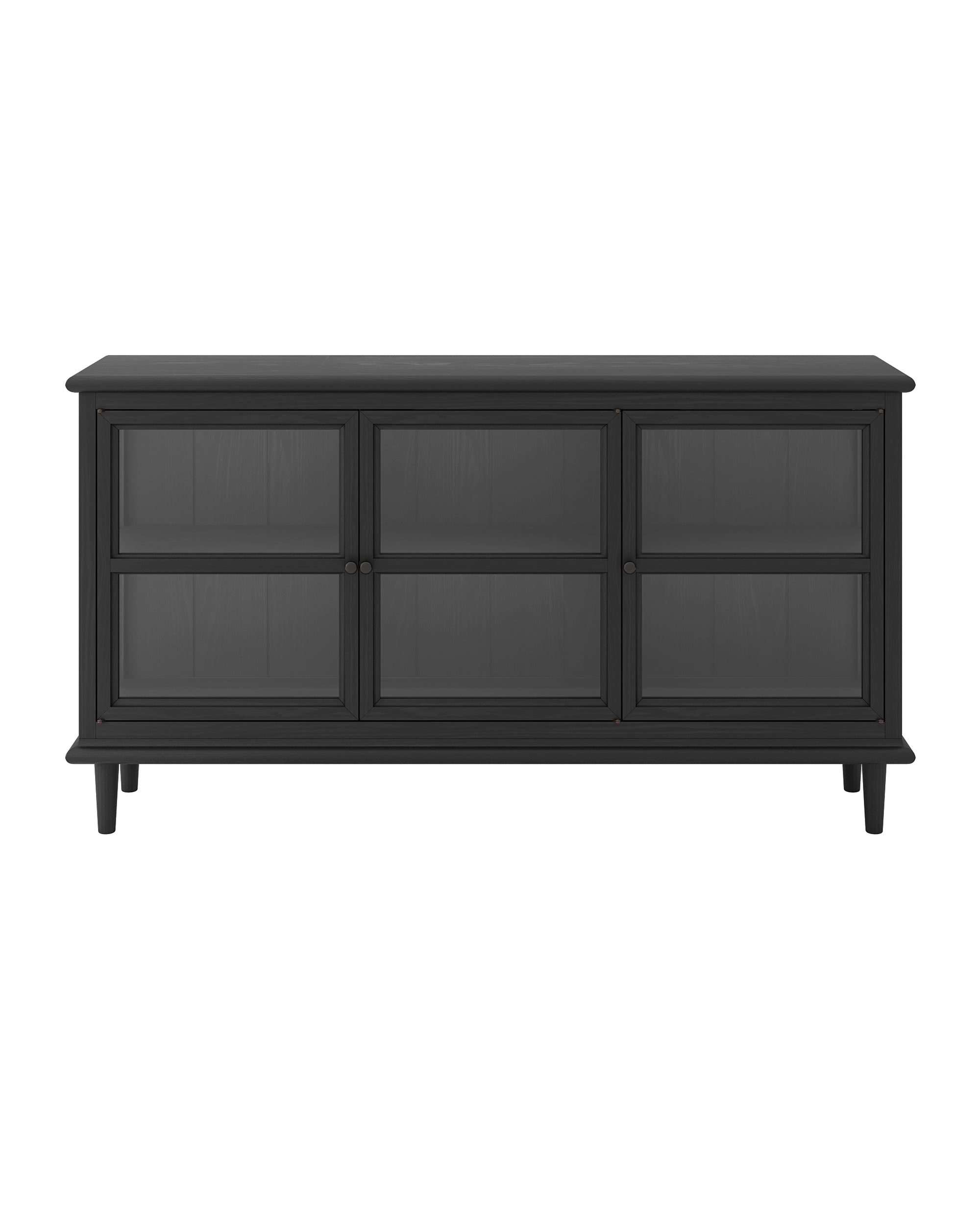 The black Northcote sideboard has a matte grain finish, clear glass front and sides, and offers plenty of shelf space. Available in two colorways, its contemporary design adds a sleek and modern touch to any room, making it both stylish and functional.
