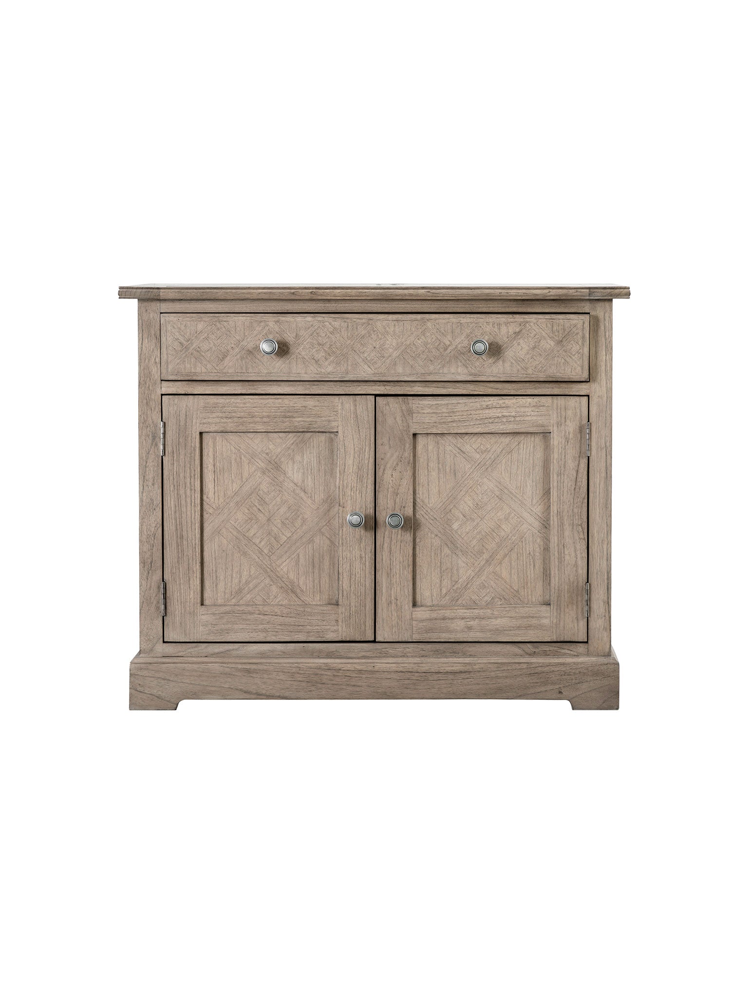 The doors, drawer fronts, and top showcase the signature parquet-style design, while the large drawer and cupboard below provide ample storage. Elevate your living, dining, or bedroom space with this tasteful and functional piece.
