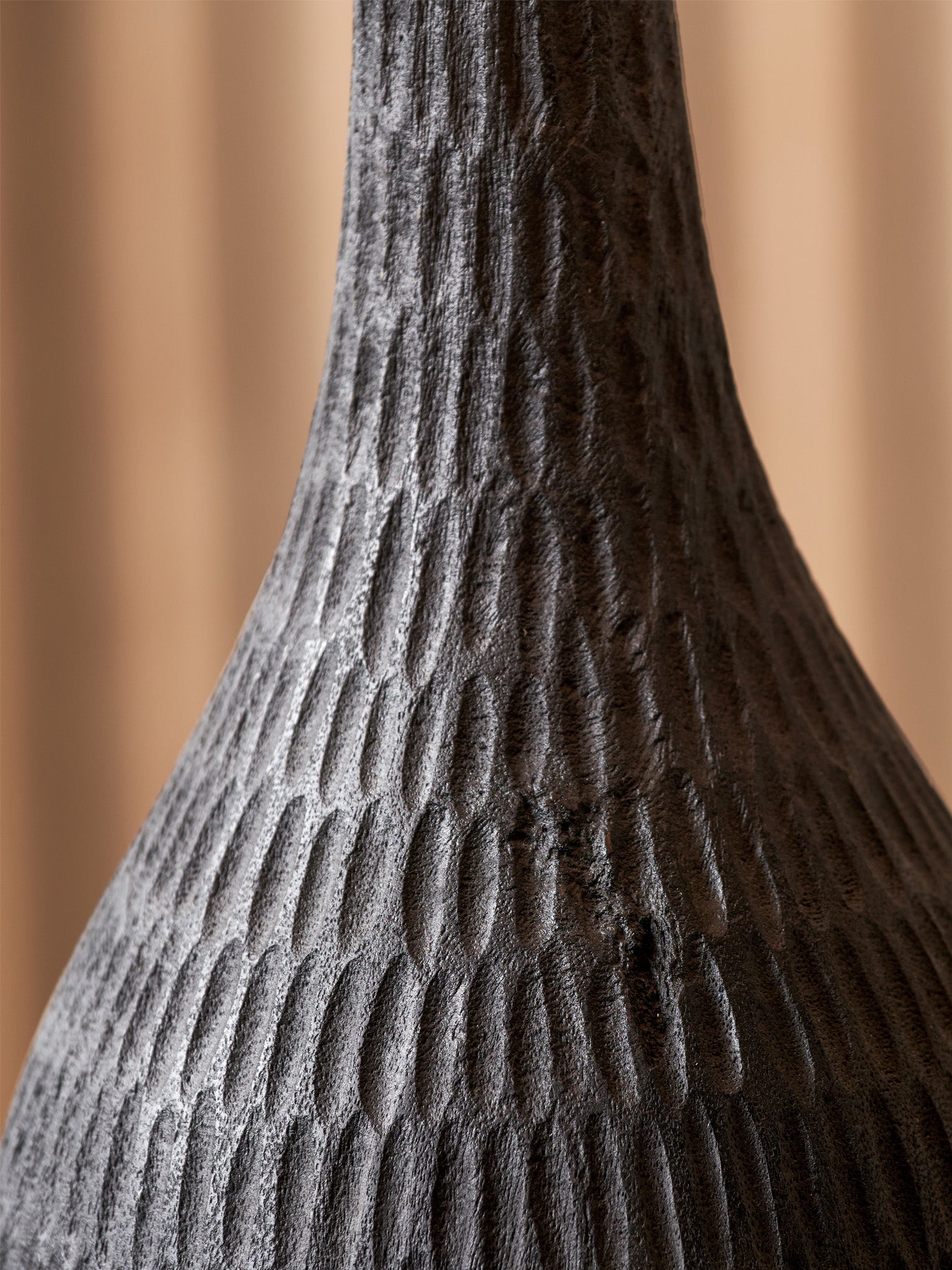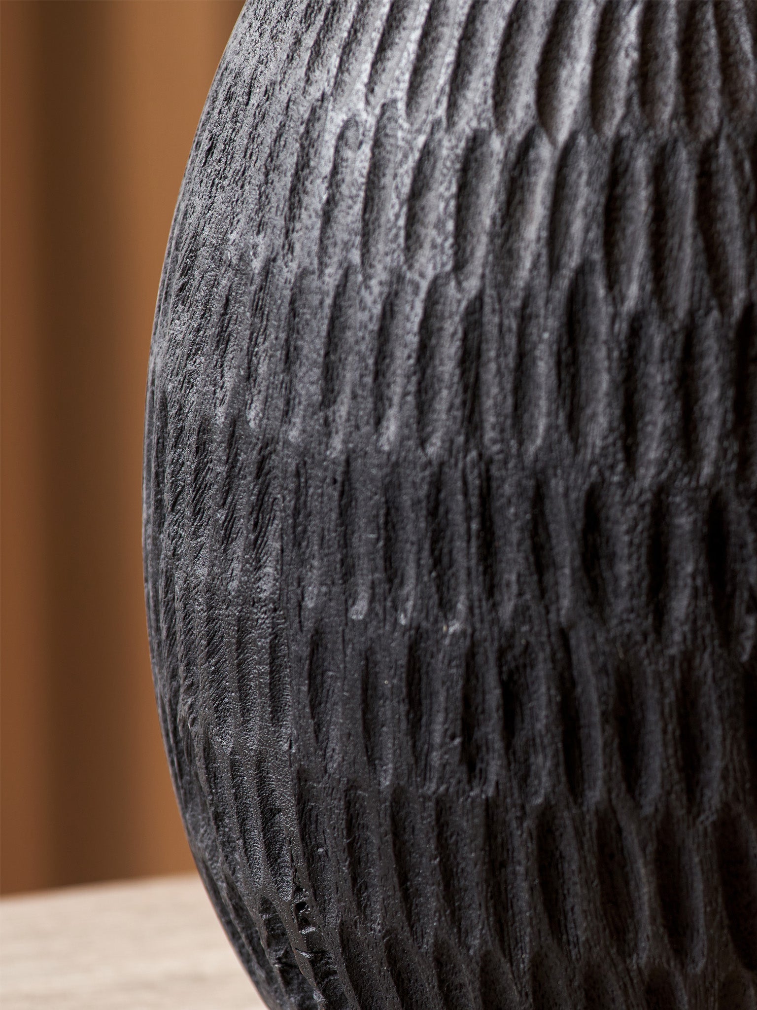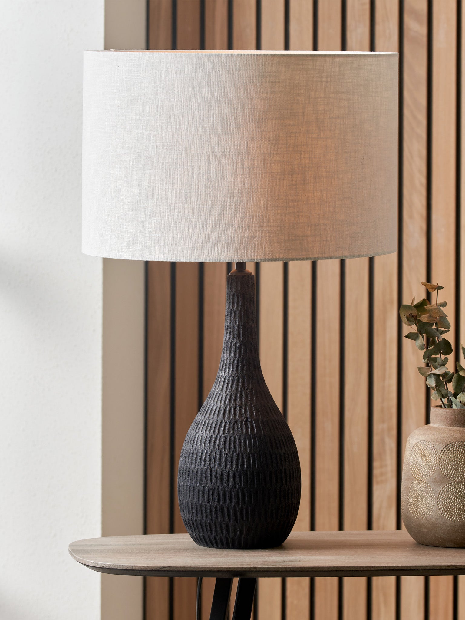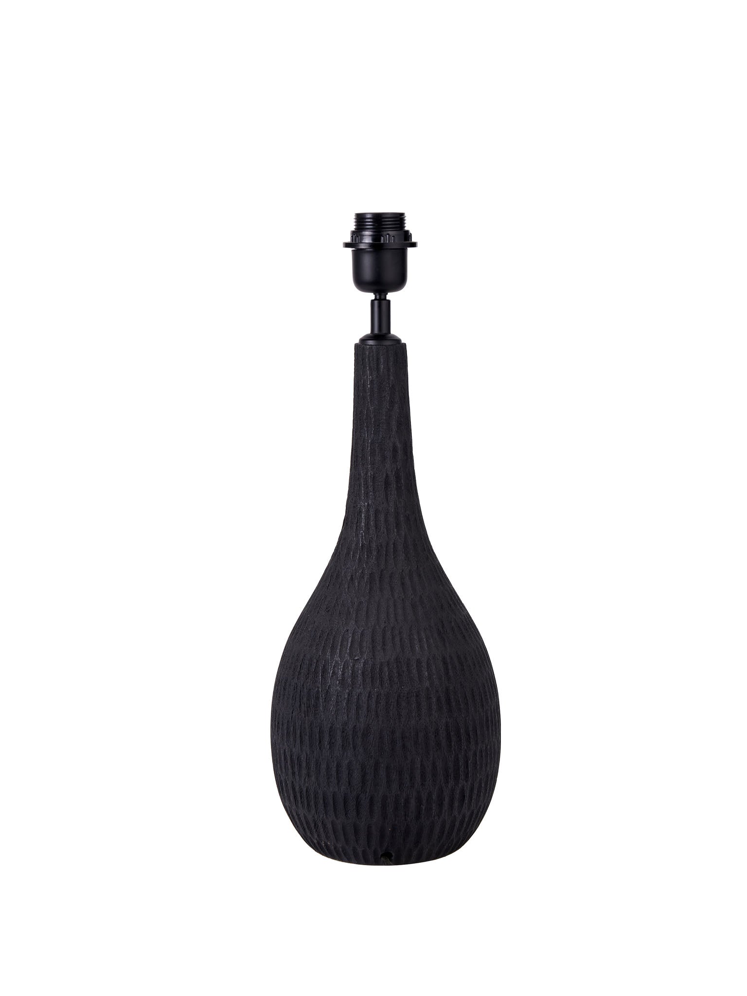 This elegant table lamp features a black finish with subtle etched marks, creating a unique design. Its bottle-shaped form is perfect for elevating the look of any living room. Showcase a matching black shade for an elegant touch, or choose something more neutral for versatility