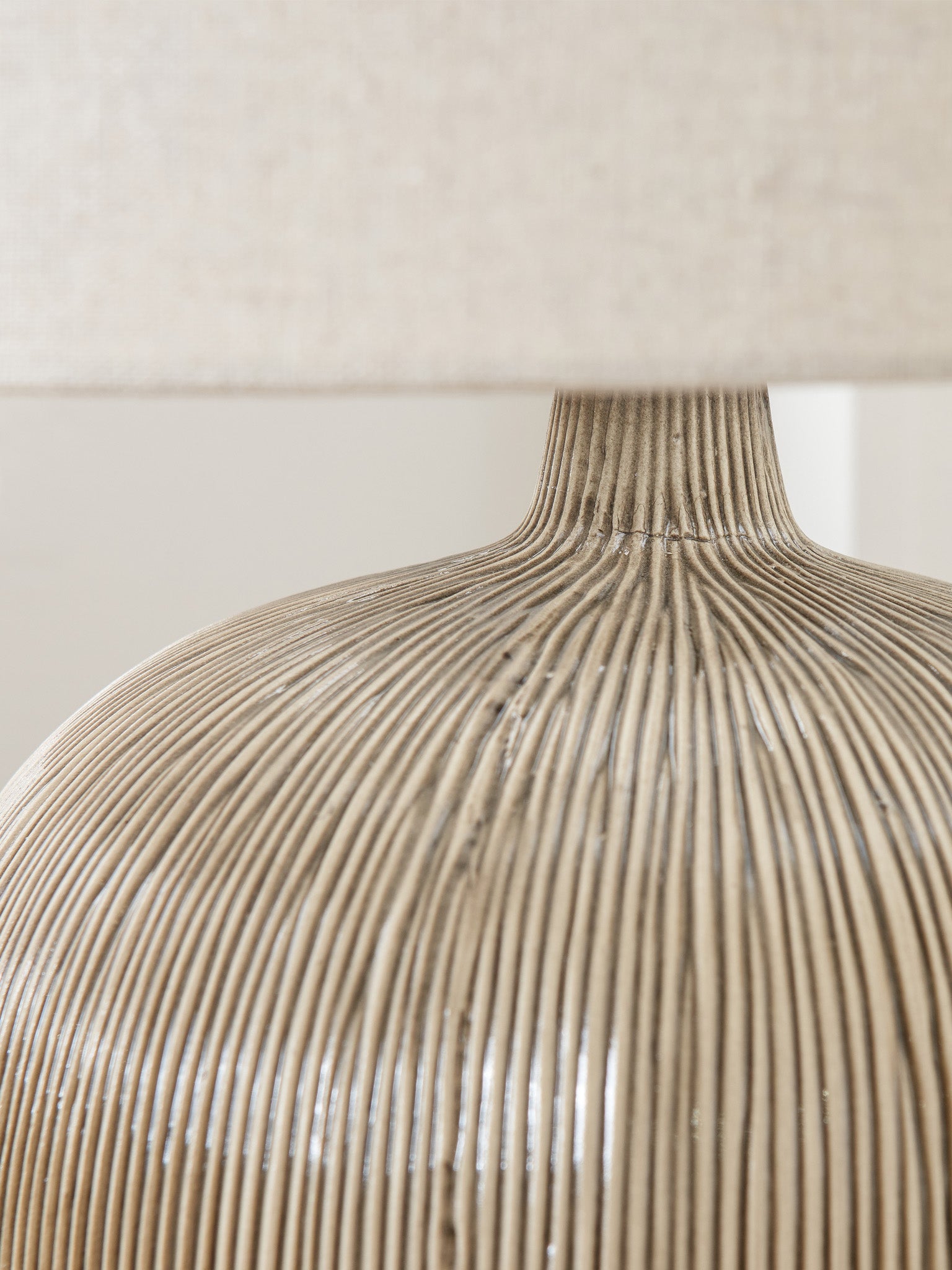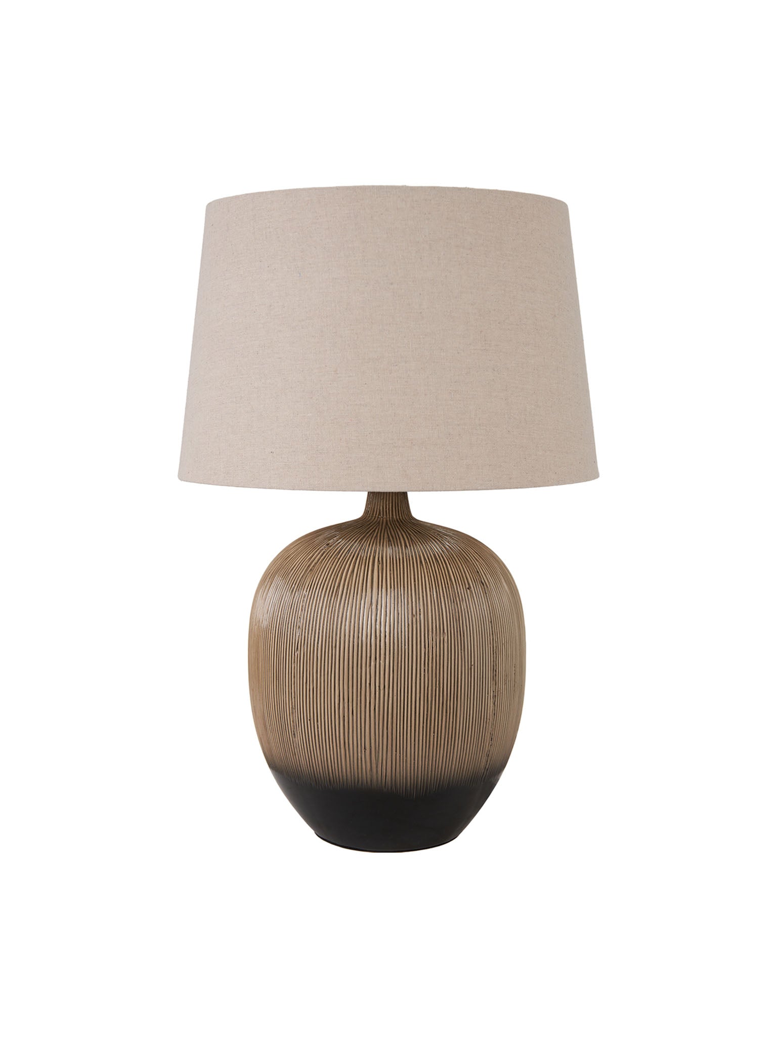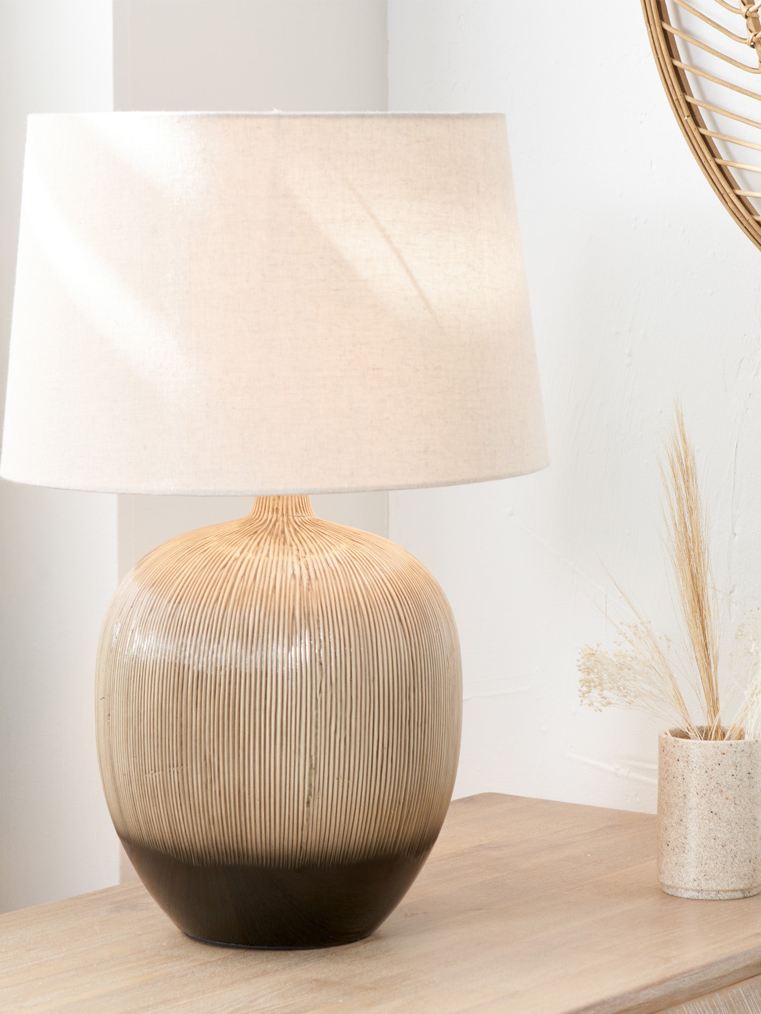 The stunning ceramic table lamp with an elegantly curved base has a subtle textured effect, further accentuated with a stylish black to natural ombre. The lamp base is topped off perfectly with a tapered, self-lined shade in a natural hue. This versatile table lamp will look fabulous in any scandi-style interior, with its natural colour palette and delicate tactility.