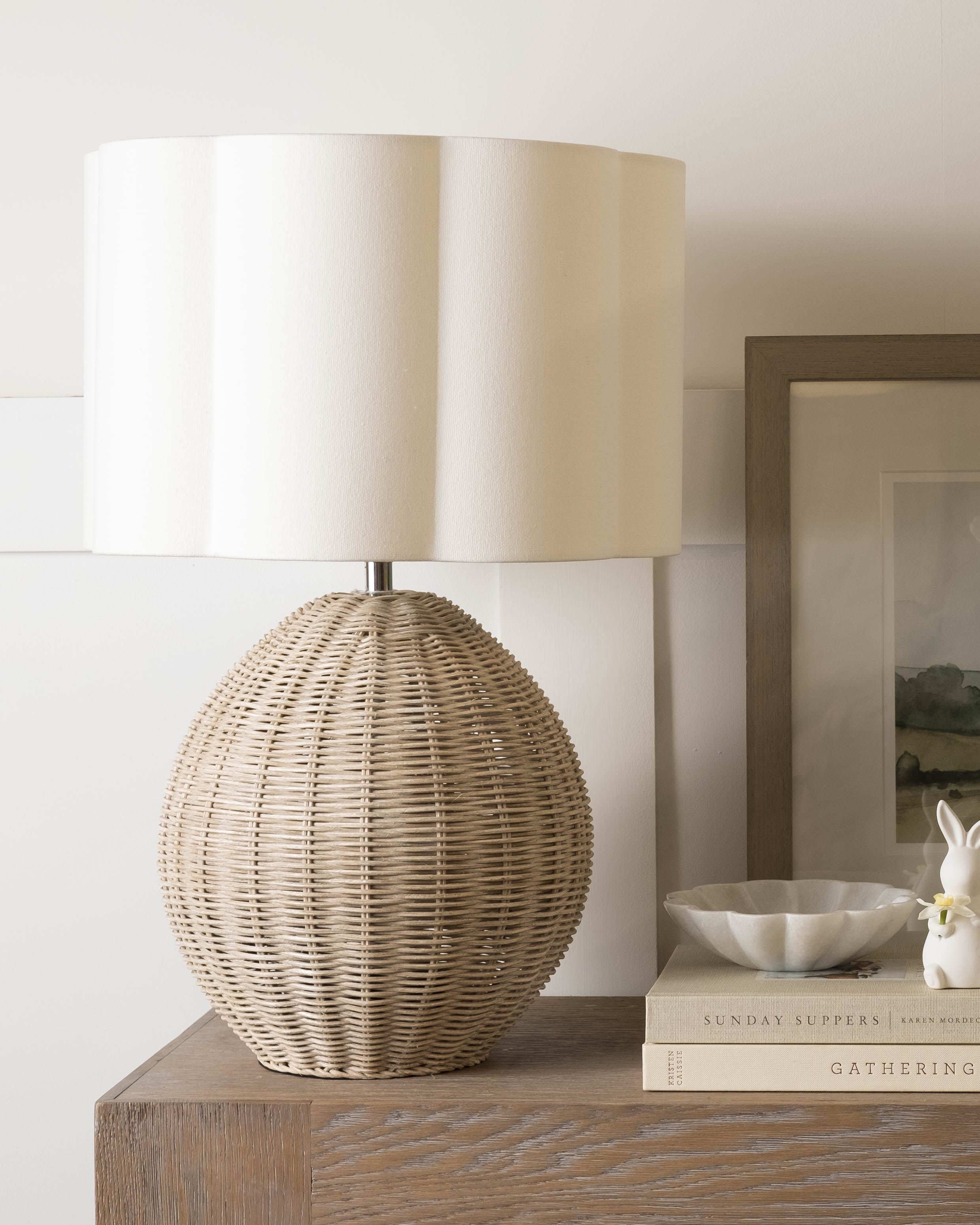 A Hudson Home Bestseller - stricking rattan lamp with a scalloped drum shade