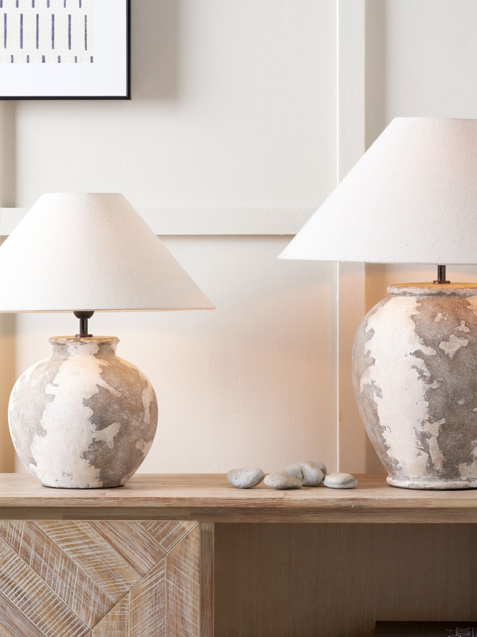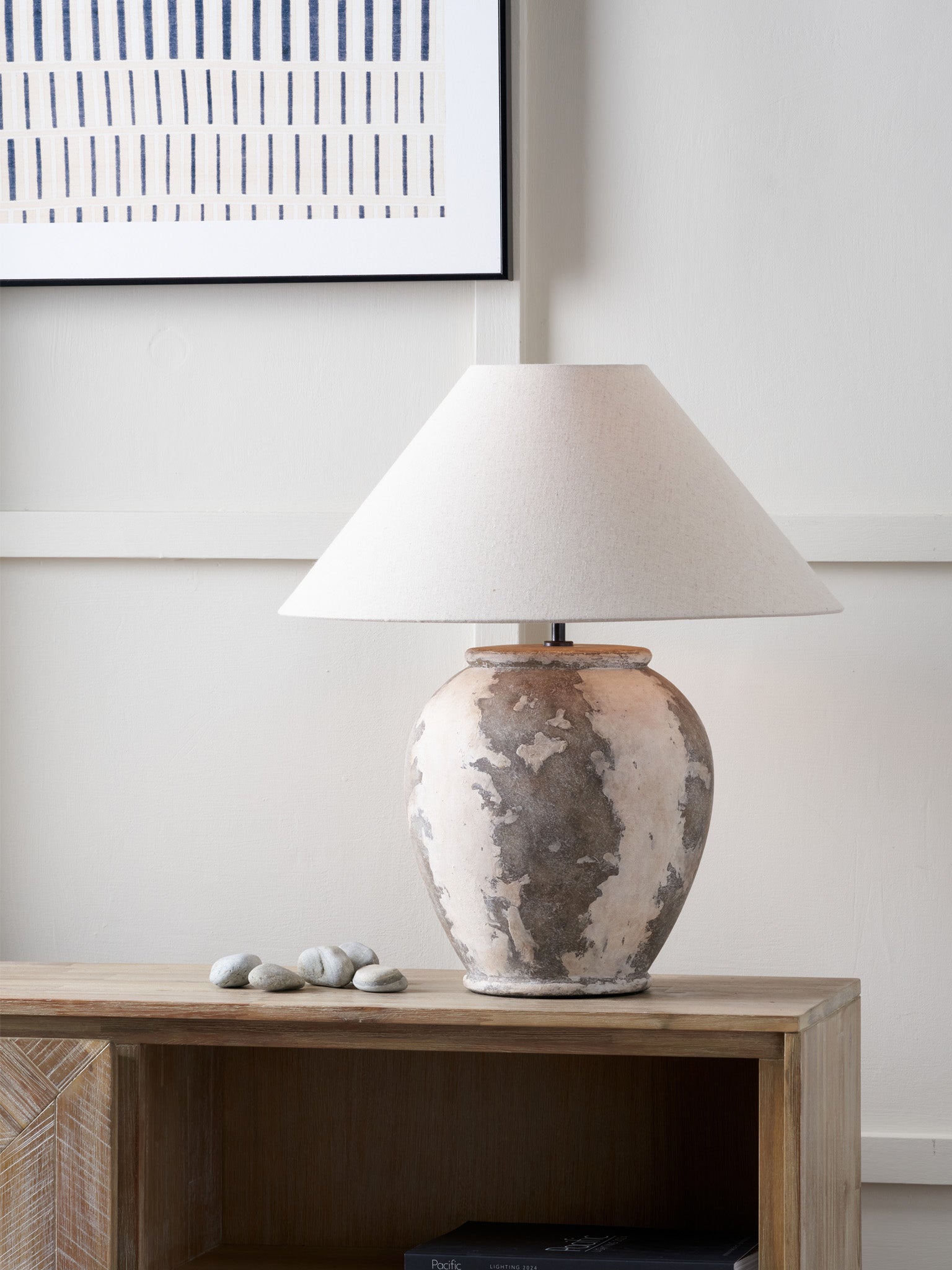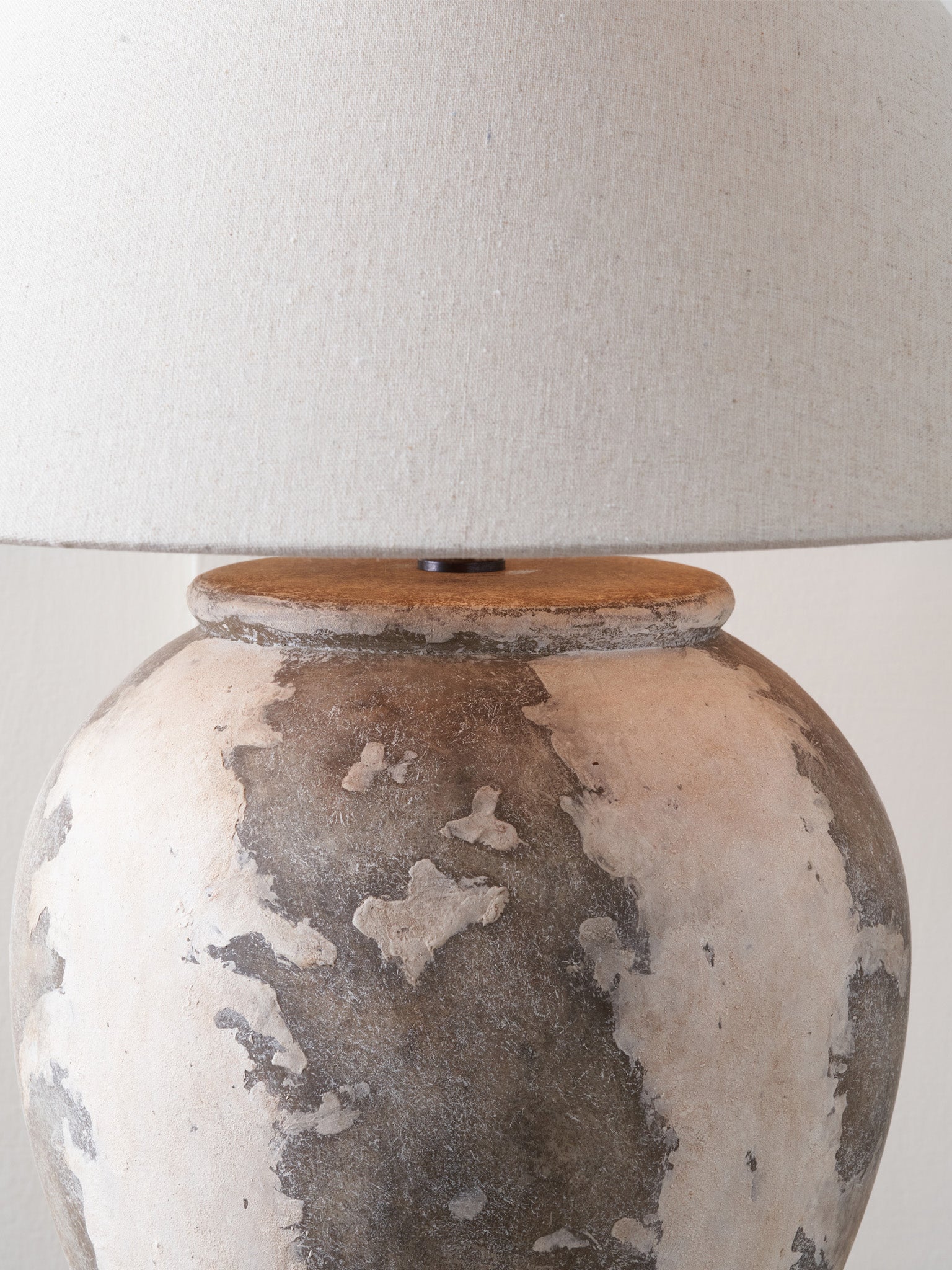 Its urn-shaped stoneware base is individually crafted, boasting a unique and abstract vintage design. With neutral cream and warm brown tones, this versatile and stylish lamp is the perfect addition to any interior.