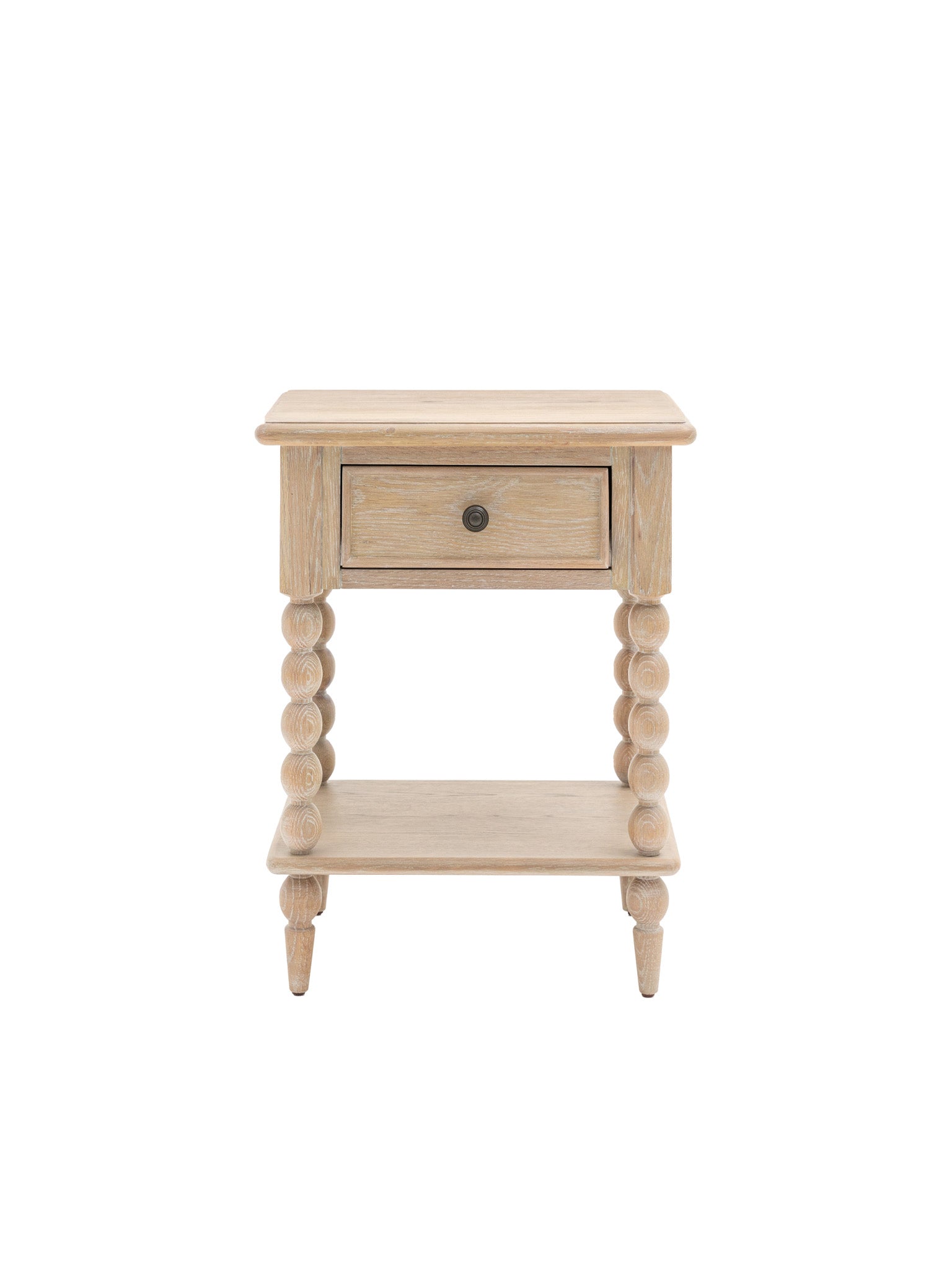 This one-drawer Amelia bedside table blends fine craftsmanship with practical design in a compact form. Crafted from solid oak with a gentle lime-wash finish, it showcases detailed hand-turned bobbin accents for a refined, natural aesthetic. With its functional drawer, it offers both elegance and versatility for any bedroom setting.