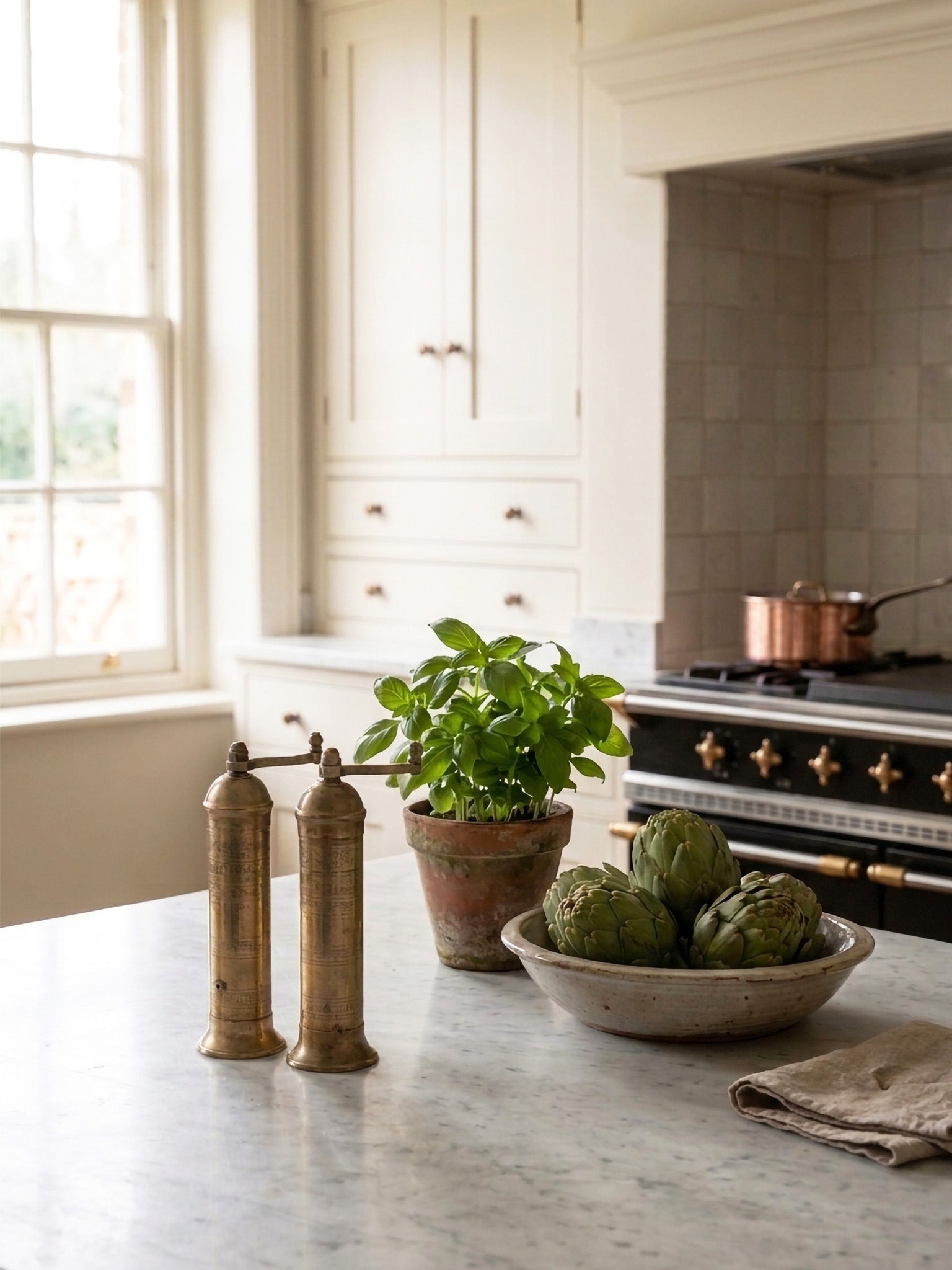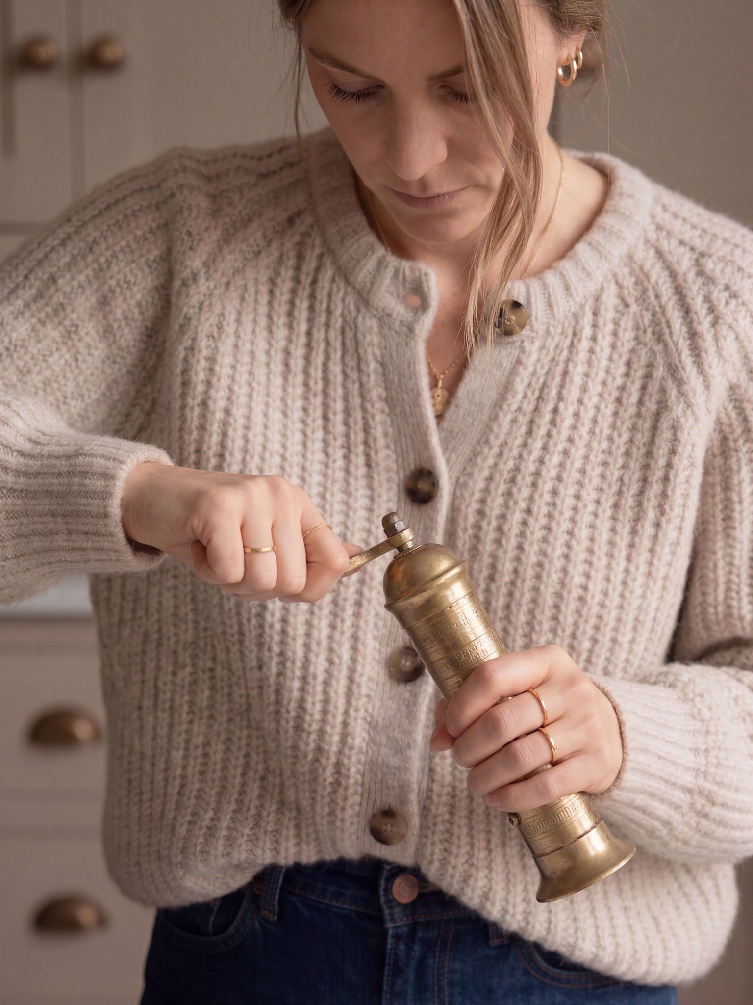 Brass salt and pepper mill in kitchen