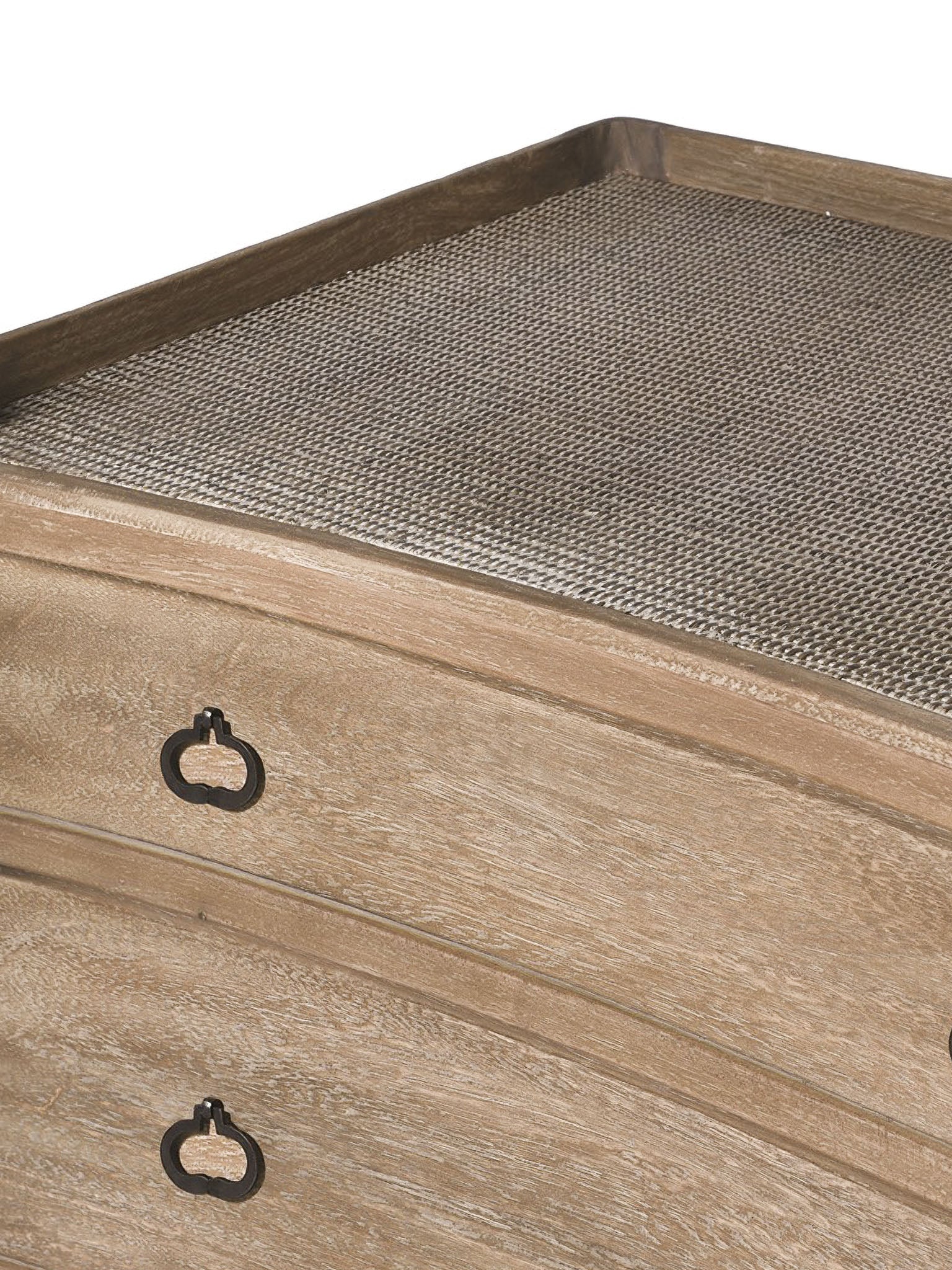 The Fowley Bedside Table offers timeless charm with its white wash wood and rattan top construction. Enclosed by 3 drawers and black metal handles, you'll have plenty of space to store all of your bedroom essentials.
