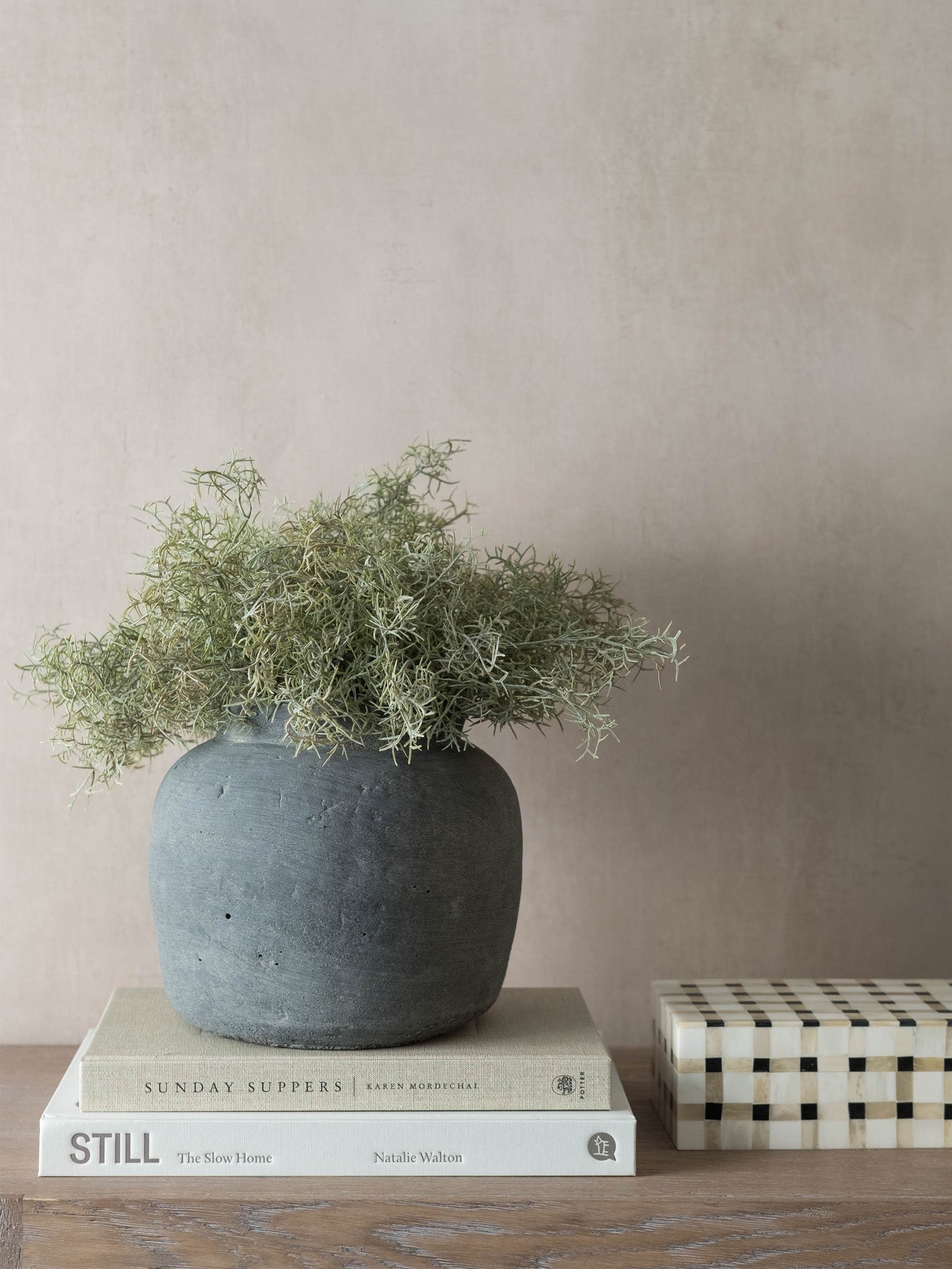 This stunning Jinxia Vase is handmade from clay and finished with a rustic concrete look. It's perfect for adding a touch of life and warmth to your home, and is a beautiful contrast to traditional ceramic and porcelain items.