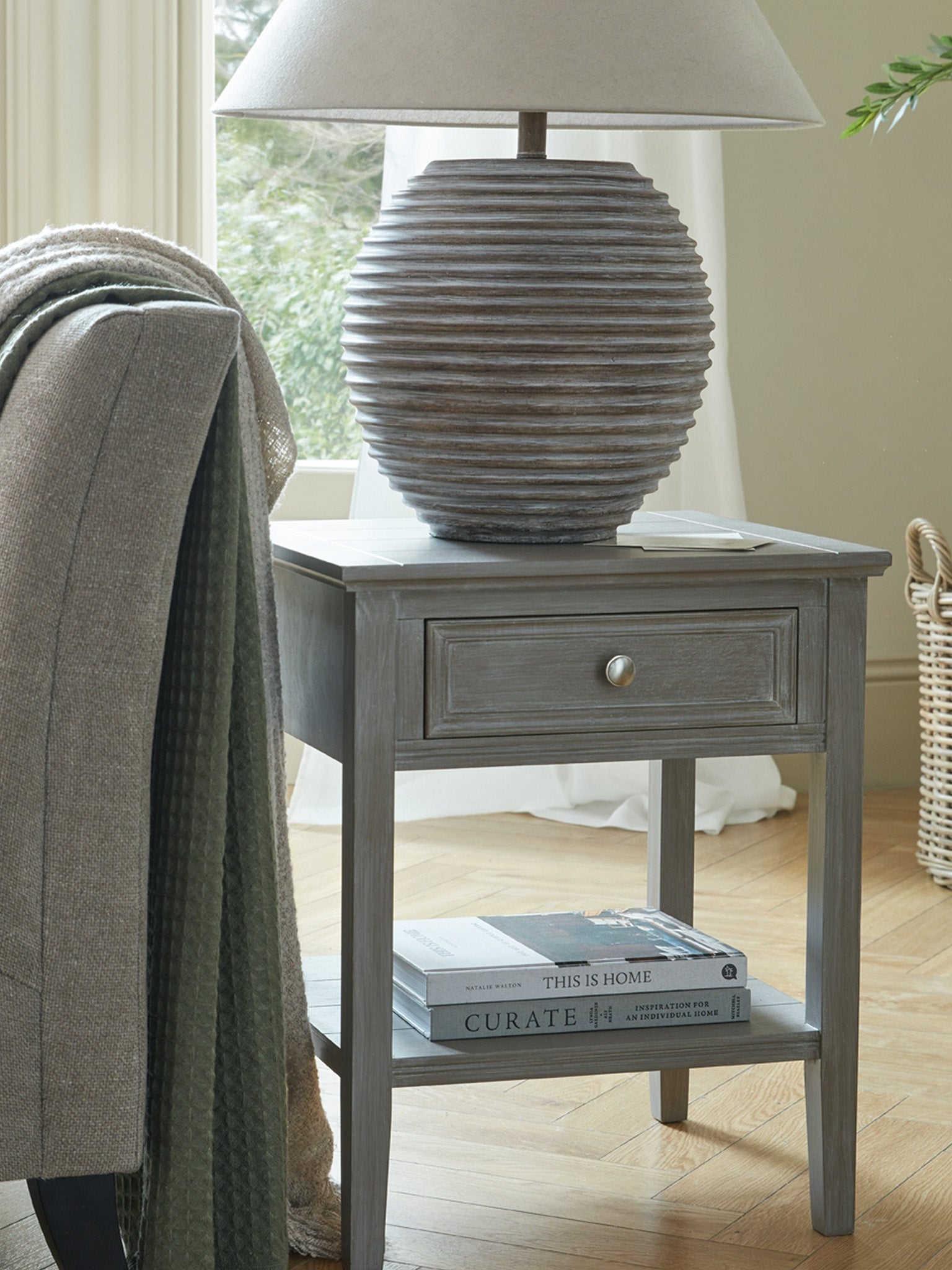 A transitional piece with a bold and textural base, this ceramic carved table lamp features an elegant empire cream linen shade. The carefully crafted design adds a touch of sophistication to any room.