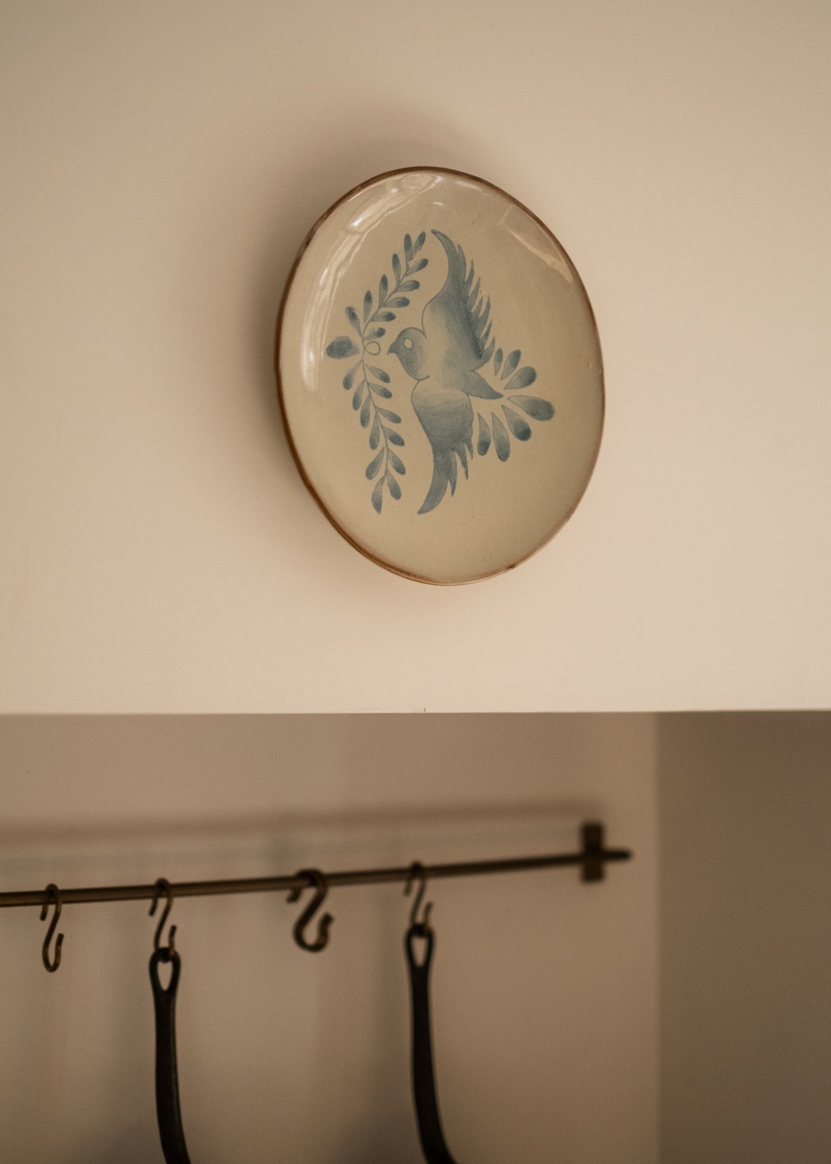 Charming ceramic plate, featuring a striking hand-painted blue songbird motif. The cream base is beautifully framed by warm brown edges, creating a sophisticated colour palette that complements any décor.