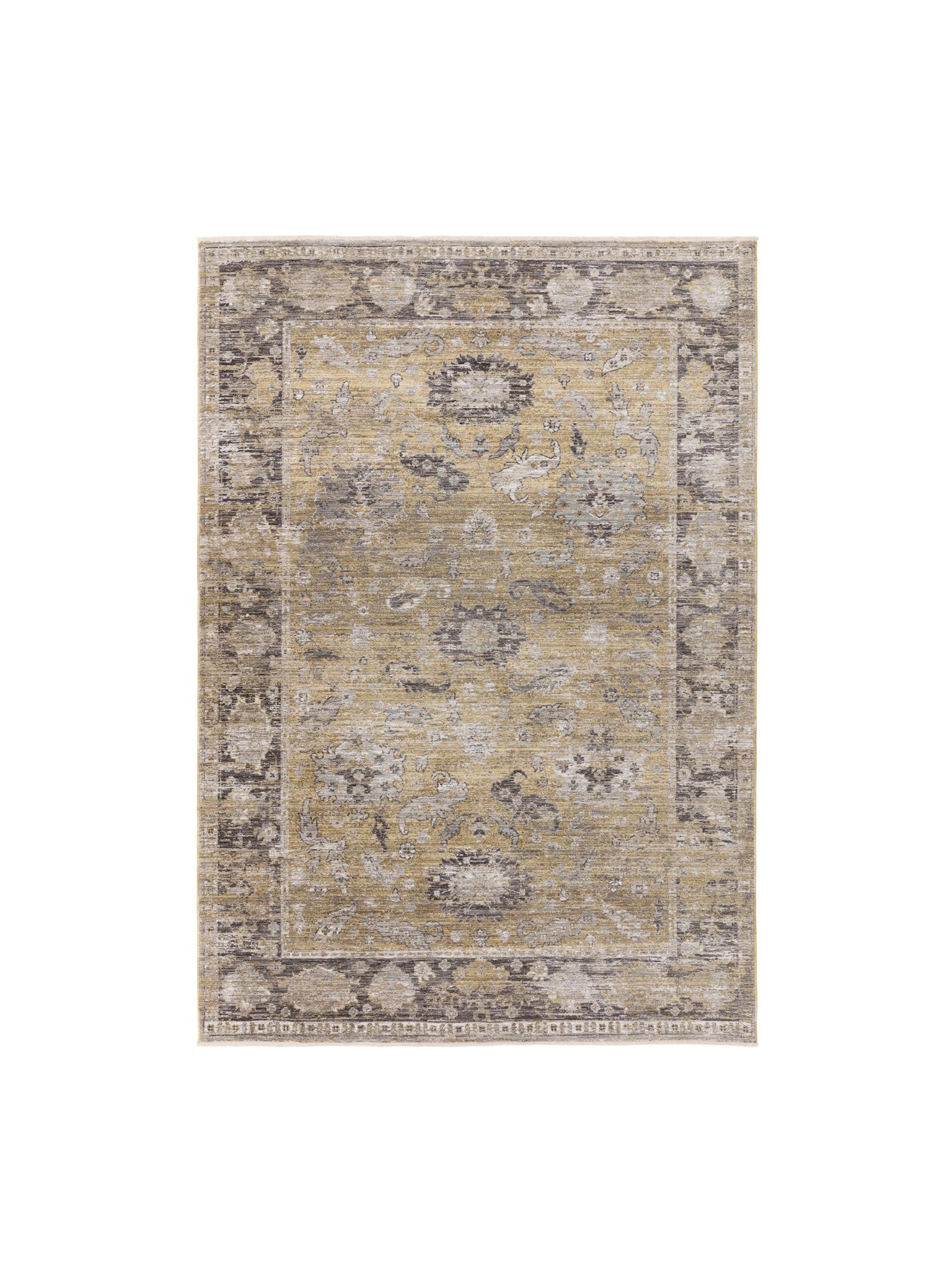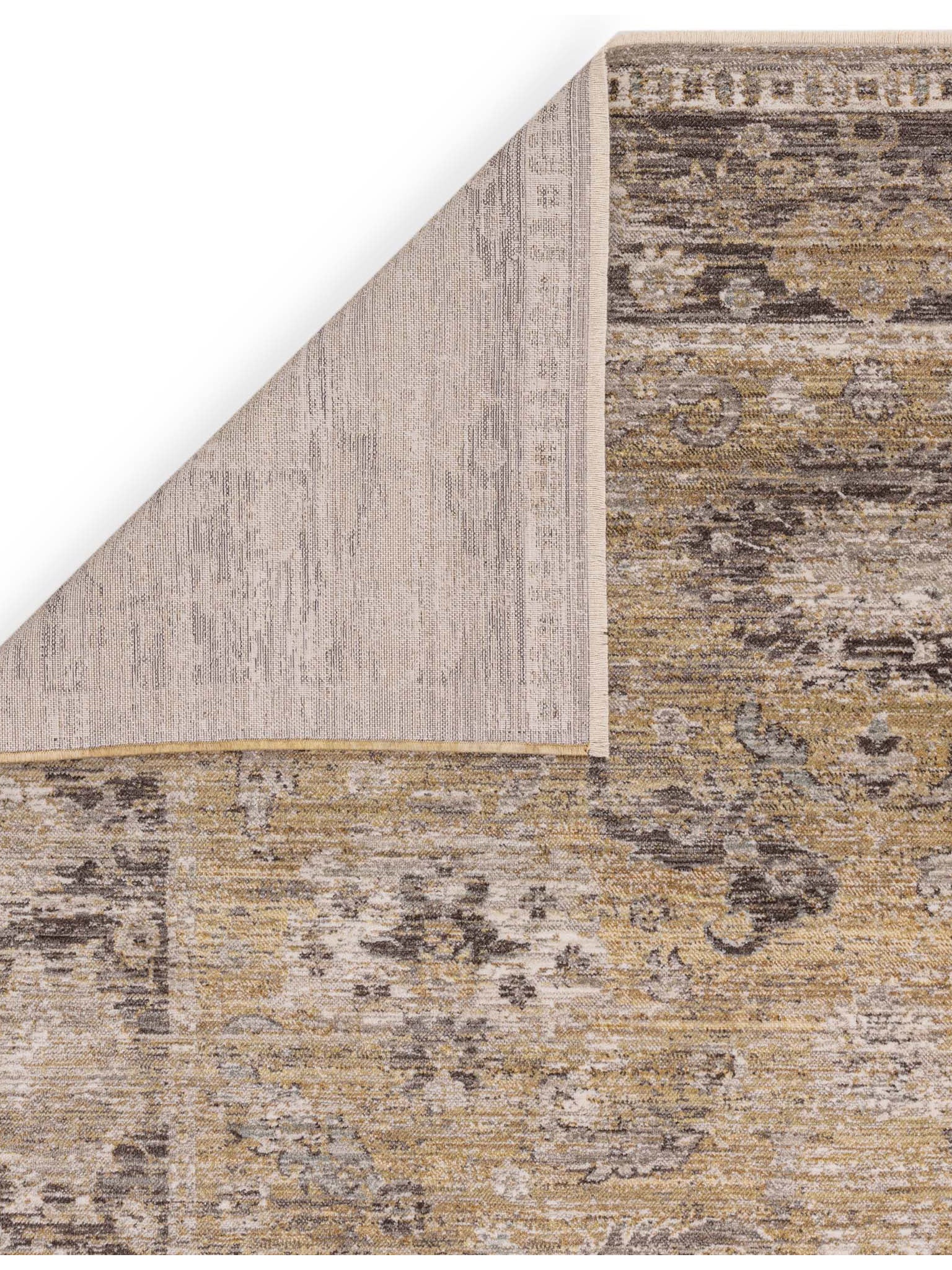 Vintage inspired synthetic rug, mustard and brown pallet and an over dyed floral pattern for a softened look.  Power loomed with high performance yarns for easy maintenance.